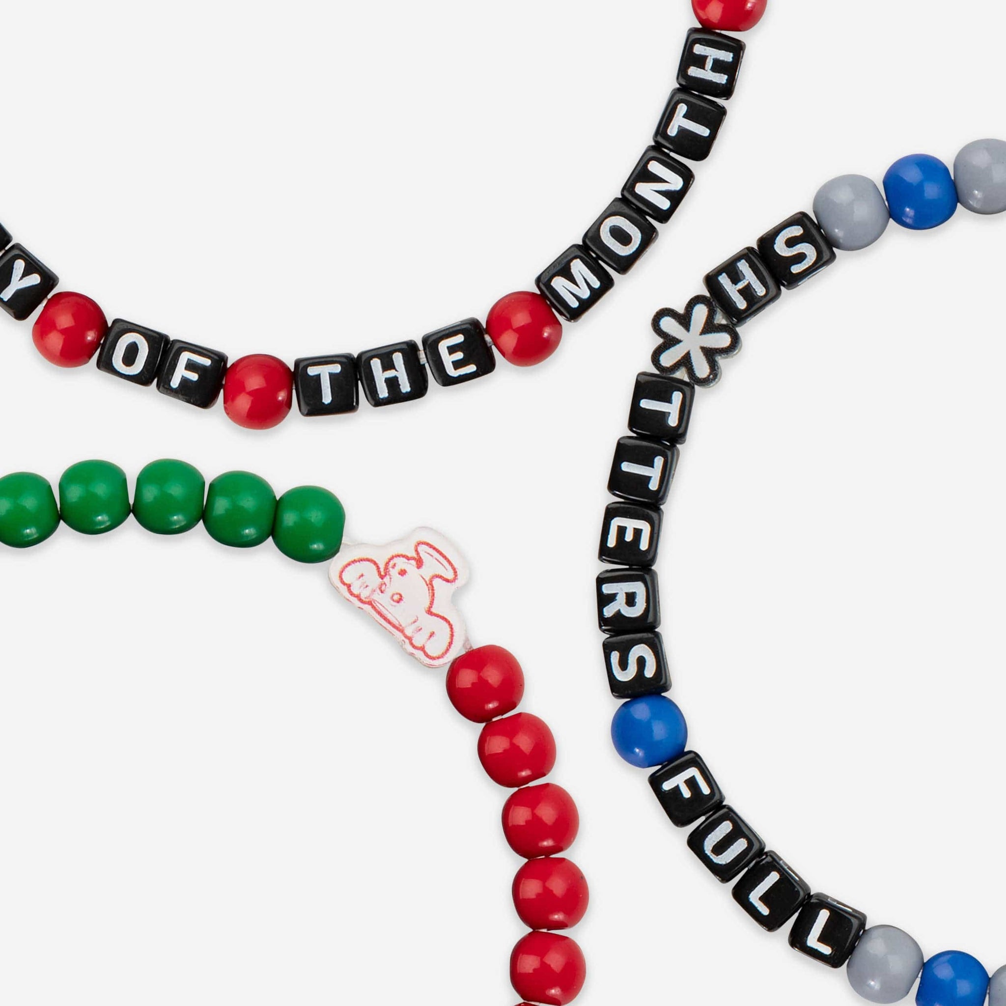 • Thematic words displayed: Letter cubes are organized on a friendship bracelet string to display words and messages that will make sure your fandom is always front and center.