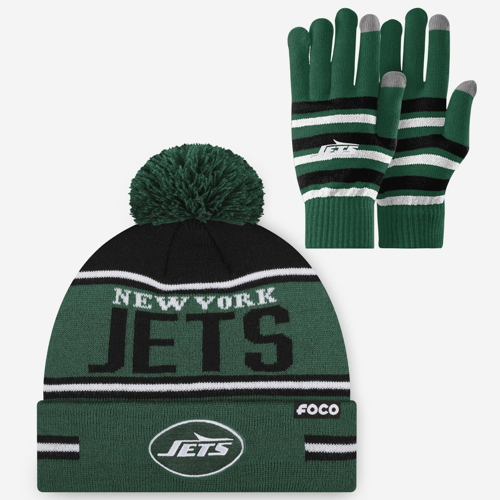 New York Jets Stretch Glove & Big Wordmark Stripe Pom Beanie Set FOCO - FOCO.com