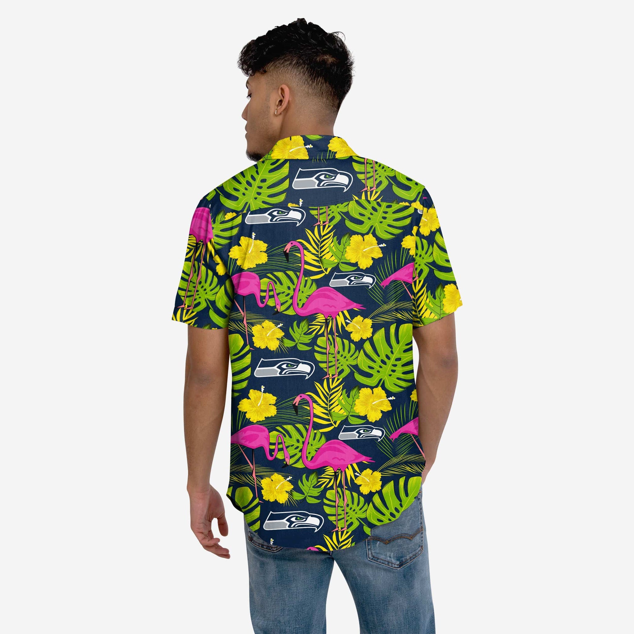 - All-over team-colored design with neon yellow flower and pink flamingo accents for maximum tropical team spirit