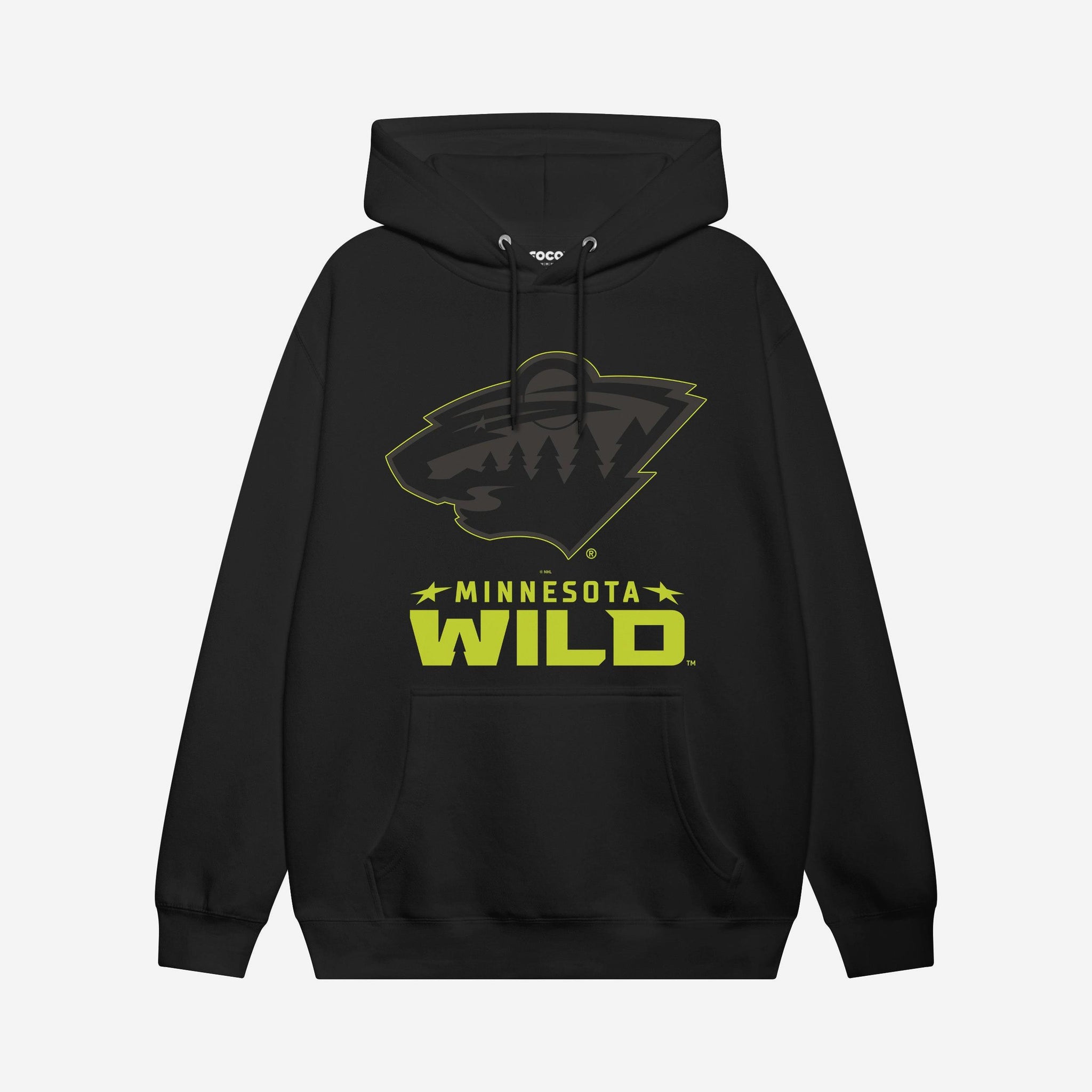 - Team logo display with highlight outline: The front of this apparel features a black Minnesota Wild team logo display outlined in neon, and a neon team name display