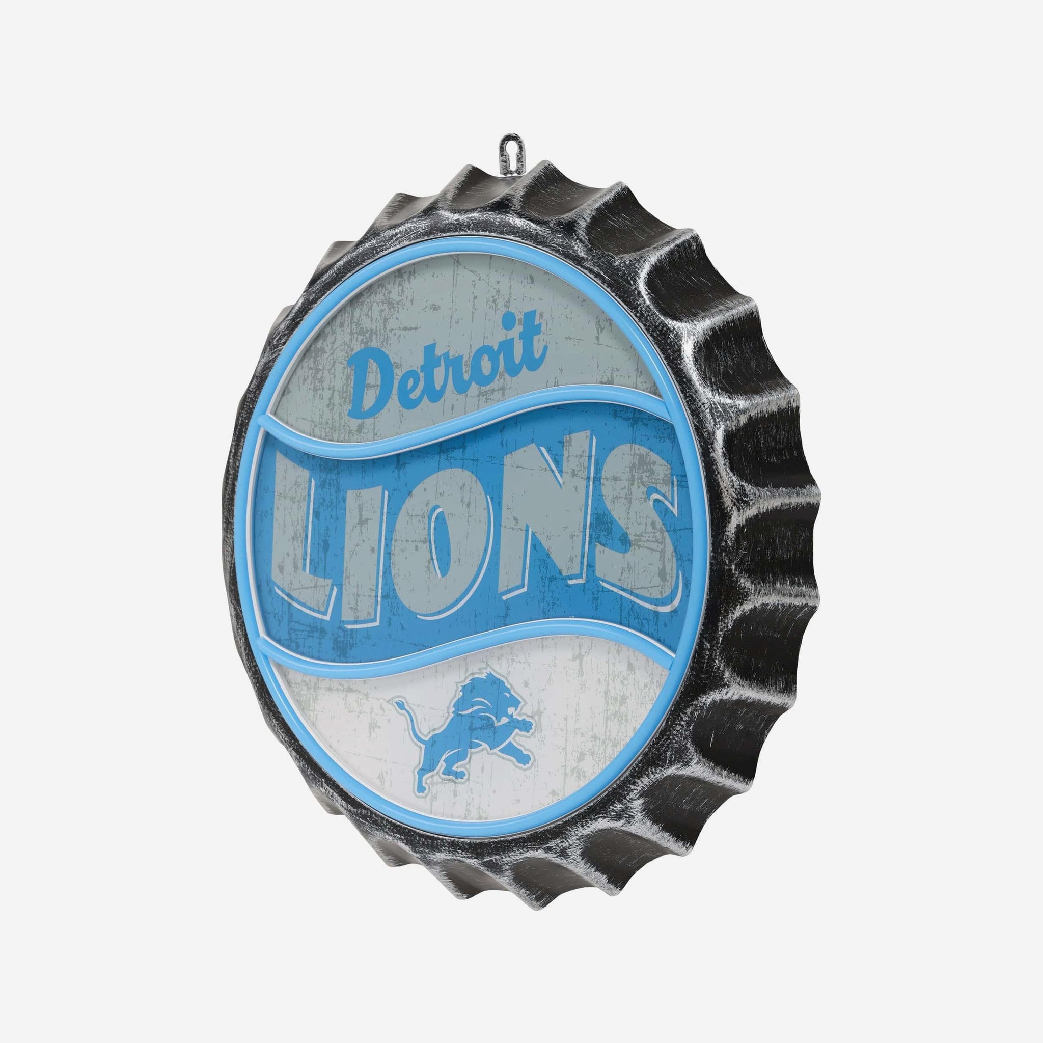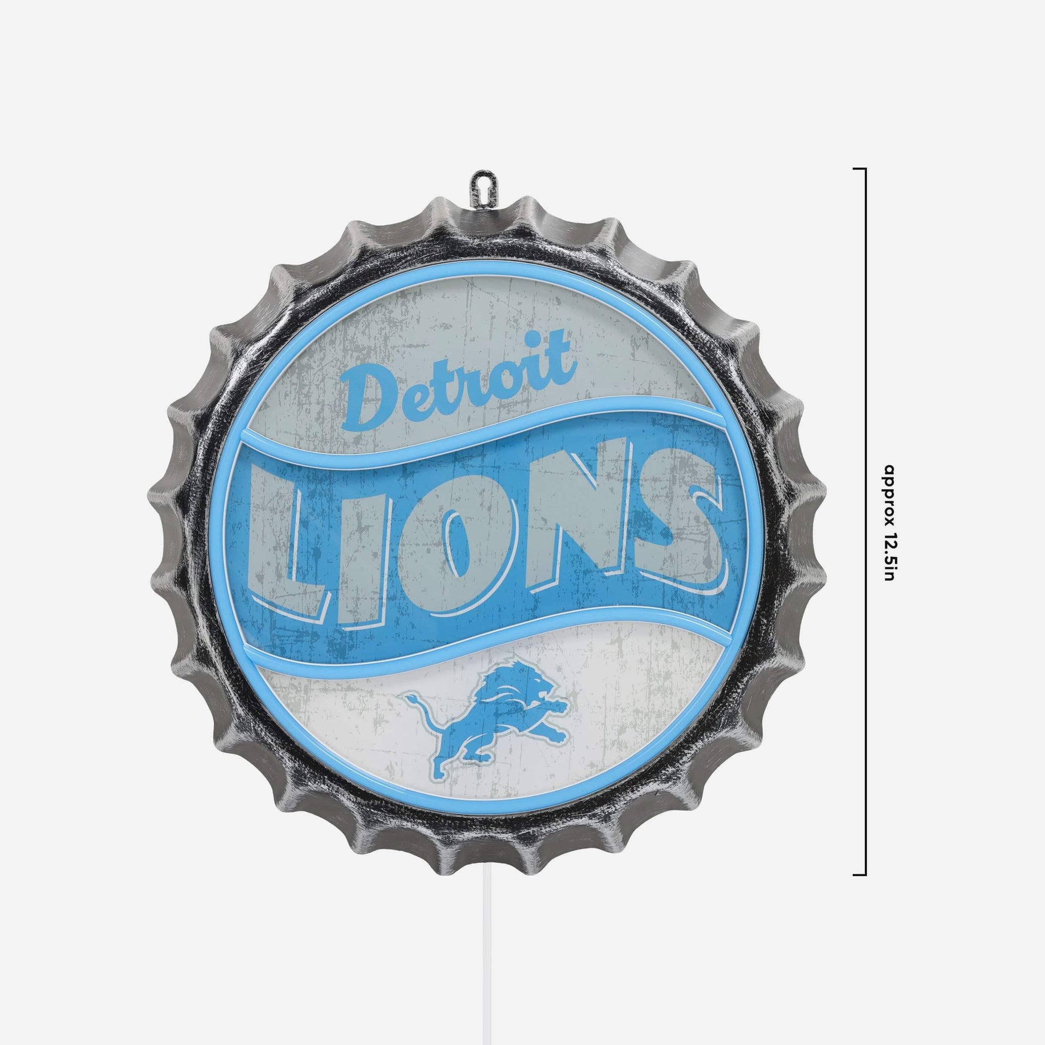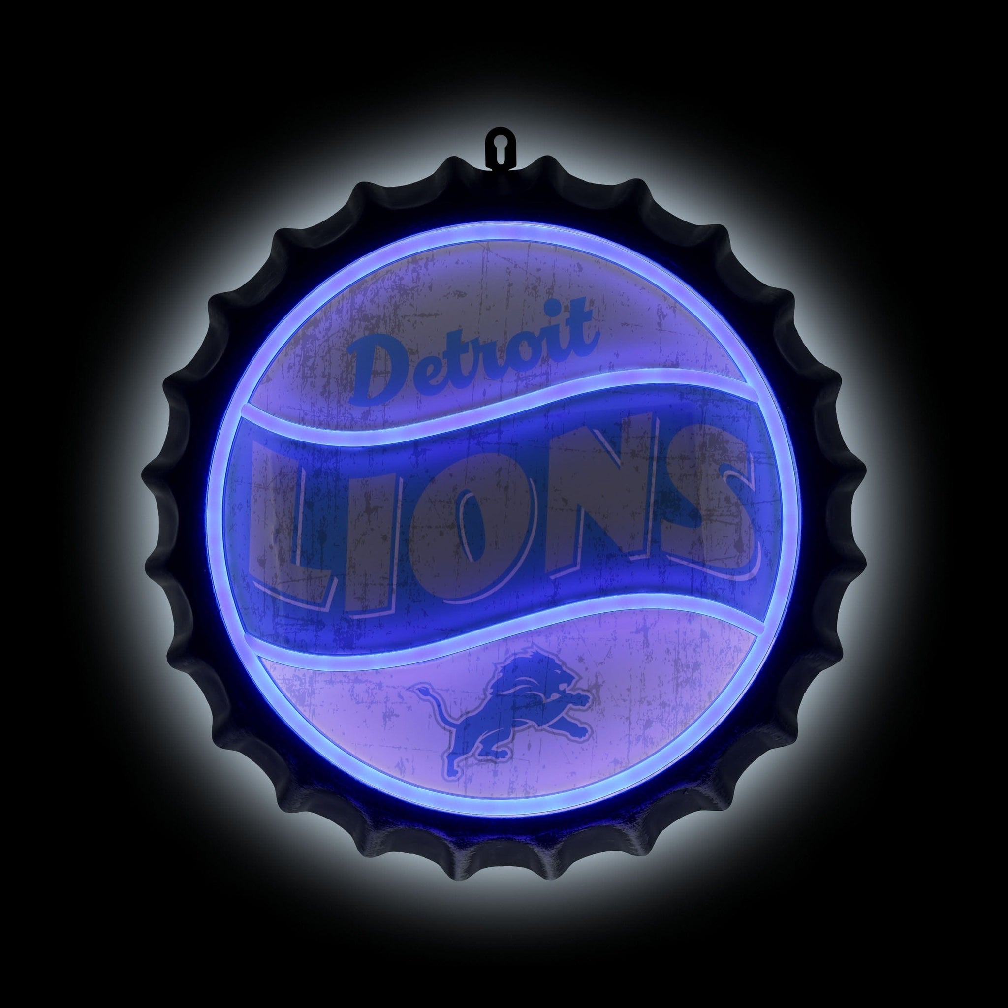 Light up your fancave in team-ready style! Put your pride on full display with this Detroit Lions Neon Backlit Bottle Cap Wall Sign, featuring bold graphics in a classic bottle cap design.