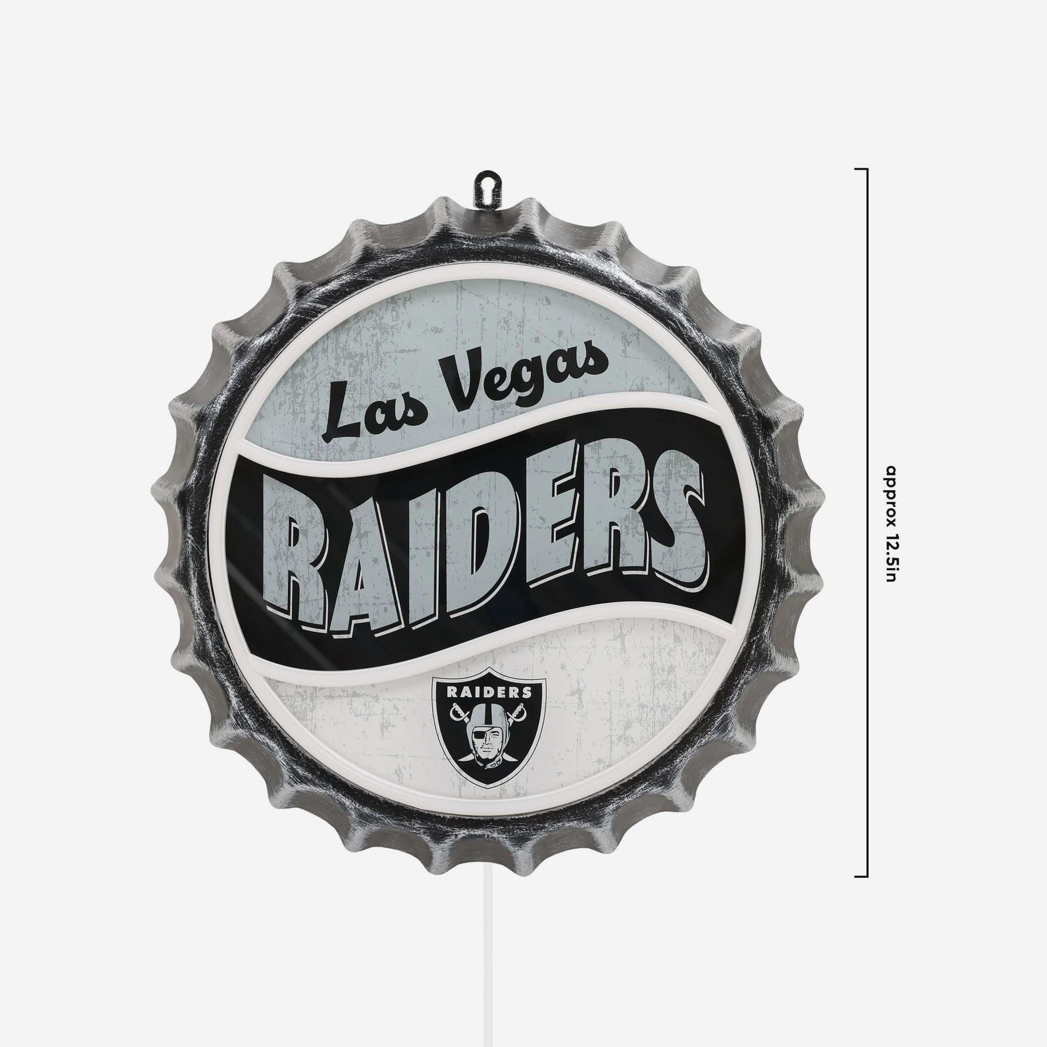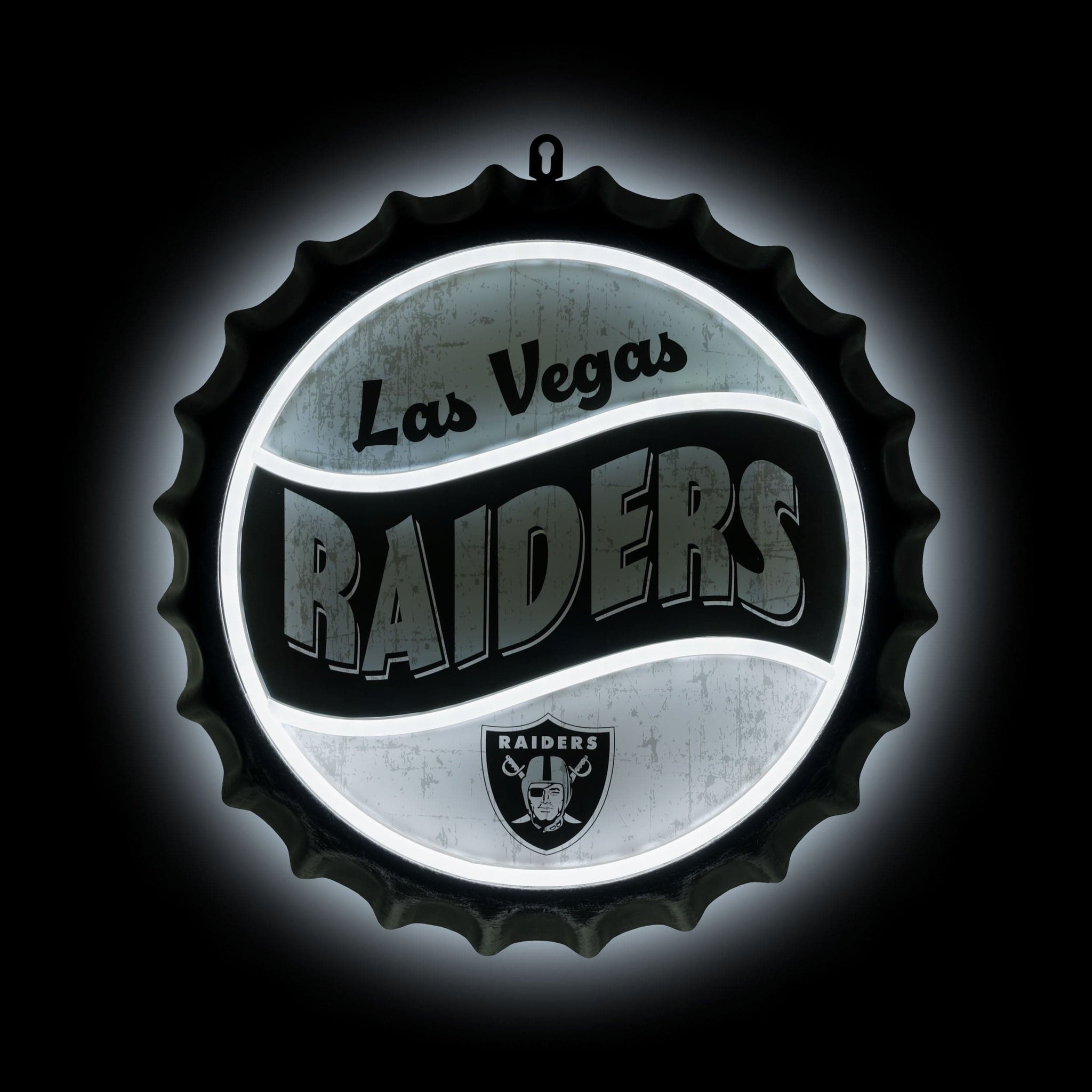 Light up your fancave in team-ready style! Put your pride on full display with this Las Vegas Raiders Neon Backlit Bottle Cap Wall Sign, featuring bold graphics in a classic bottle cap design.