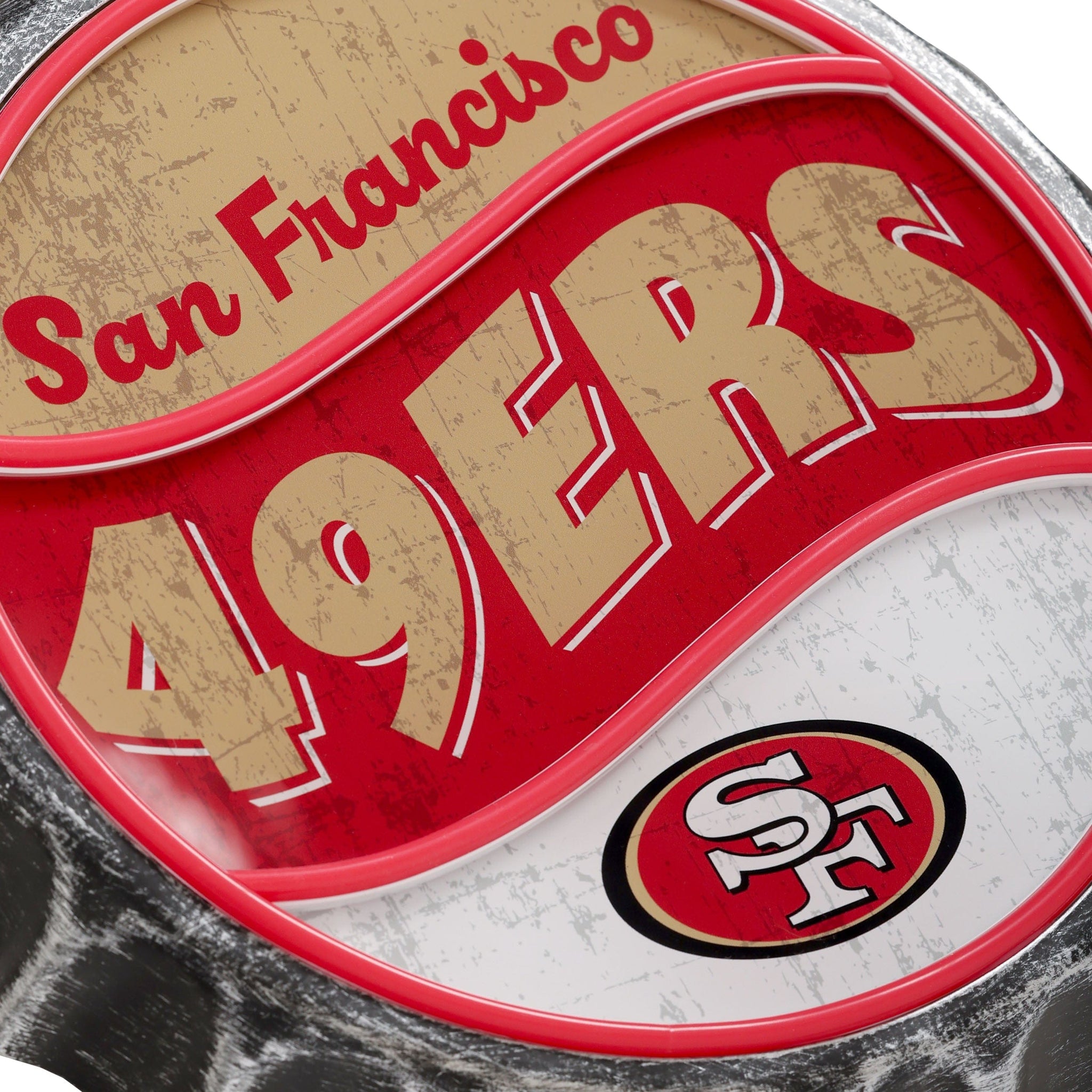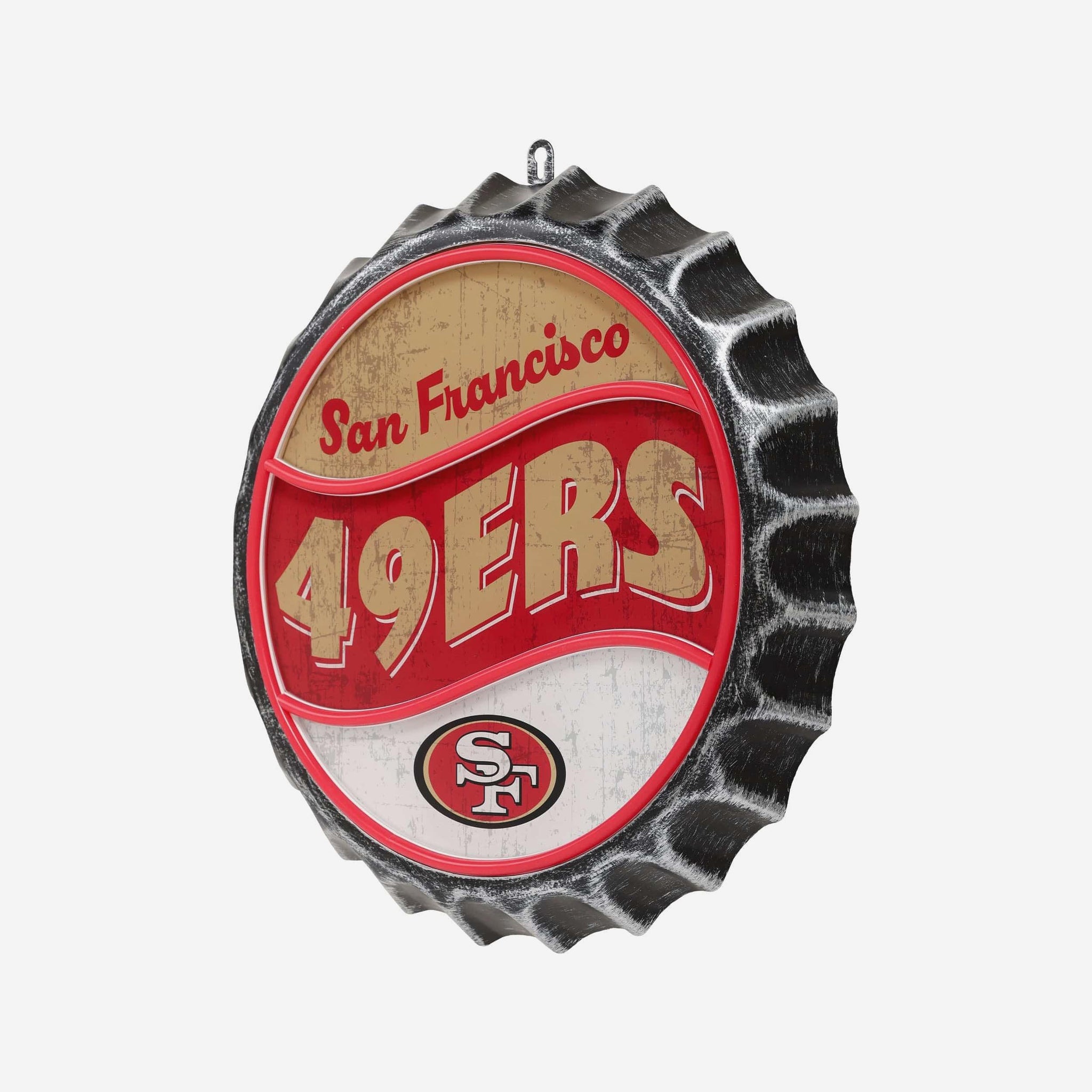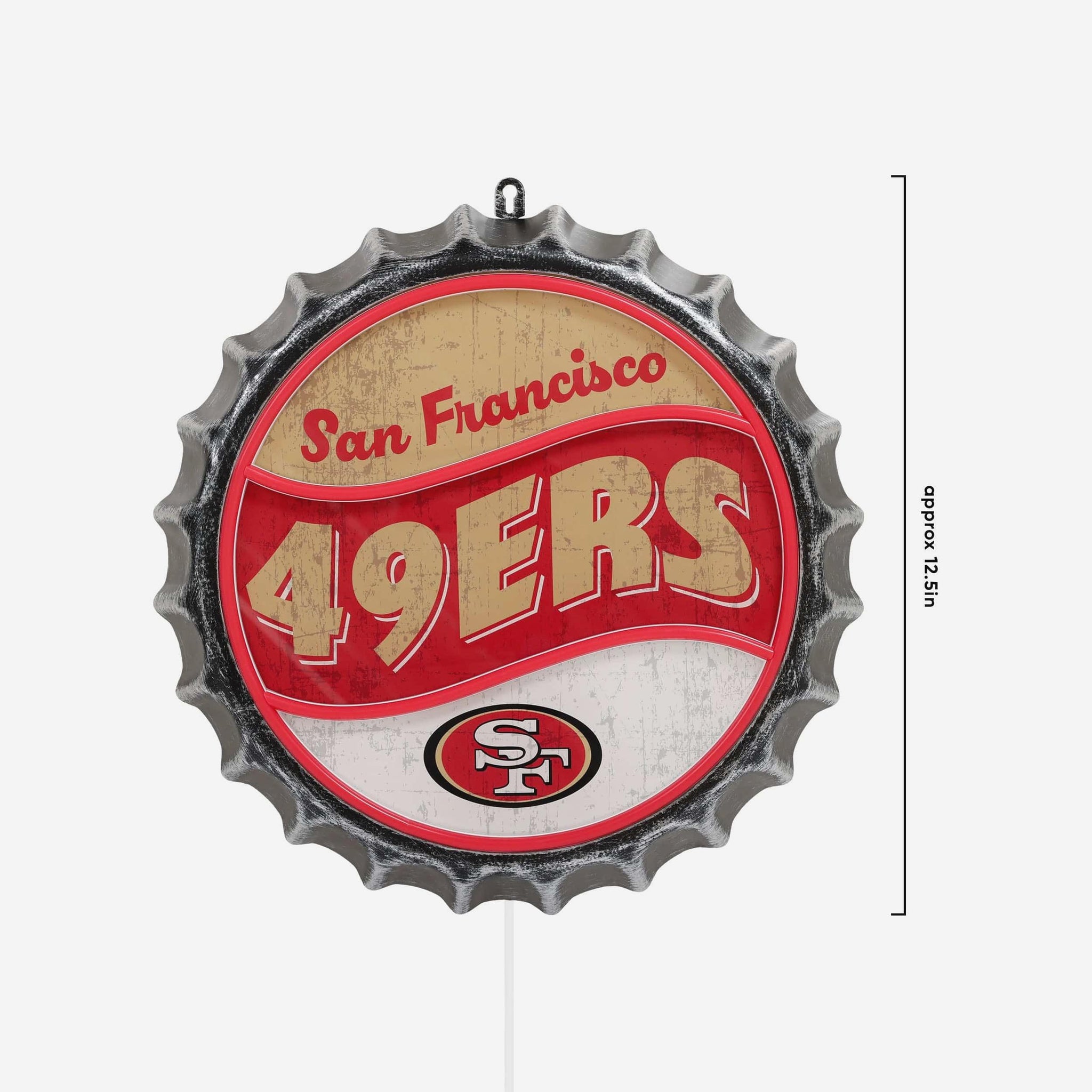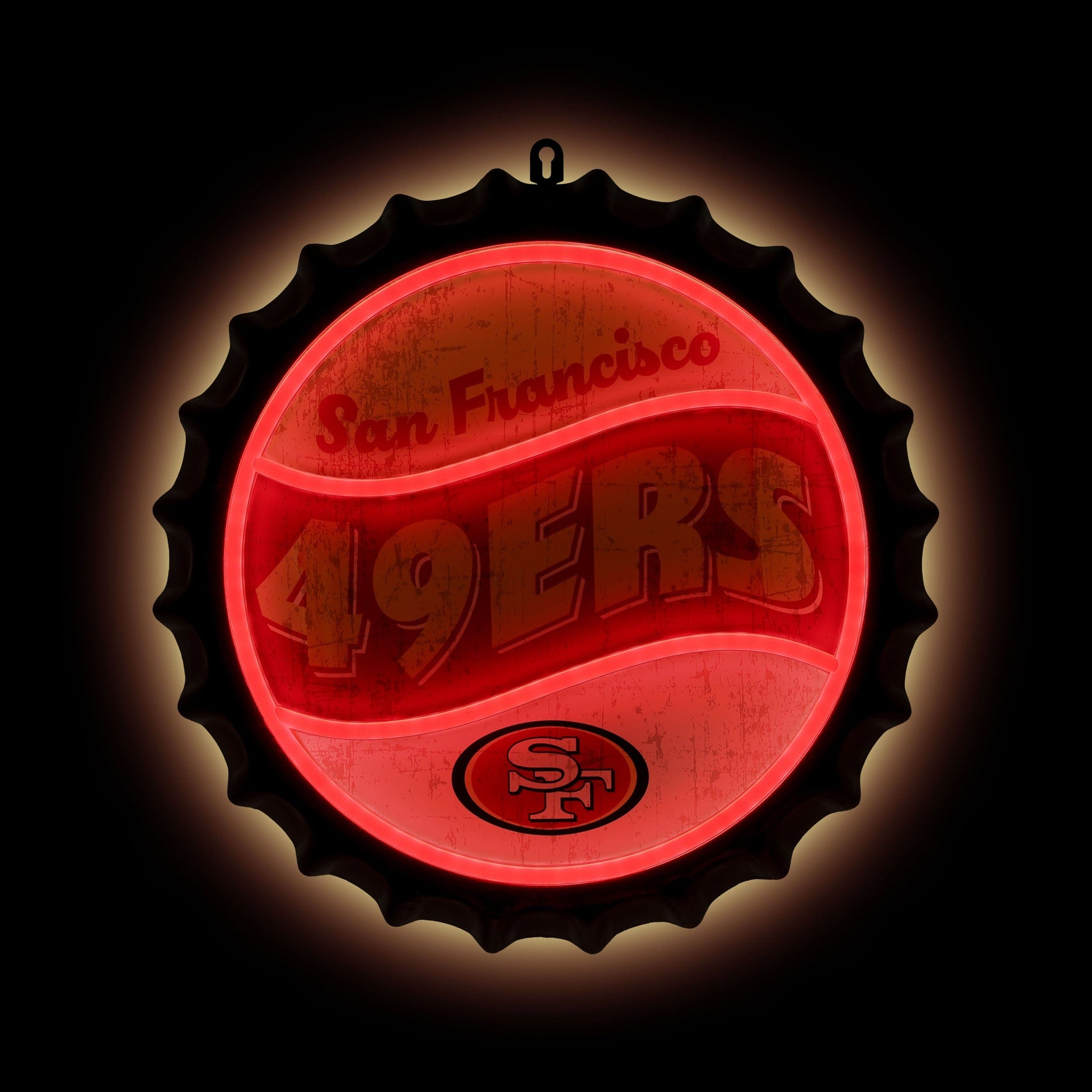 Light up your fancave in team-ready style! Put your pride on full display with this San Francisco 49ers Neon Backlit Bottle Cap Wall Sign, featuring bold graphics in a classic bottle cap design.