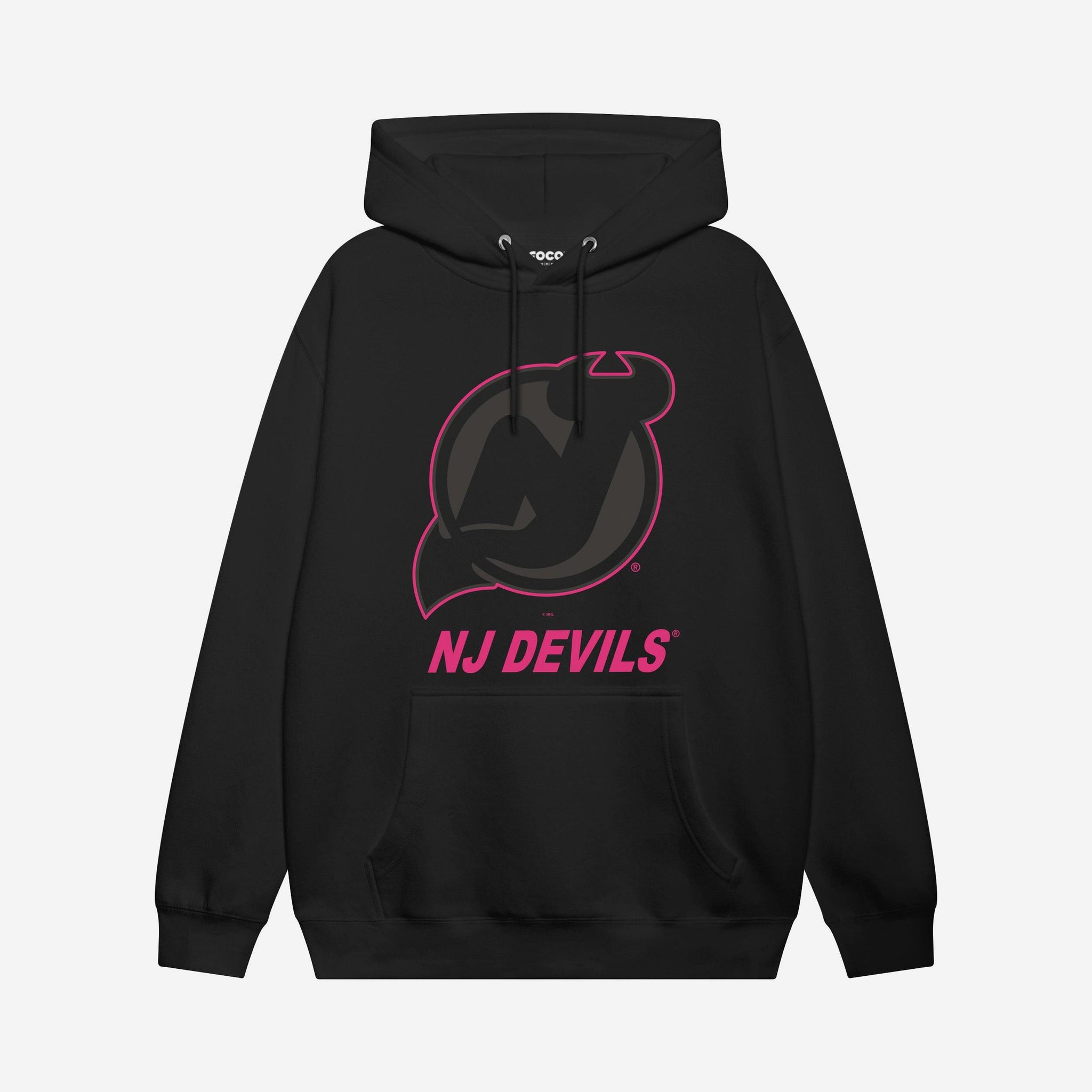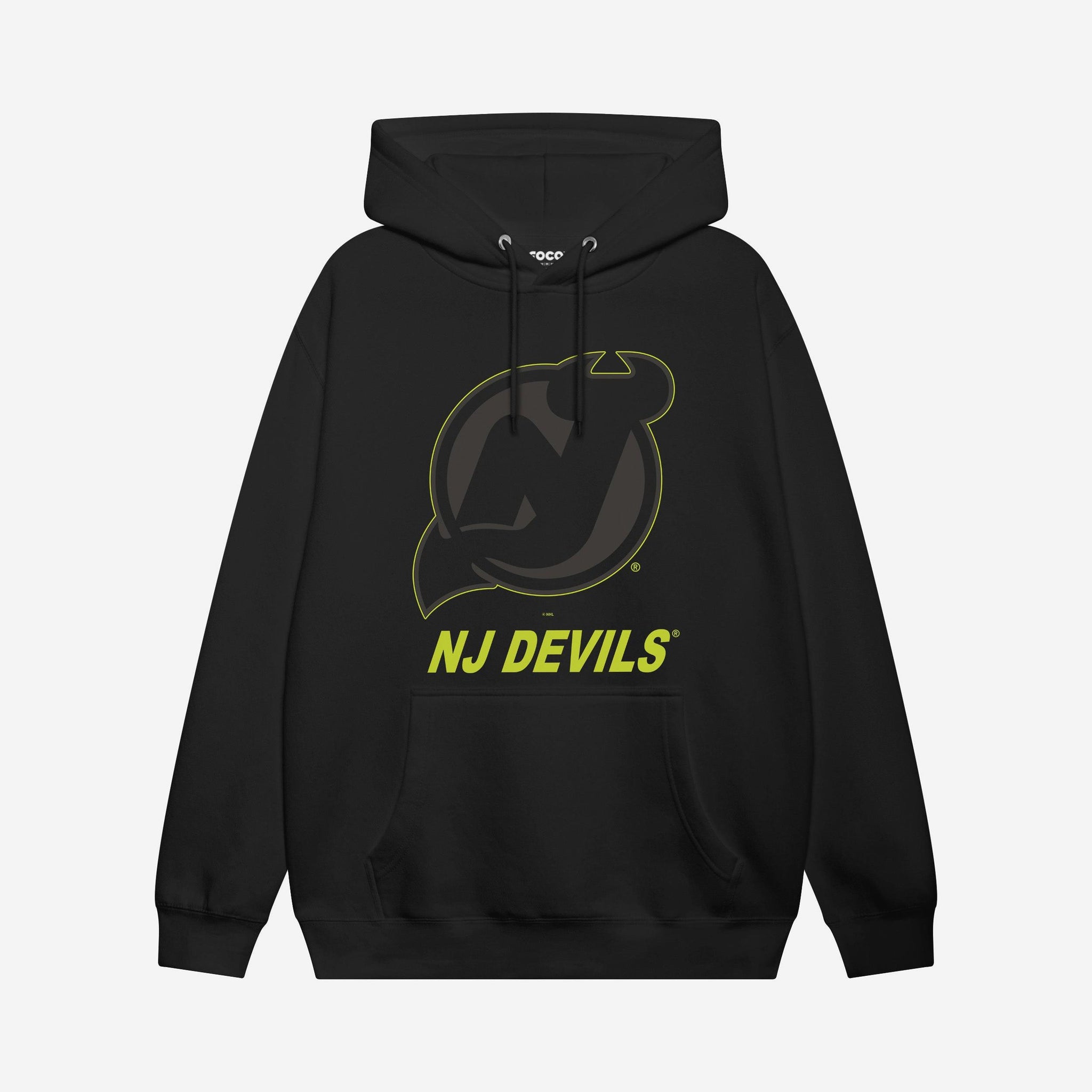 - Team logo display with highlight outline: The front of this apparel features a black New Jersey Devils team logo display outlined in neon, and a neon team name display