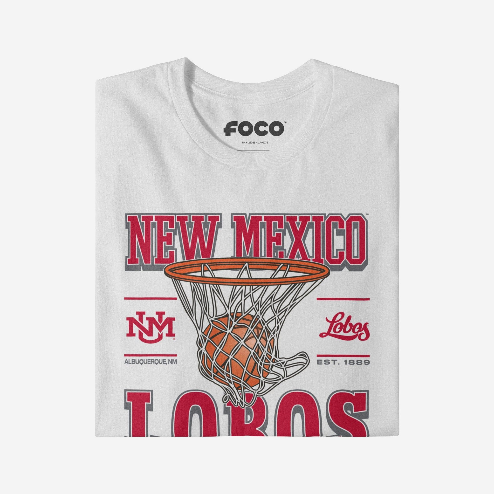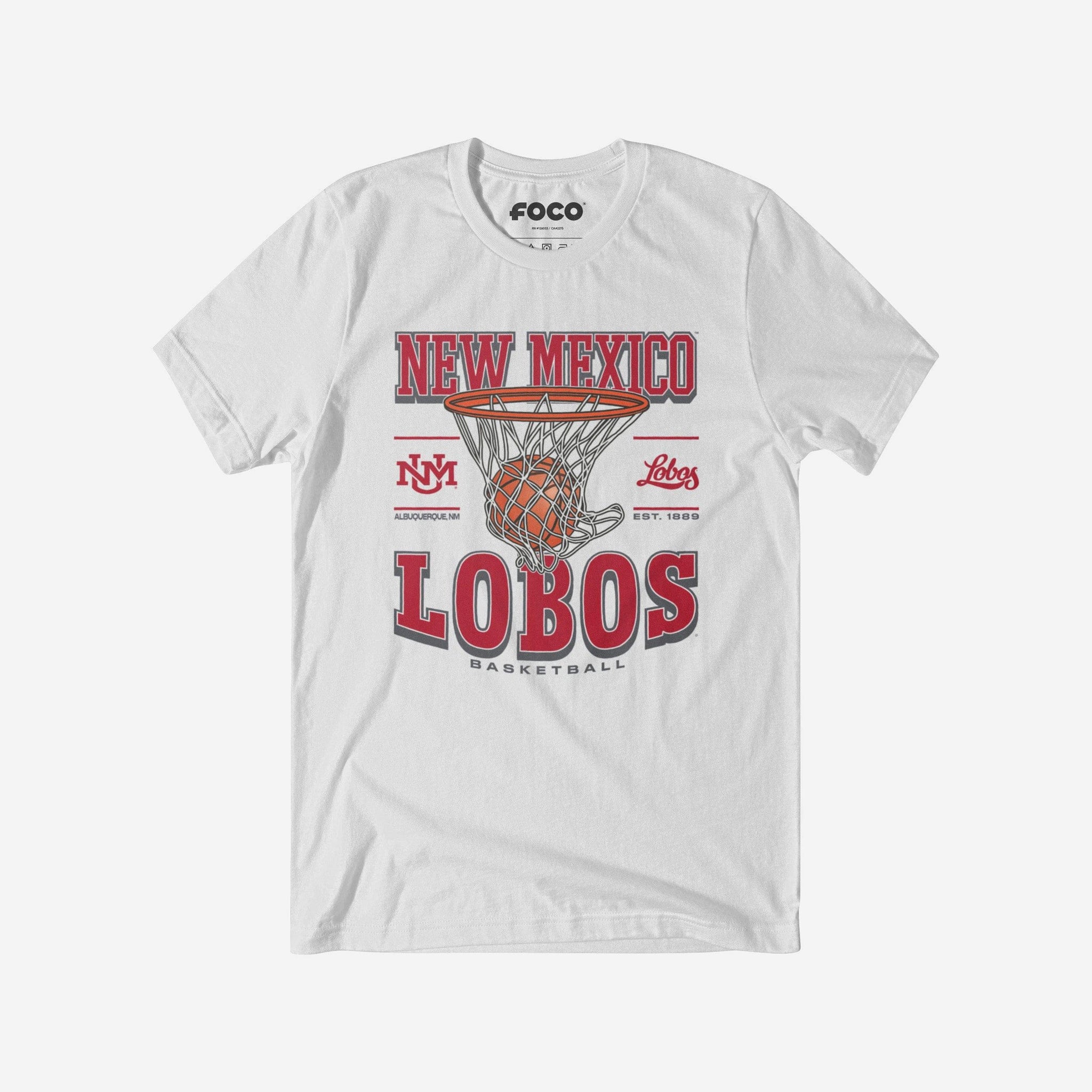 This top features a design that showcases your all-important team colors, a team logo display, a team wordmark name display, year of team establishment, and a basketball swishing through a net display meaning this t-shirt will prove your unmatched dedication to the New Mexico Lobos when you're at the game or watching at home. In other words, this graphic tee is about to be your new favorite teammate.