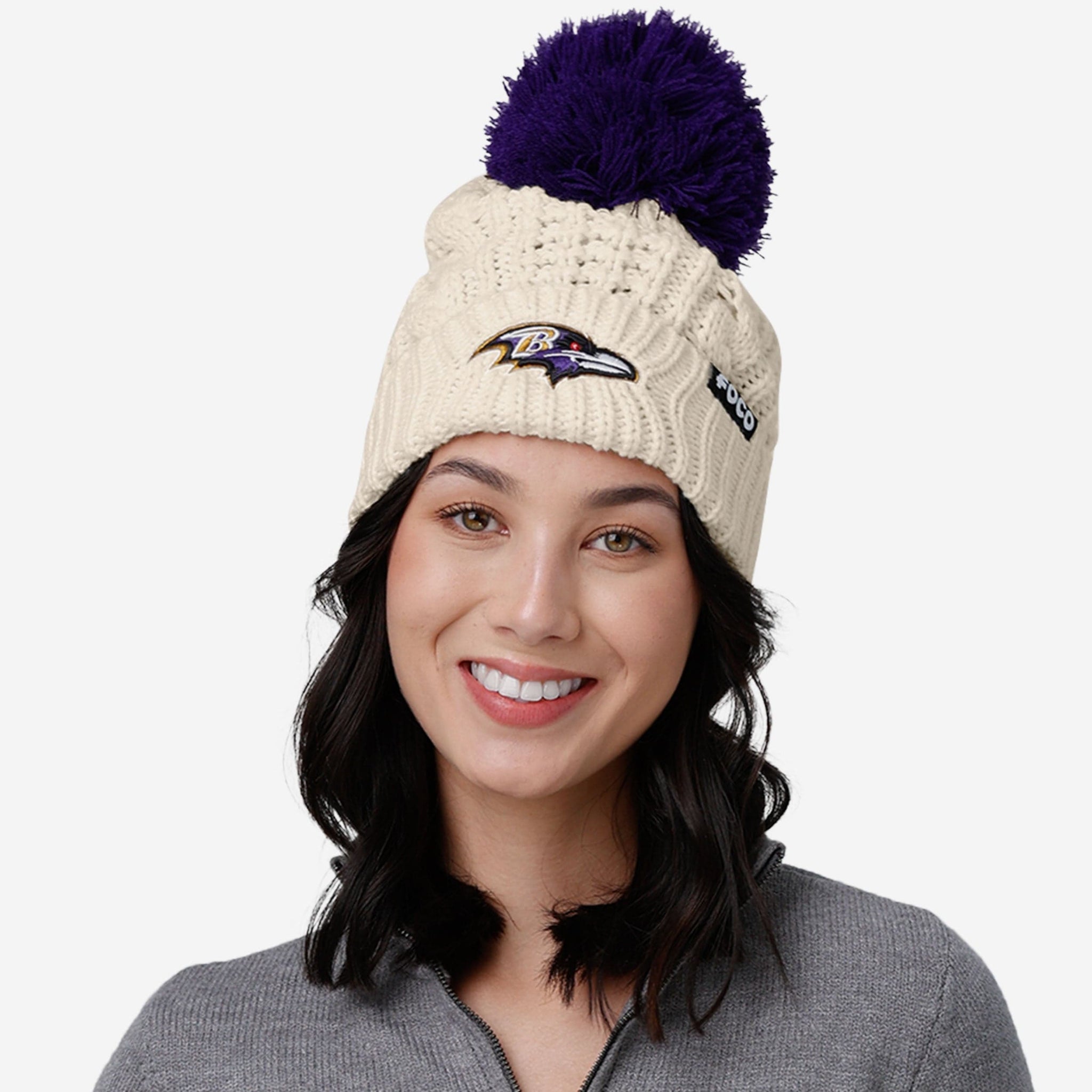 Baltimore Ravens Womens Primary Logo White Cable Knit Pom Beanie FOCO - FOCO.com