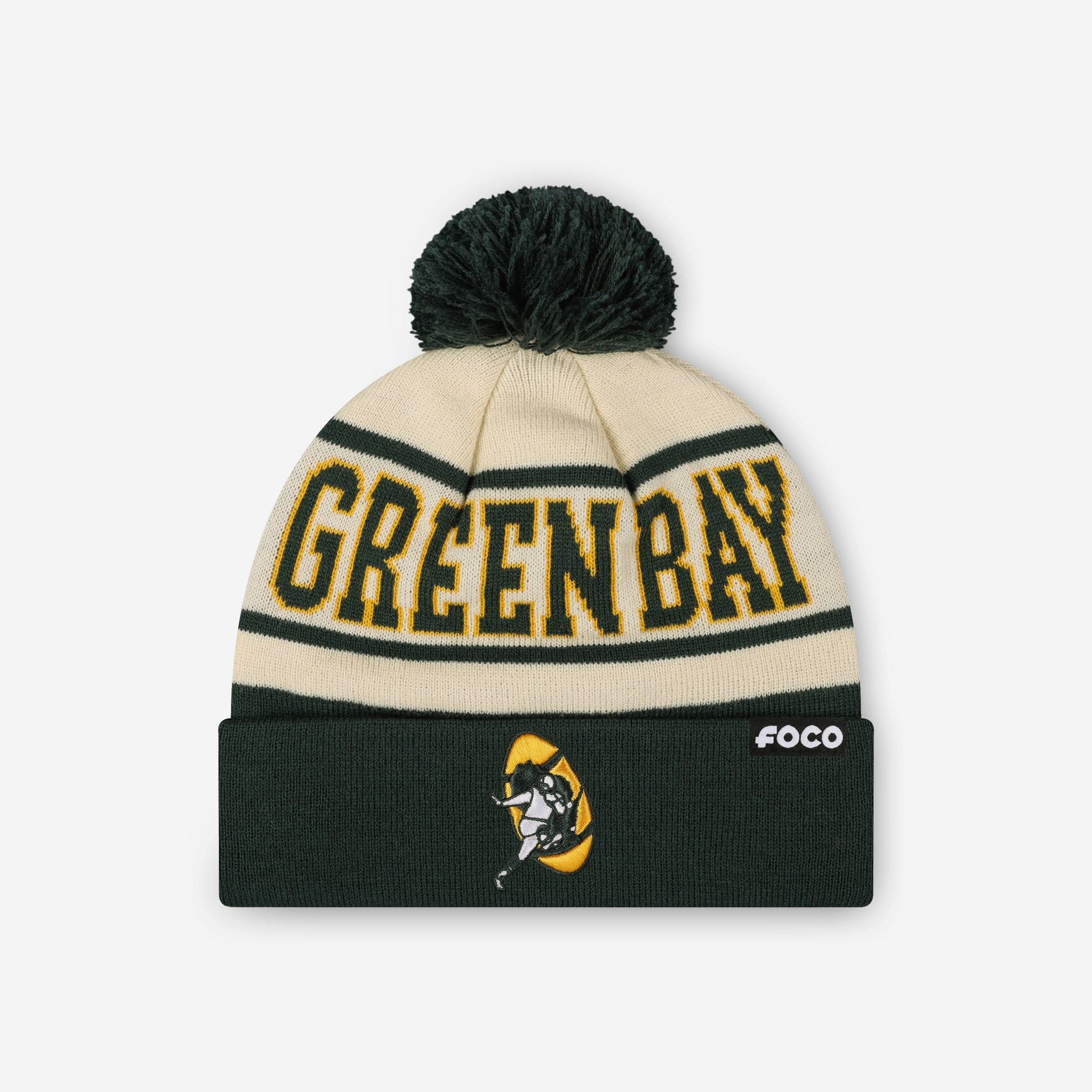 Green Bay Packers Heritage Stripe Retro Logo Pom Beanie FOCO - FOCO.com