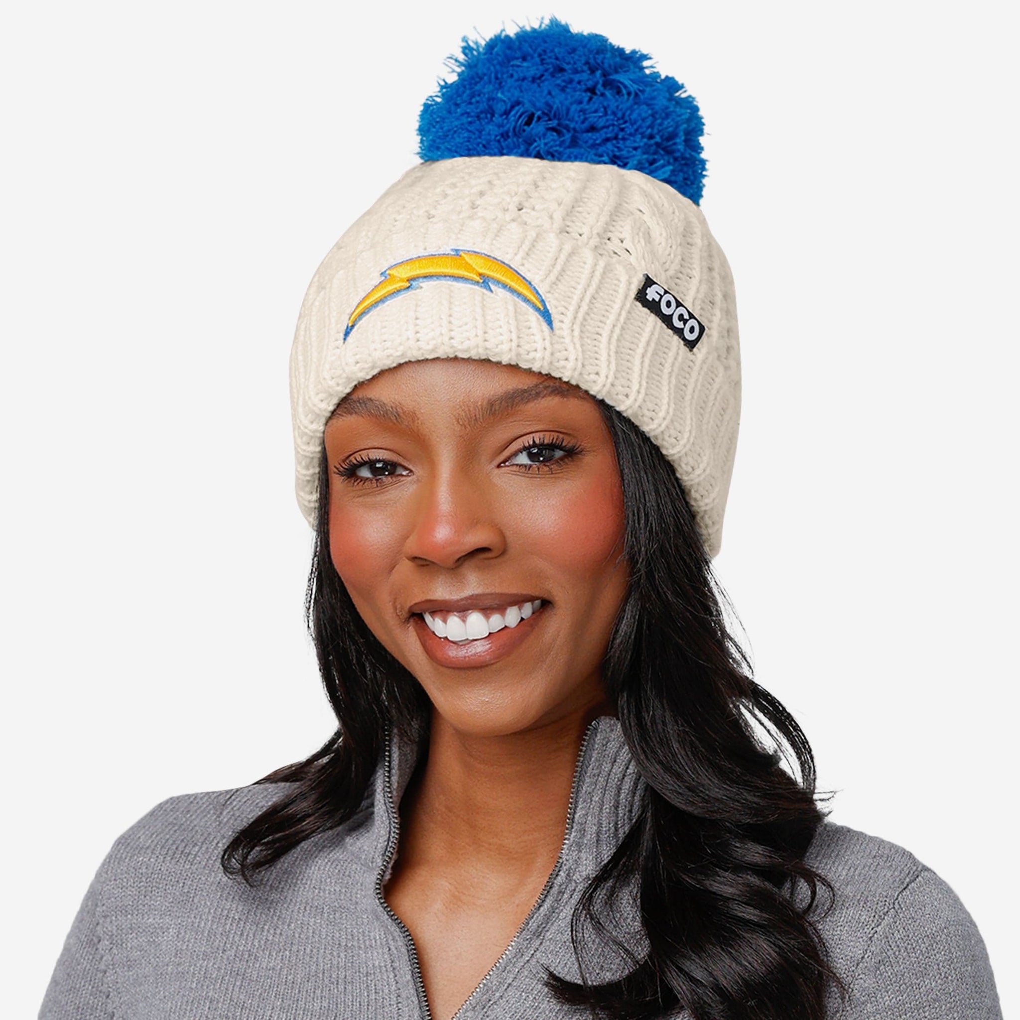 Putting together the ultimate fit for the tailgate and beyond? Make sure to get your head in the game with the Los Angeles Chargers Women's Primary Logo White Cable Knit Pom Beanie!