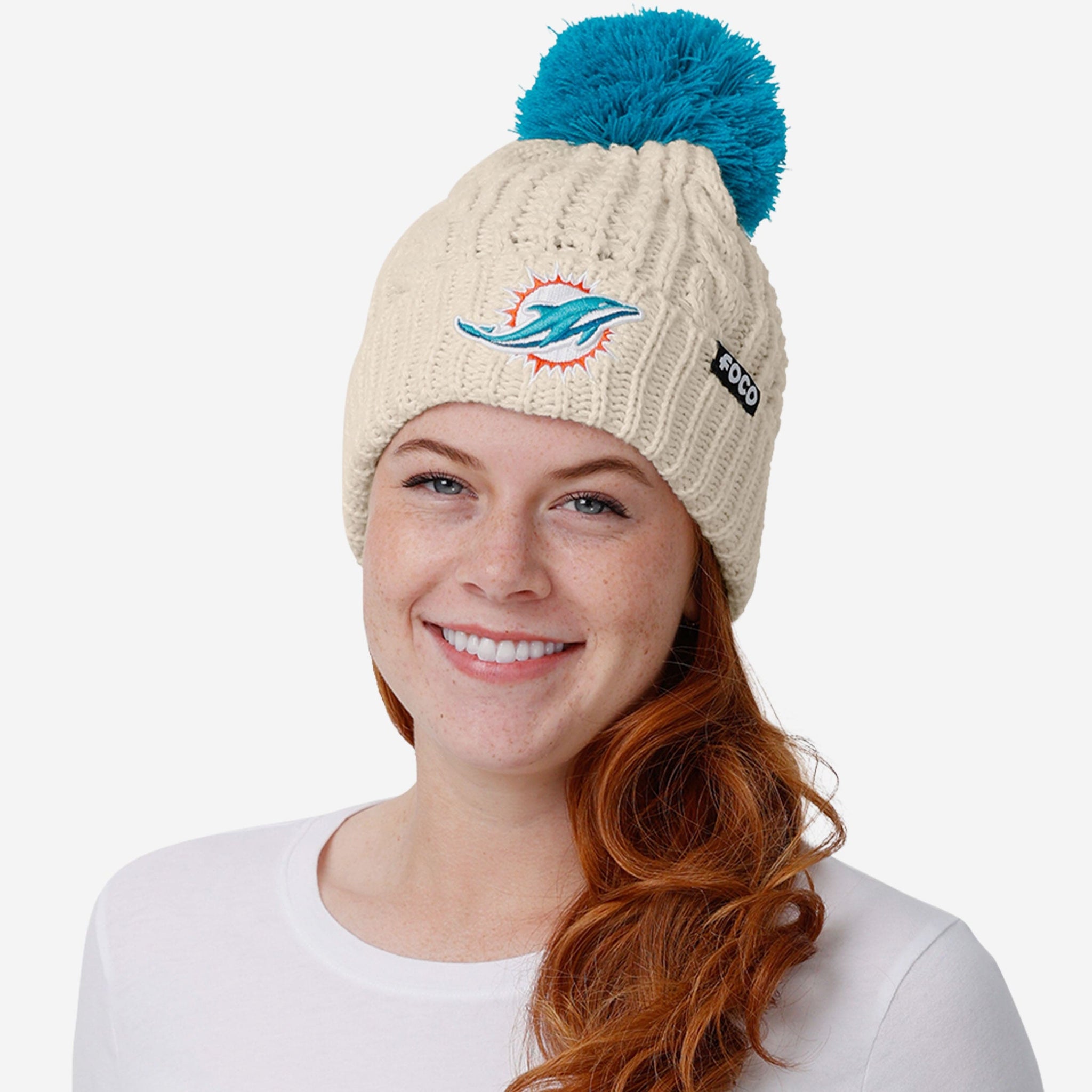 Miami Dolphins Womens Primary Logo White Cable Knit Pom Beanie FOCO - FOCO.com