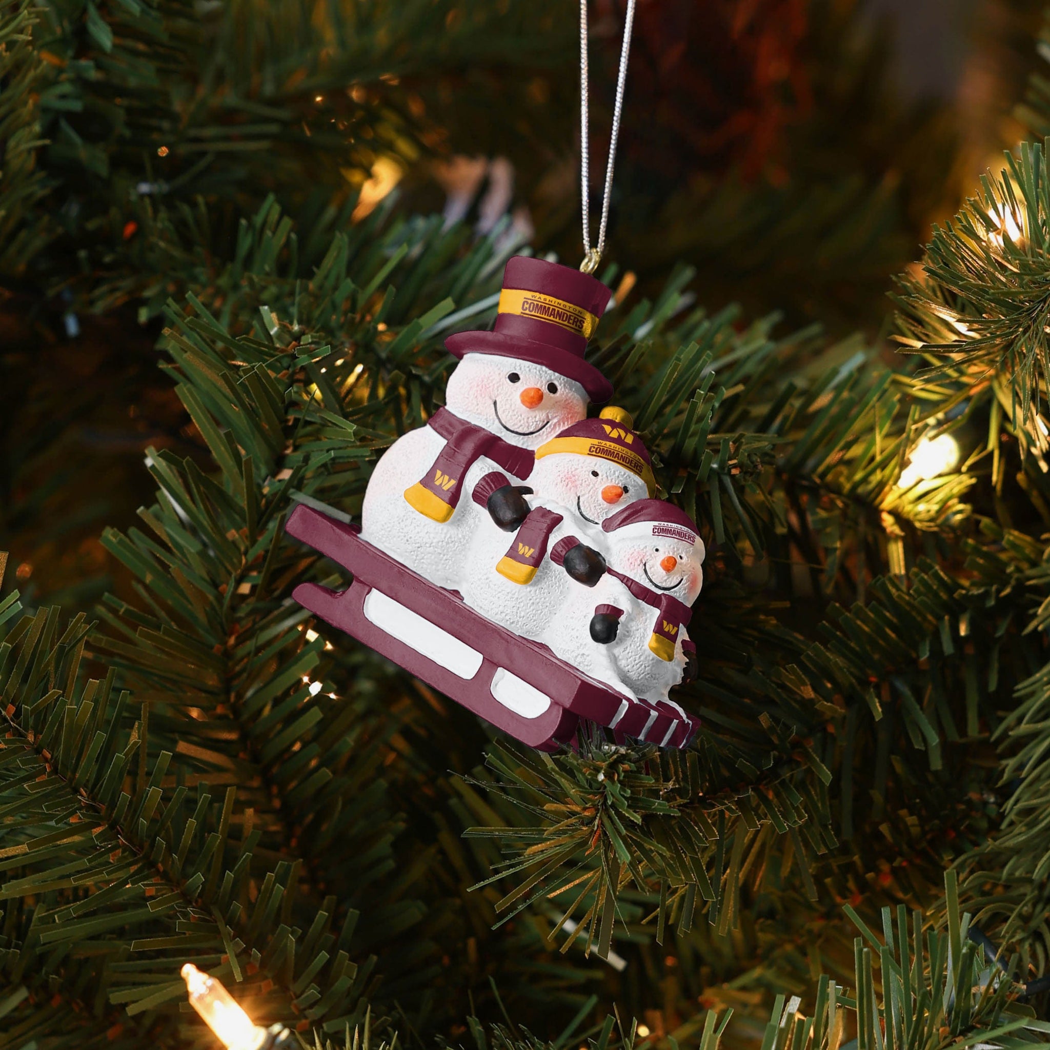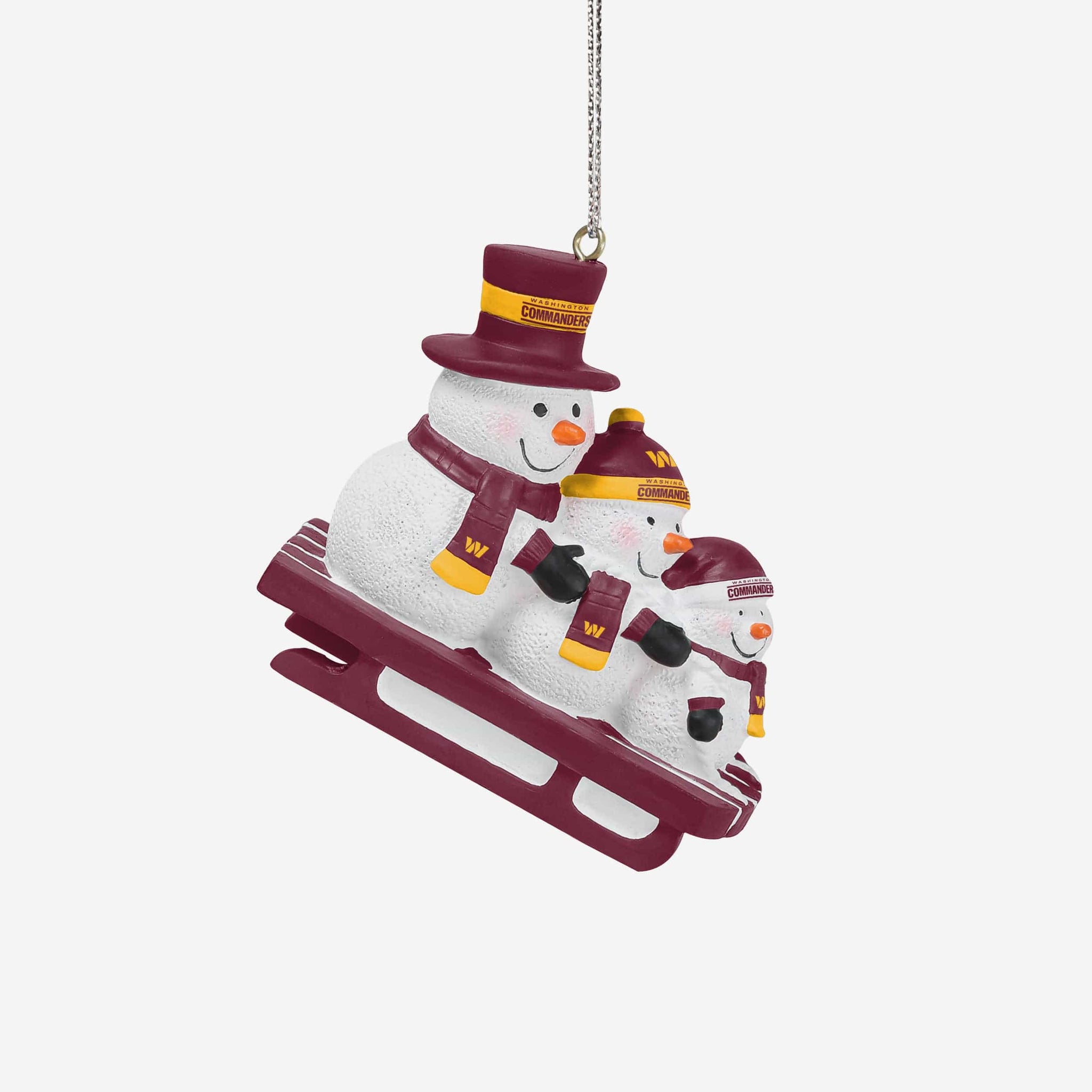 Meet three snowman friends that won't melt when you bring them inside! Introducing the Washington Commanders Sledding Snowmen Ornament!