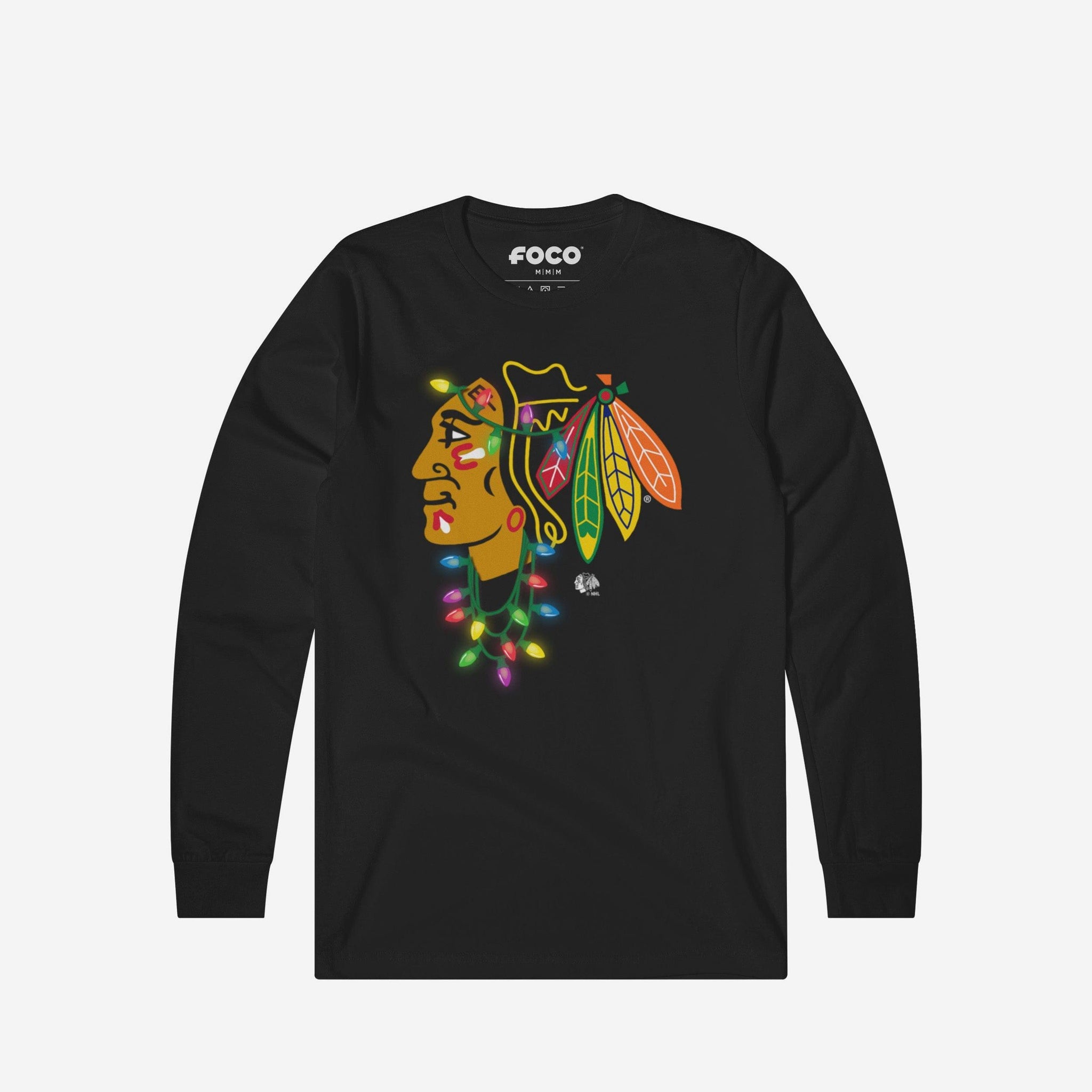Chicago Blackhawks Primary Logo Holiday Lights Long Sleeve T-Shirt FOCO S - FOCO.com