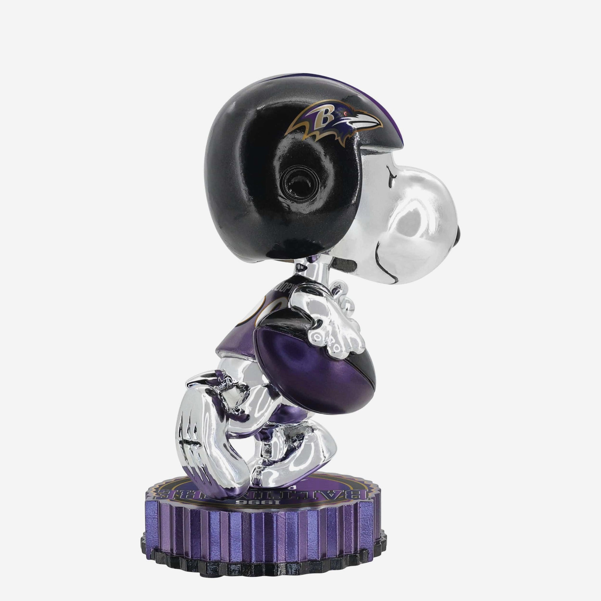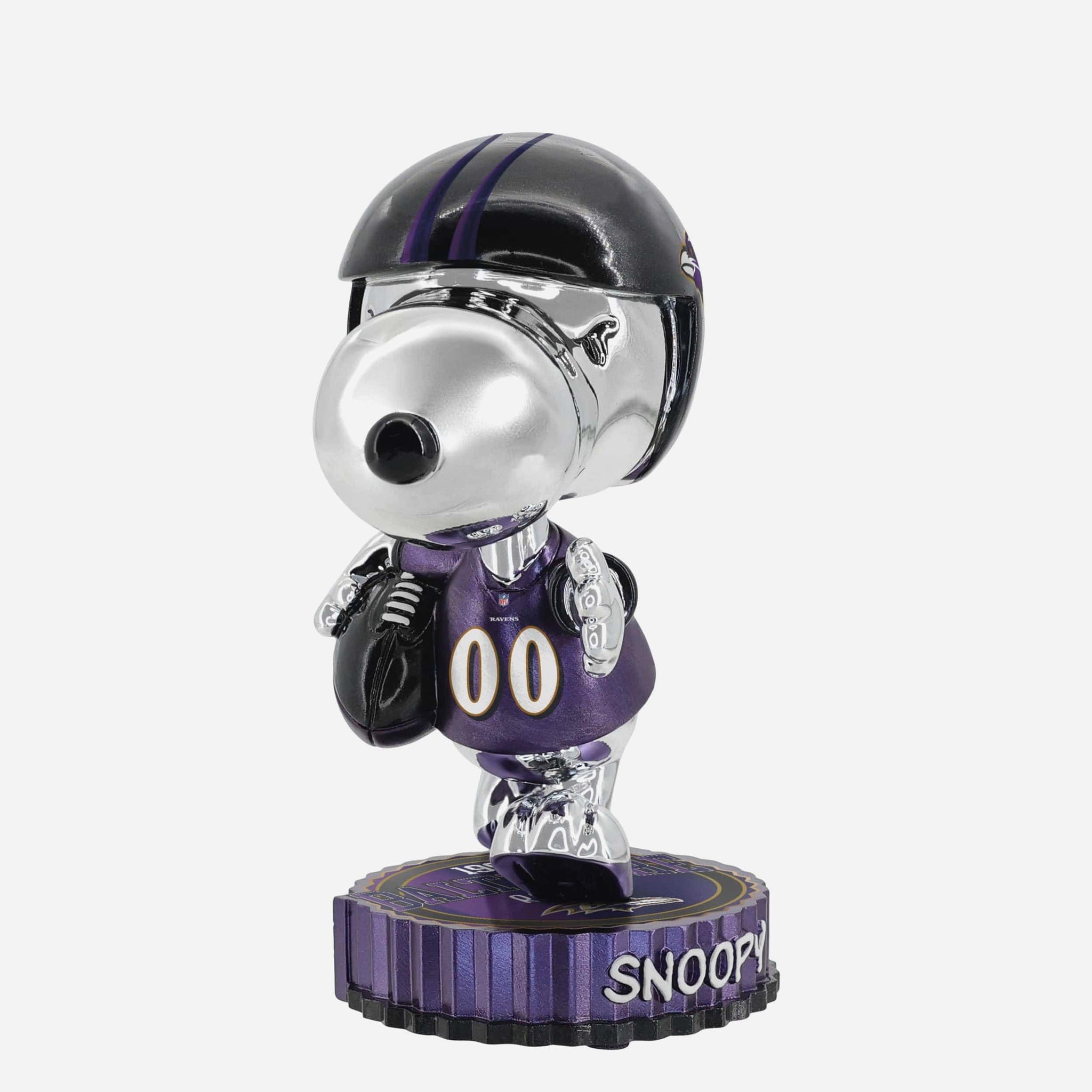 Snoopy is suiting up for game day in dazzling style! Add a little gridiron glow to your collection with this Baltimore Ravens Snoopy Peanuts Electroplated Medium Bighead Bobblehead.