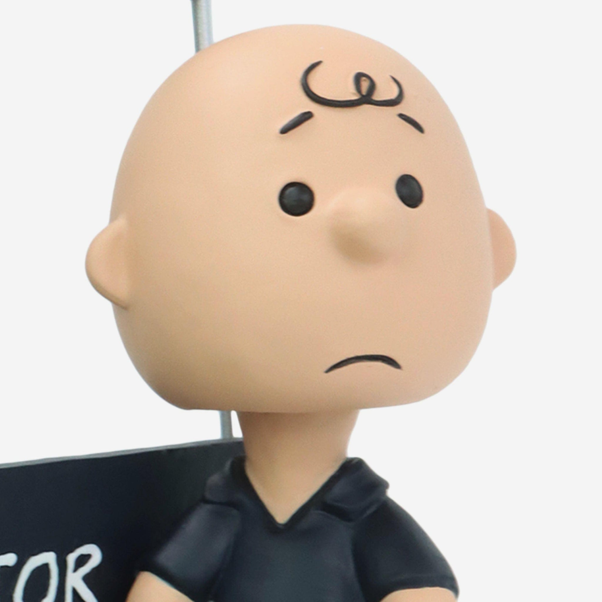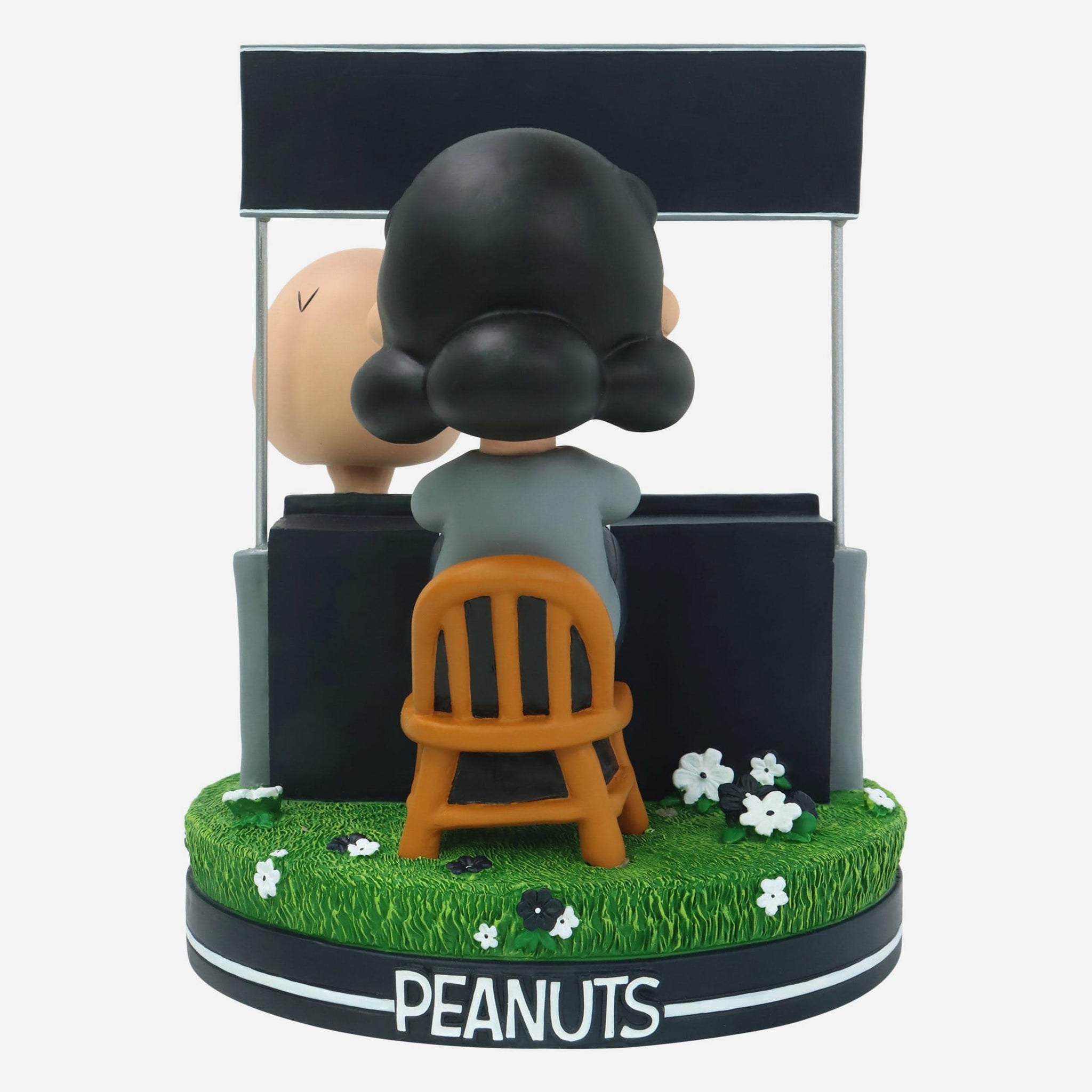 • Portrays Lucy Van Pelt sitting behind a team-colored wooden stand, and Charlie Brown sitting in front of the stand, ready to give your collection some great advice