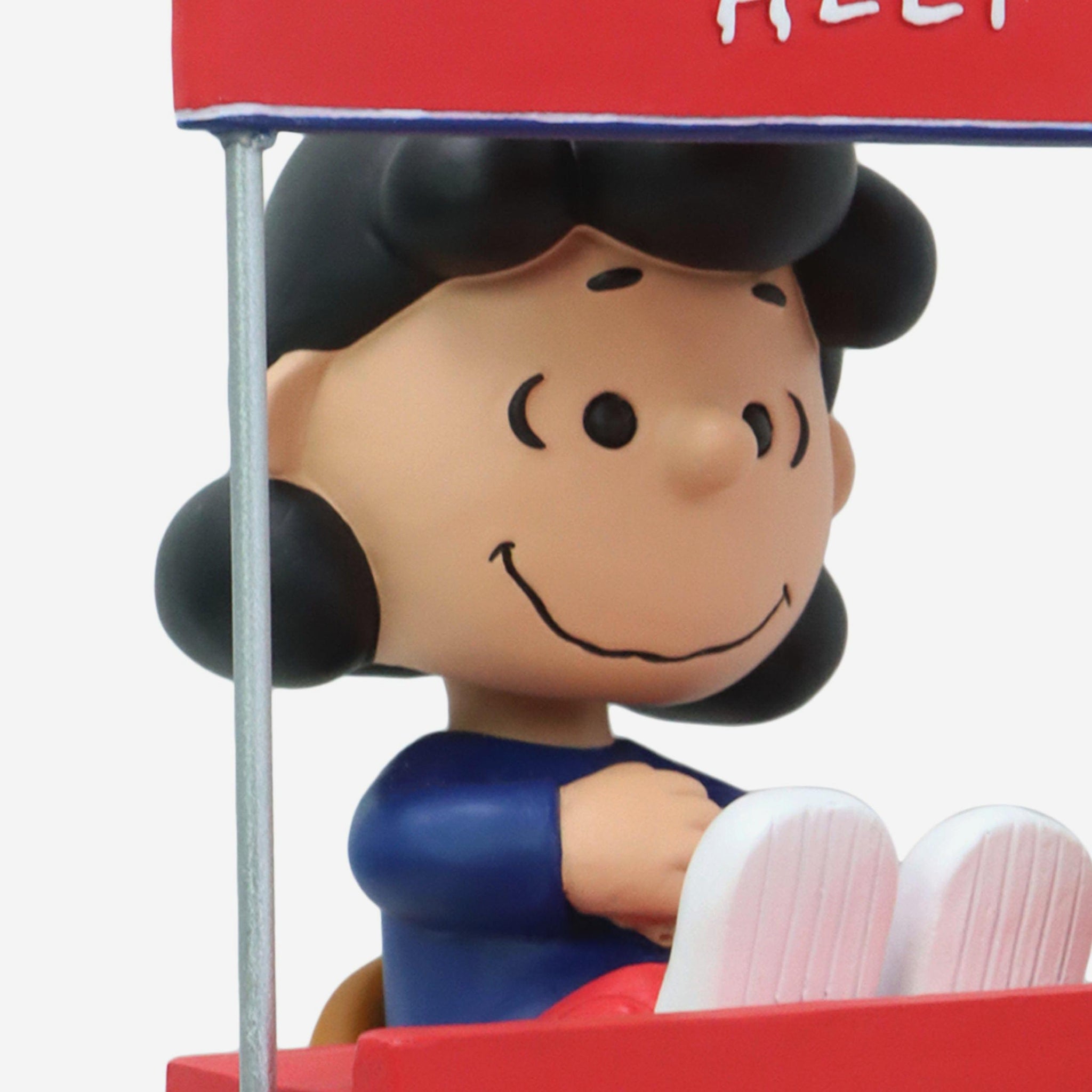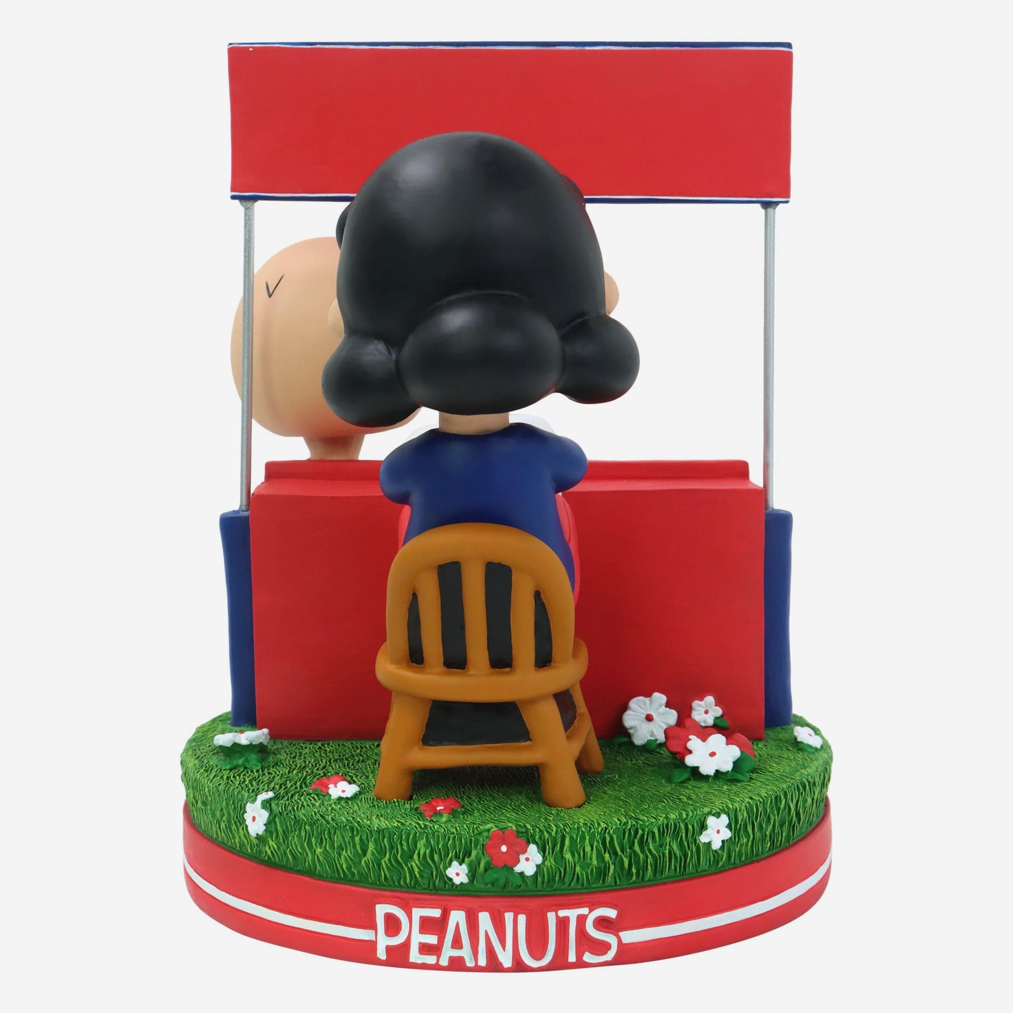 - Portrays Lucy Van Pelt sitting behind a team-colored wooden stand, and Charlie Brown sitting in front of the stand, ready to give your collection some great advice