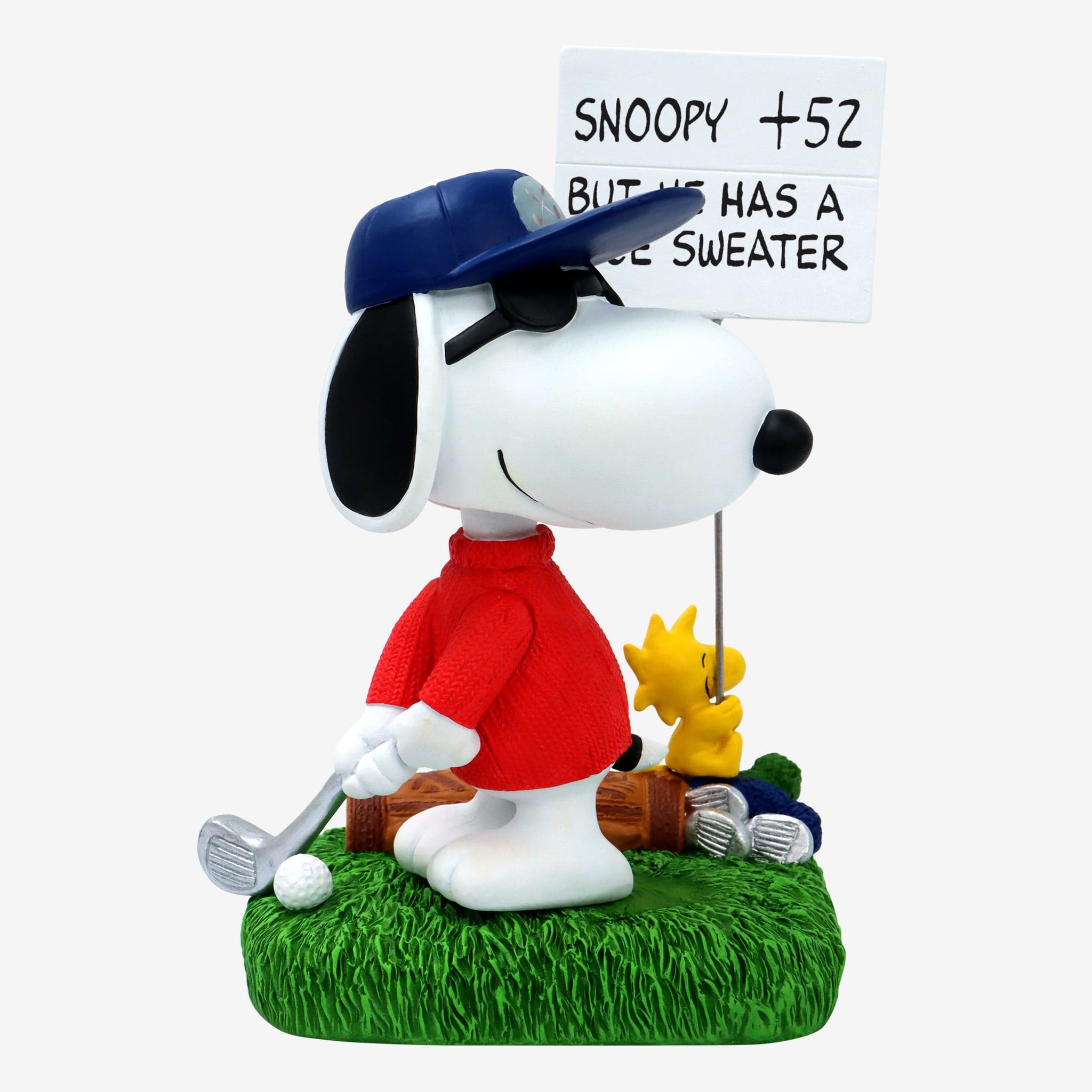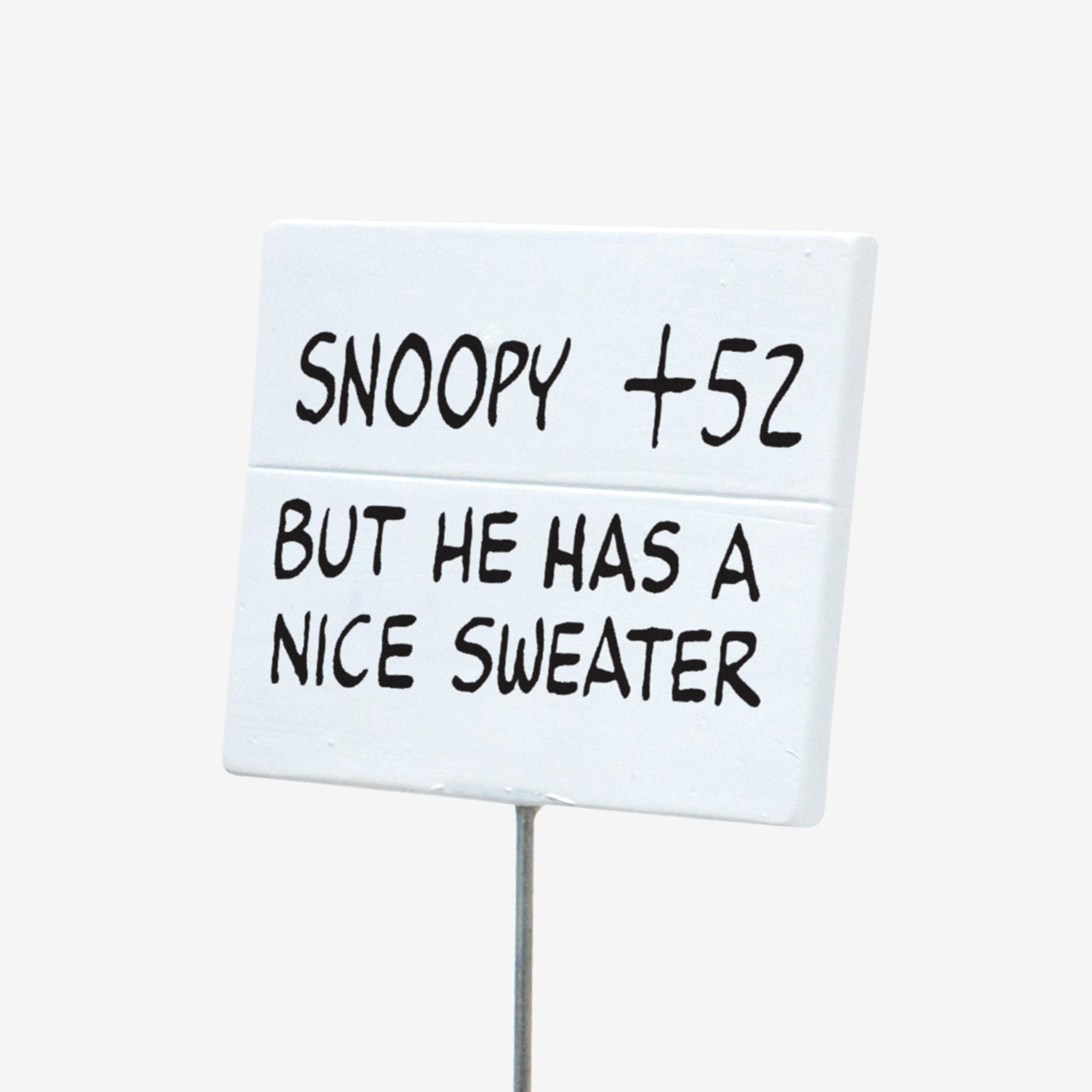 - Woodstock holding a sign with a “SNOOPY + 52 BUT HE HAS A NICE SWEATER” text display that will look great in your collection
