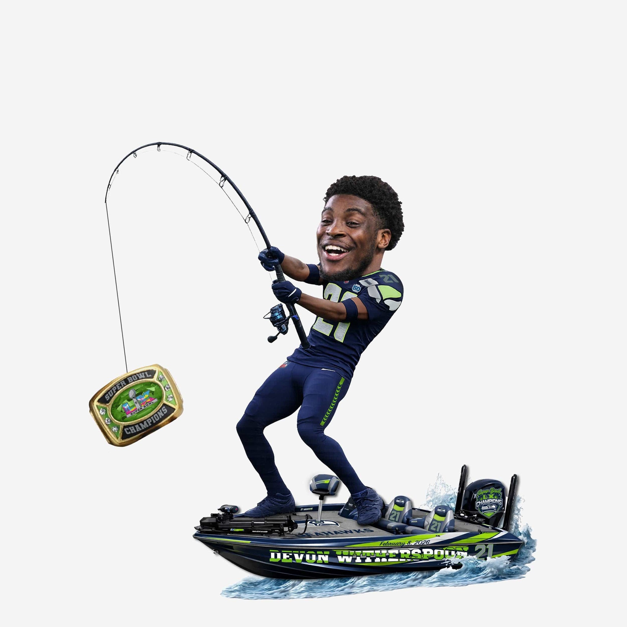 Reel in a championship moment with this Devon Witherspoon Seattle Seahawks Super Bowl LX Champions Fishing Sack Celebration Bobblehead! Celebrating a title that was truly worth the wait, this bobble captures Witherspoon hauling in the ultimate catch — a Super Bowl ring — after a season that Seahawks fans will never forget.