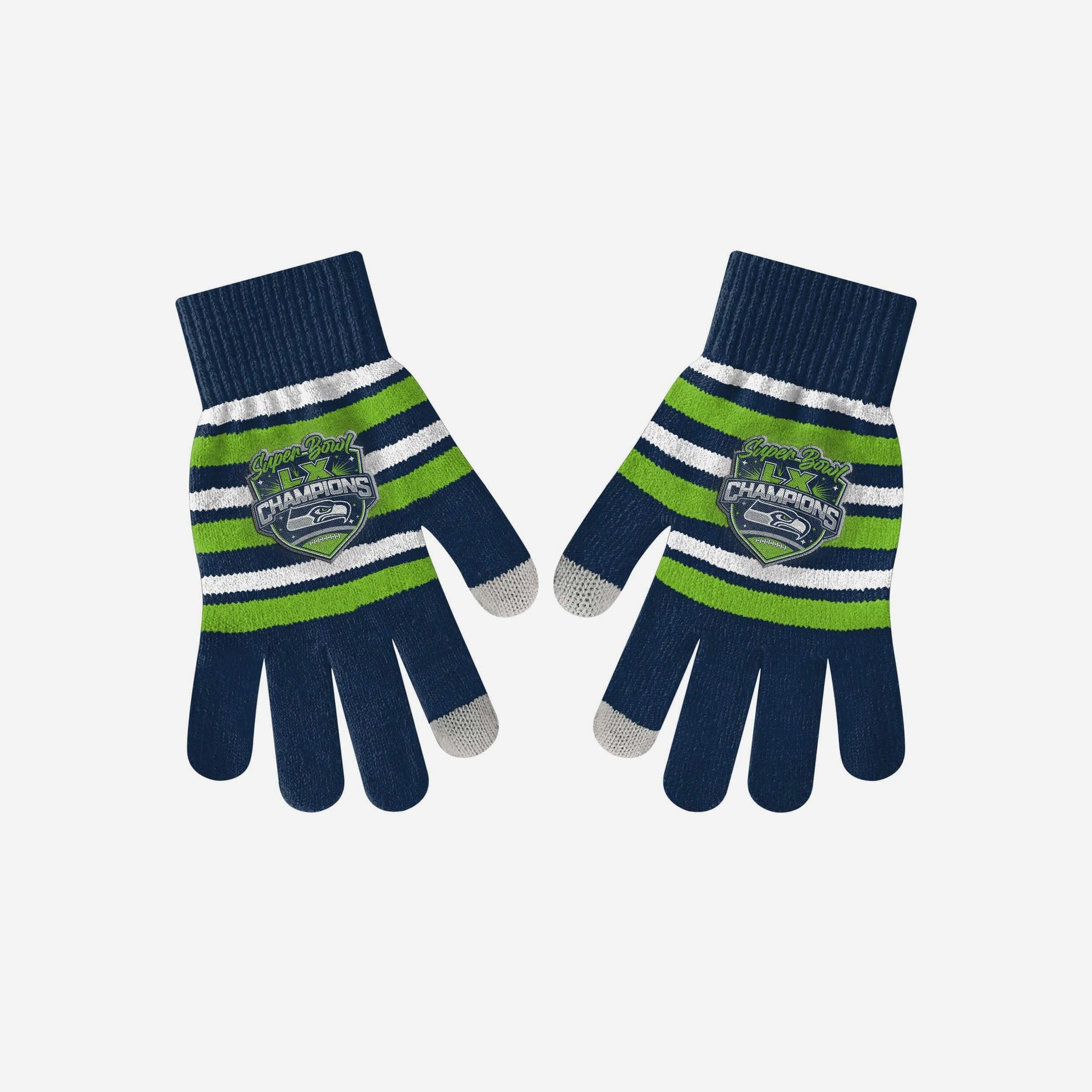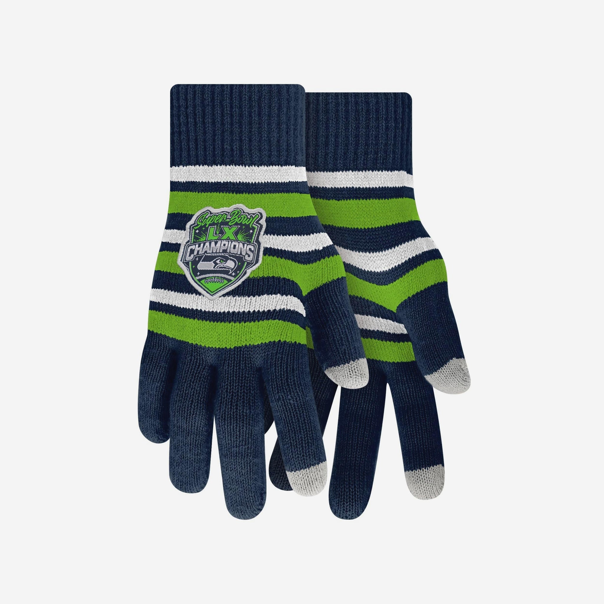 Need to post about that awesome play you just saw at the game, but don't want to battle the cold weather to do it? These Seattle Seahawks Super Bowl LX Champions Acrylic Stripe Knit Gloves have texting fingertips to help you stay connected while you stay warm.