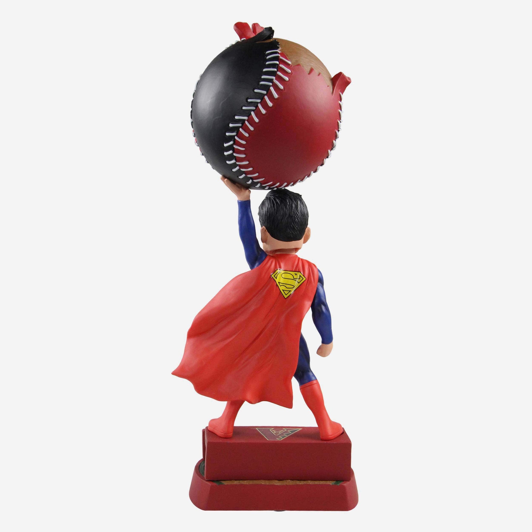 - Portrays Superman posing and holding a team-colored baseball with team logo display, showing off that super strength