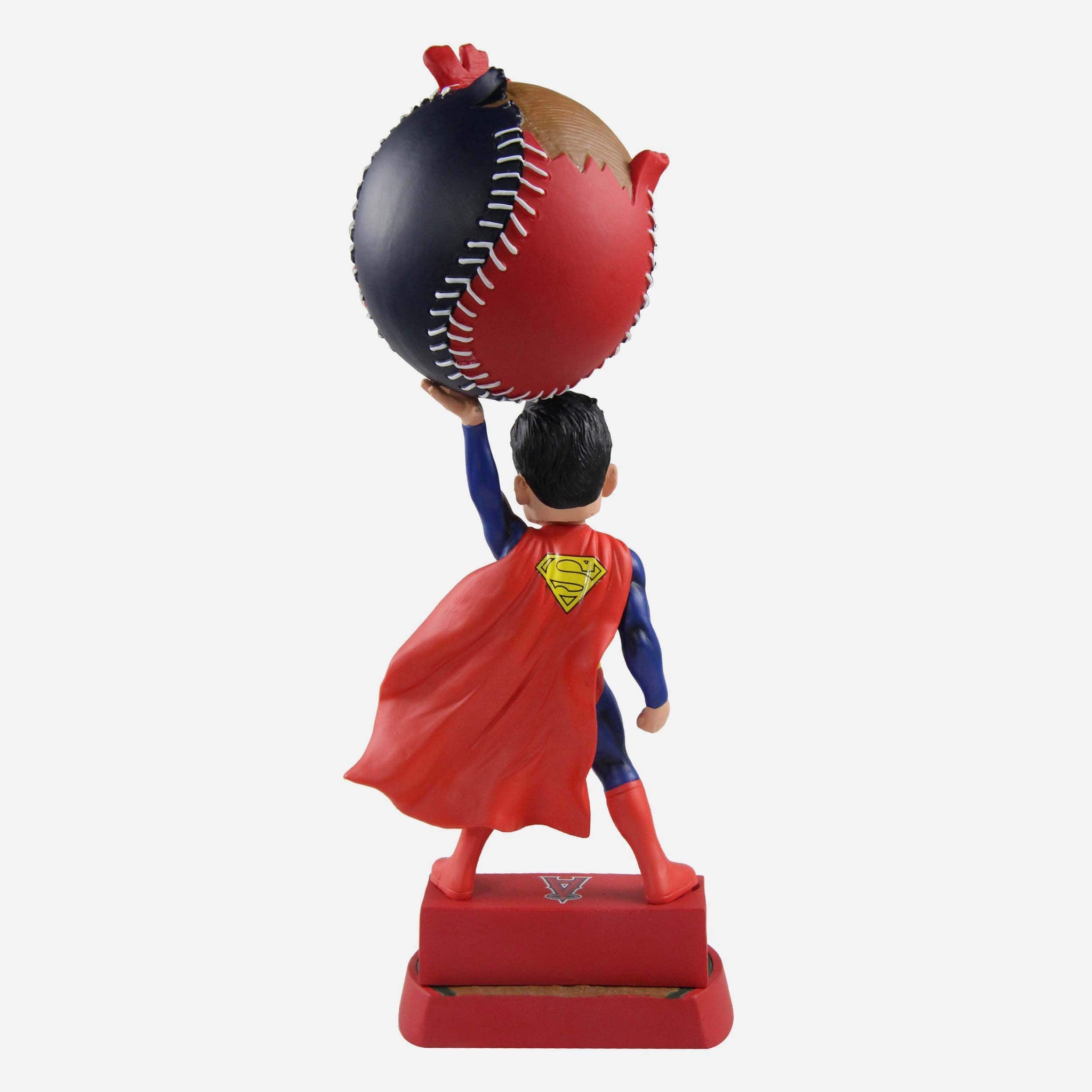 - Portrays Superman posing and holding a team-colored baseball with team logo display, showing off that super strength