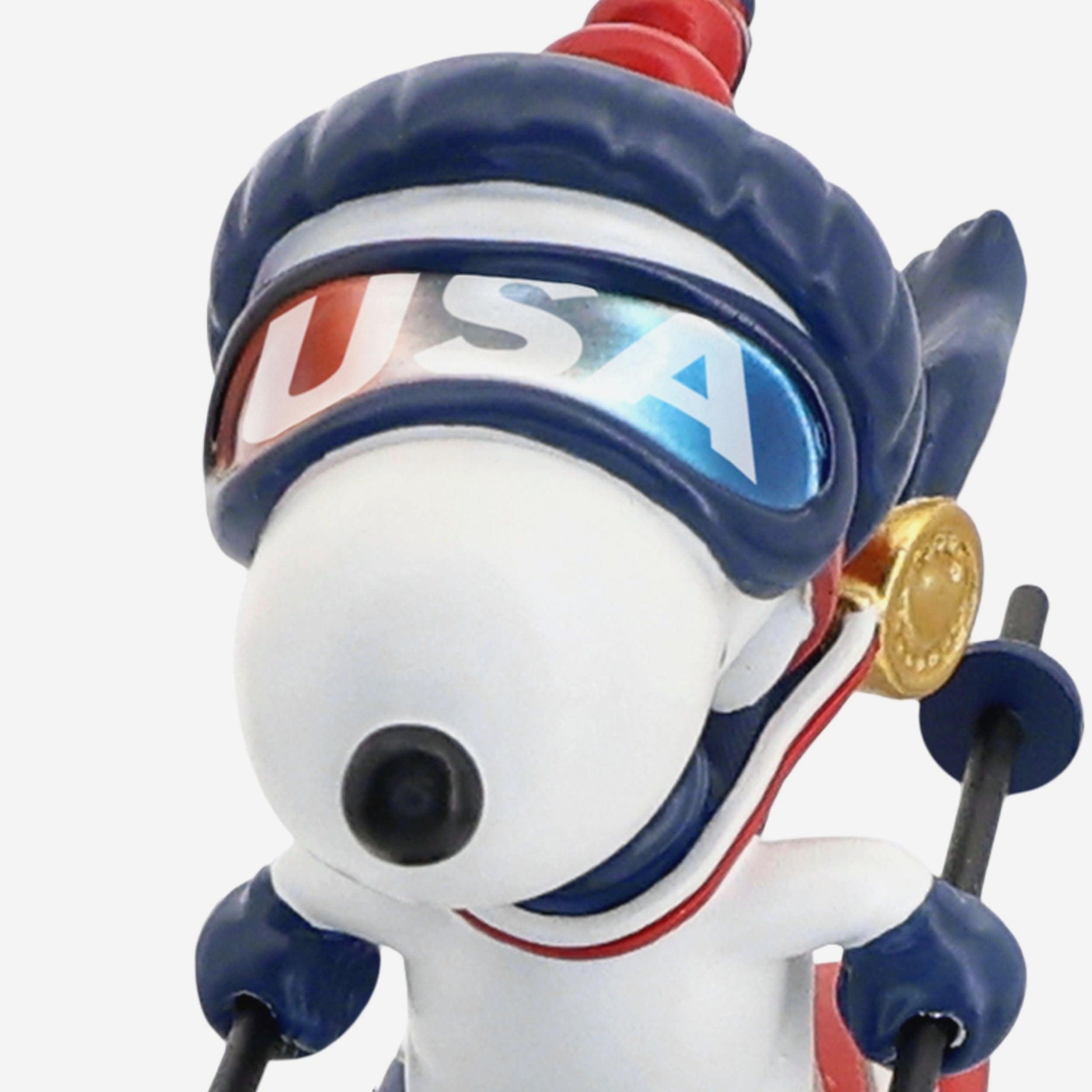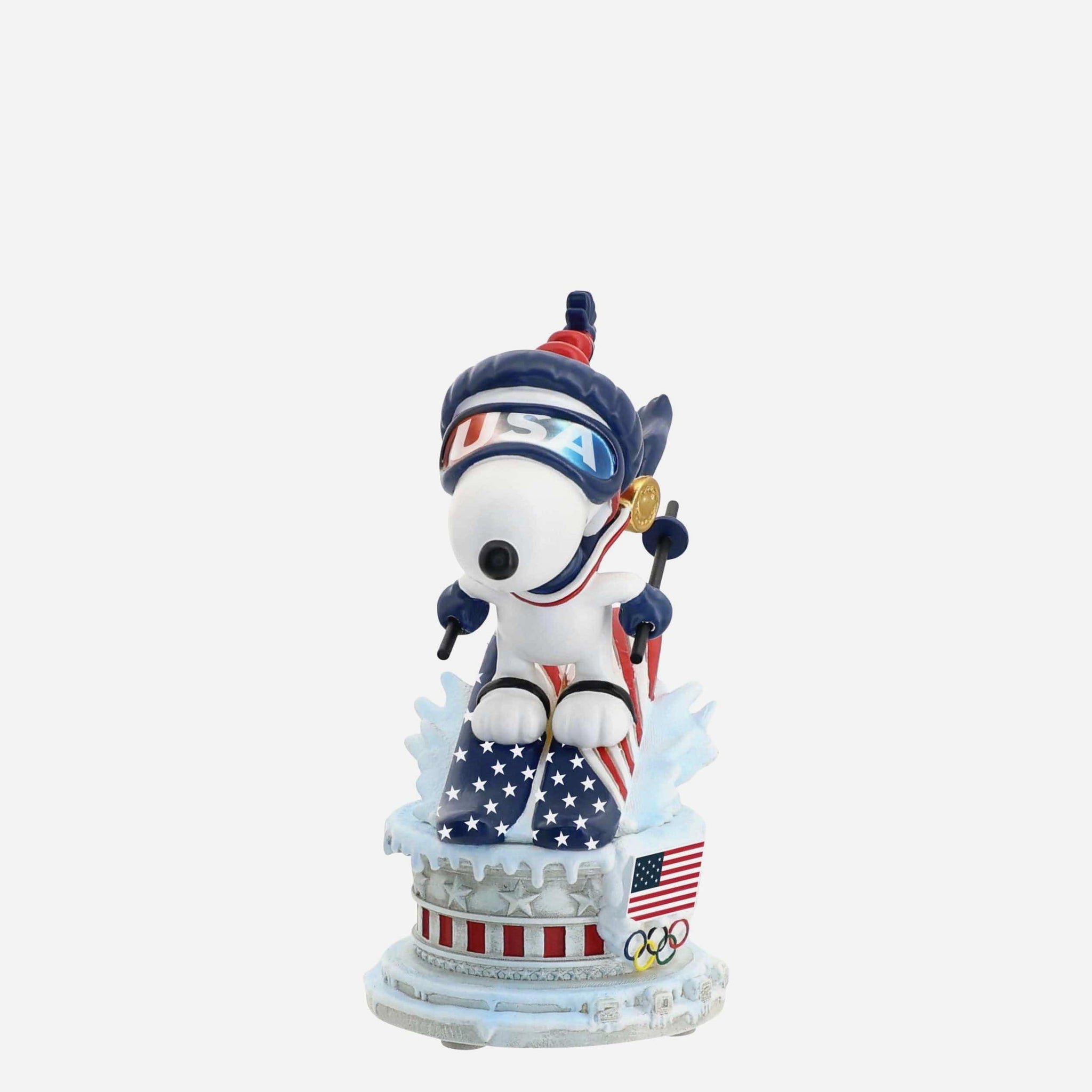 Soar into wintertime excitement with this Team USA Snoopy Peanuts Ski Jump Mini Bobblehead, capturing Snoopy mid-flight as he takes off in patriotic style.