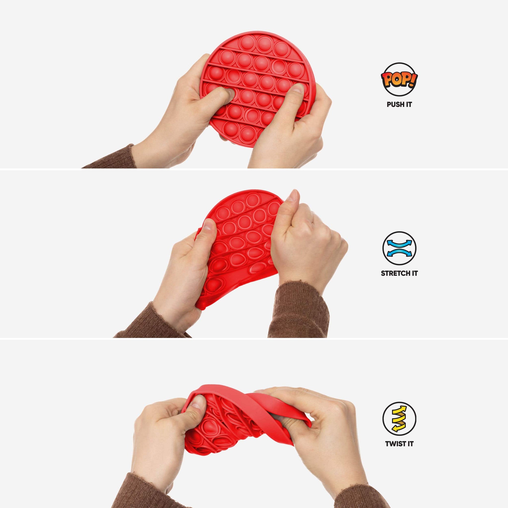 - Three-pack of vibrant colored fidget popper toys in fun shapes that will put a smile on any face