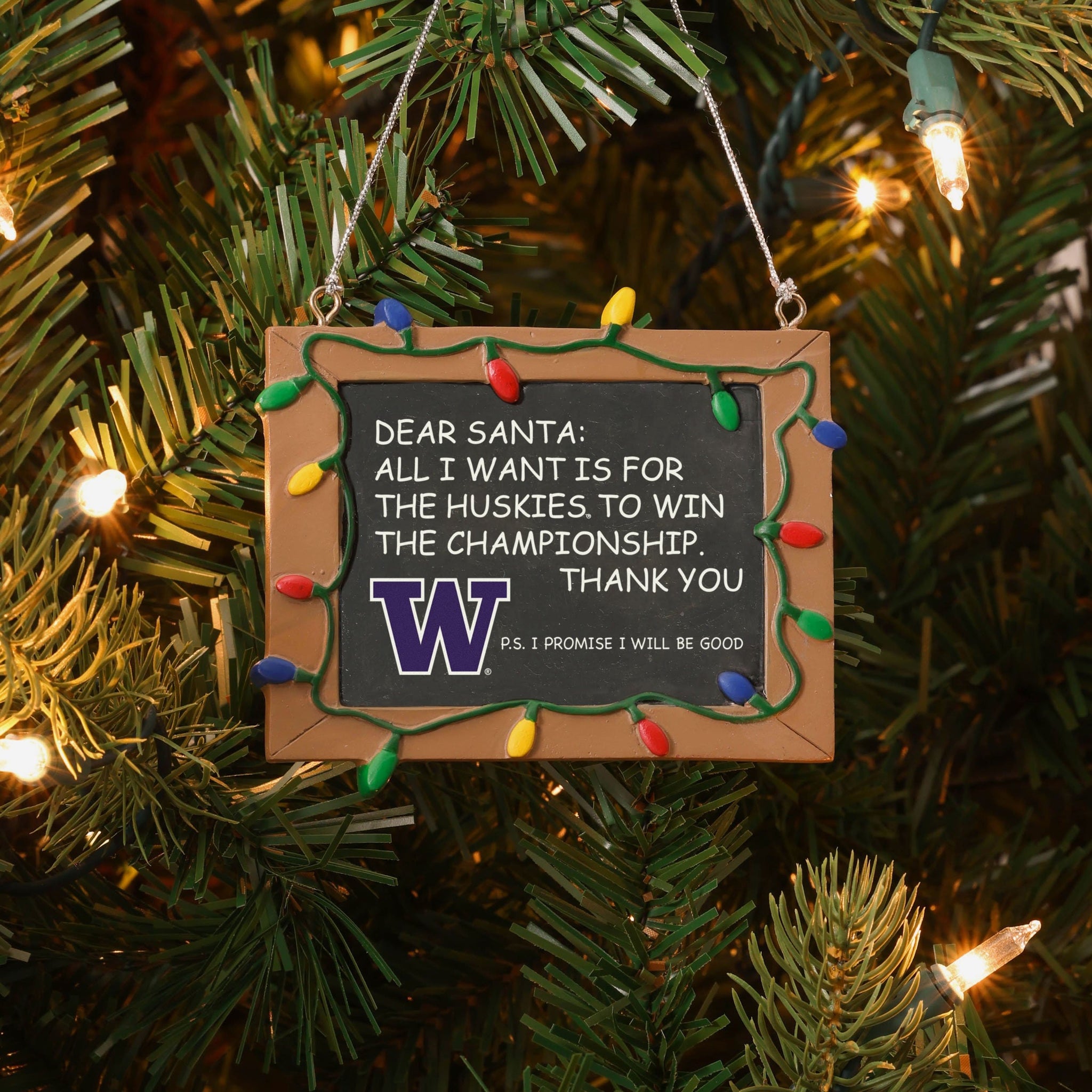 So, you made your list and sent it to jolly ol' Fanta Claus, asking him for a championship. But sometimes letters can get lost in the mail. Just in case, put this Washington Huskies Chalkboard Sign Ornament on your tree to let him know how good you've been this year, and that all you want for the holidays is a trophy.