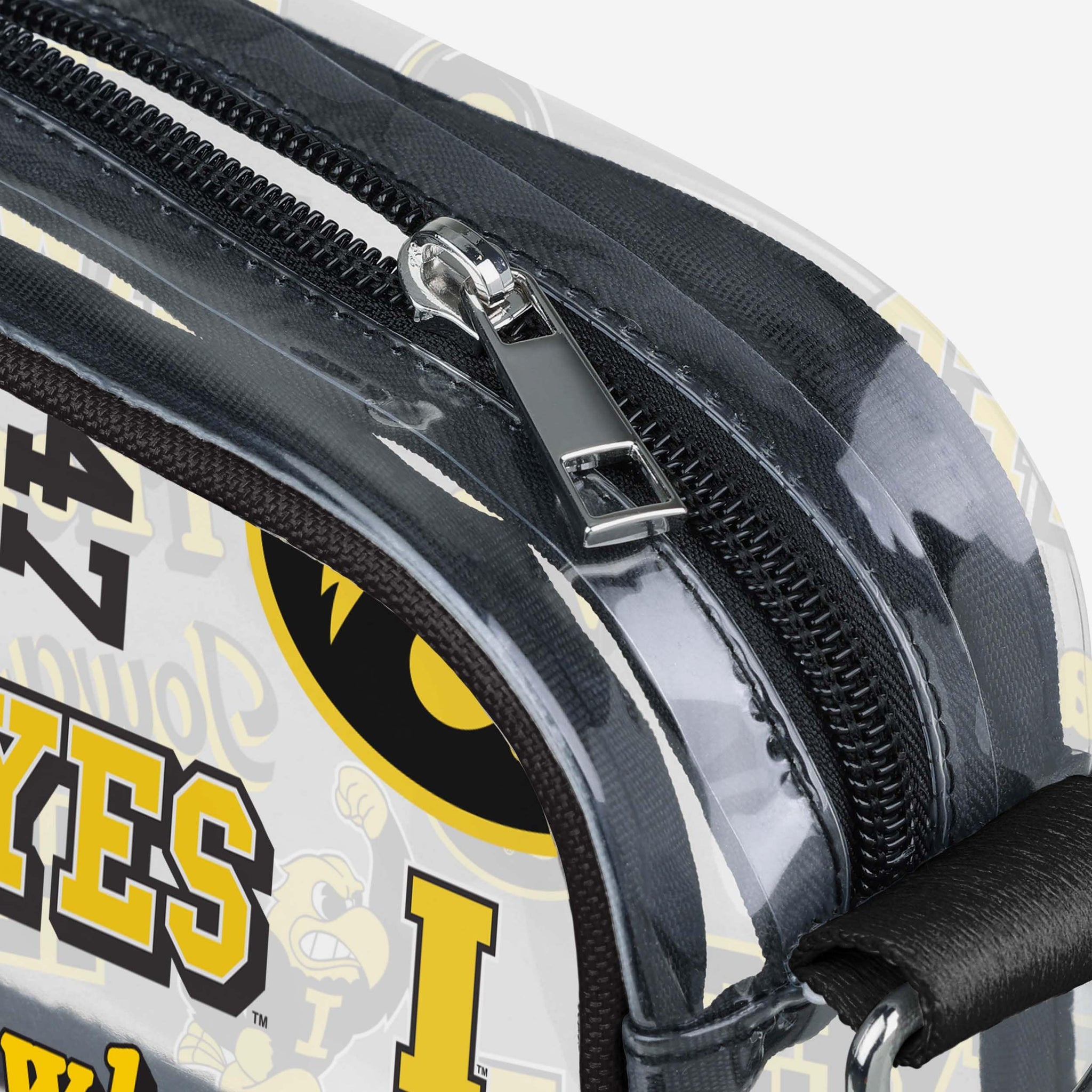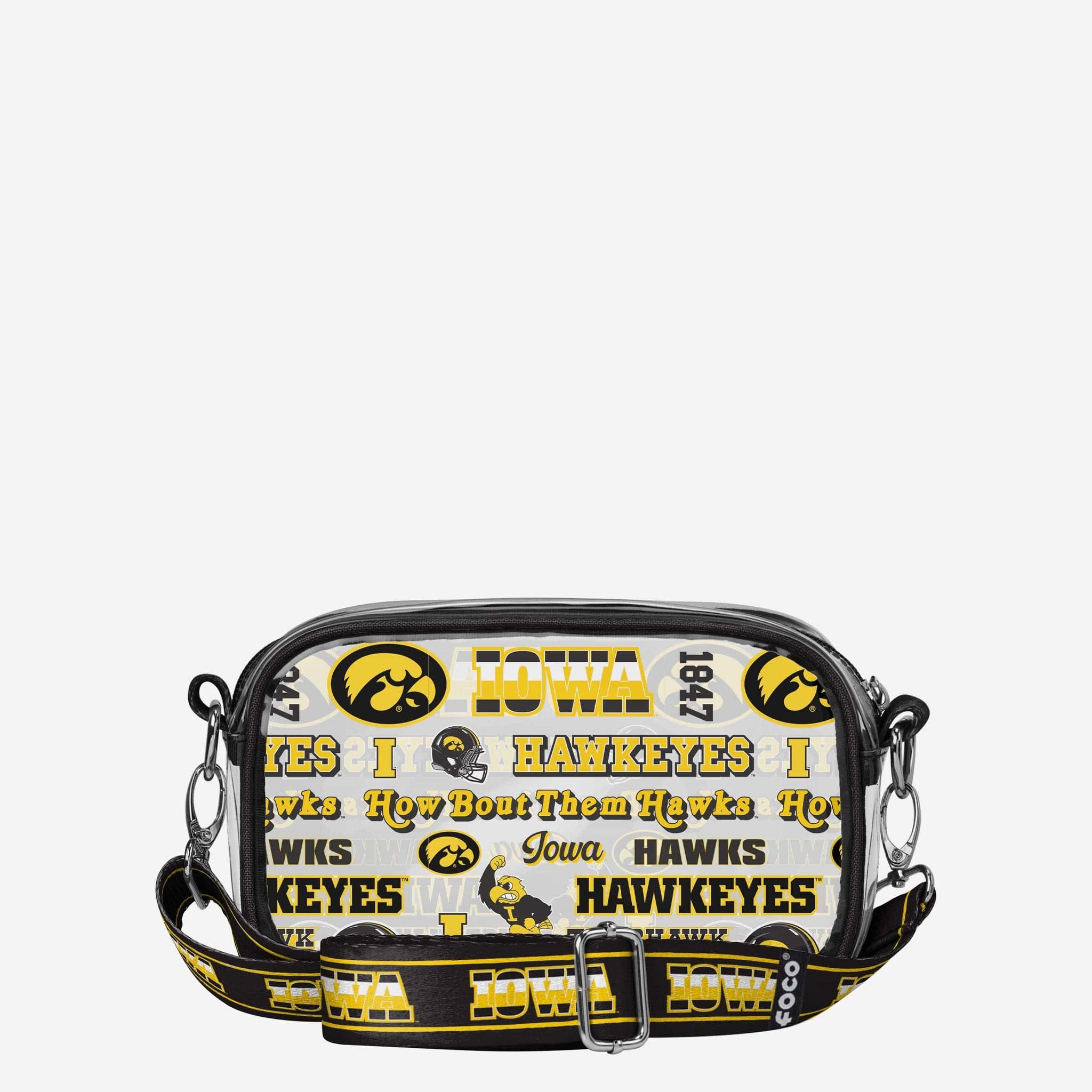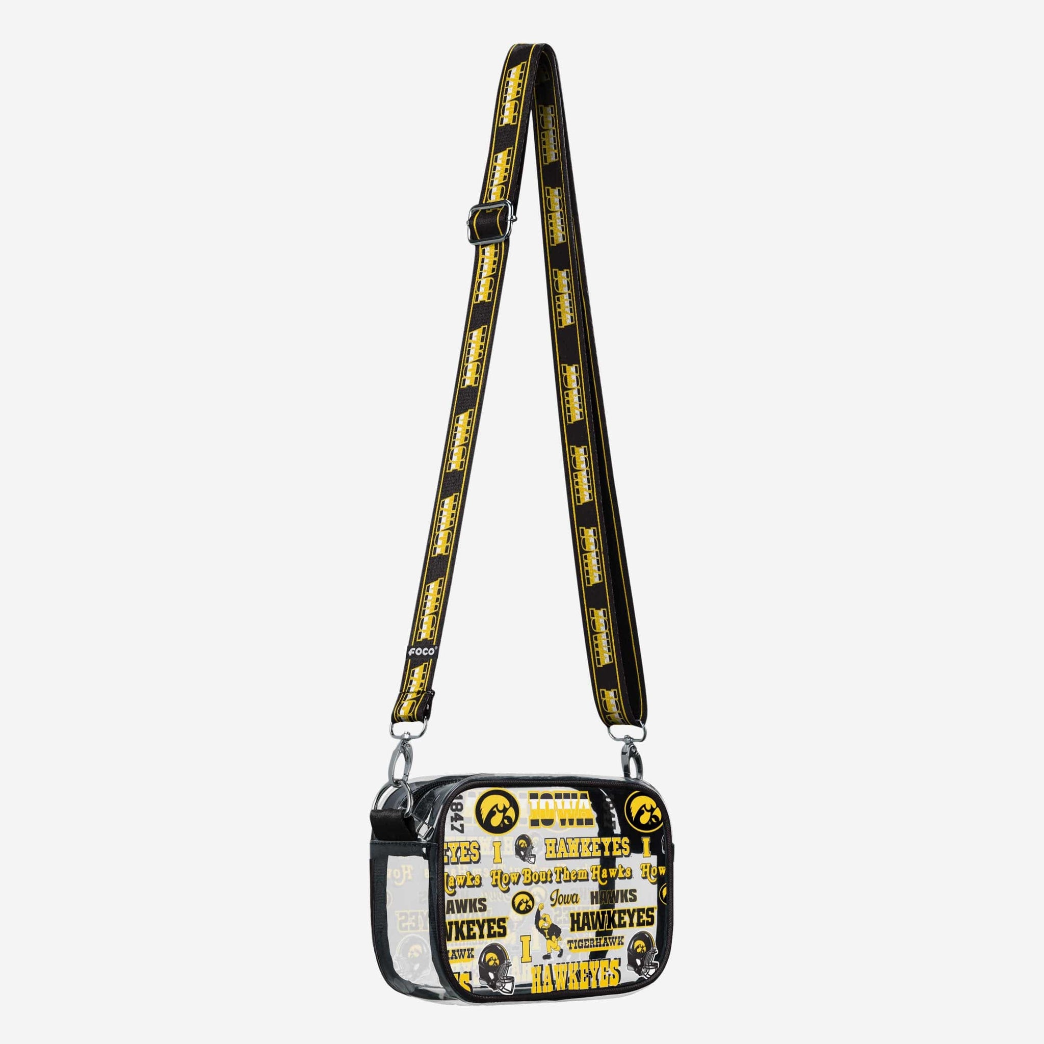 Over your shoulder and off to the game. Whether you're running errands on the town or running the tailgate in the parking lot, this Iowa Hawkeyes Repeat Retro Print Clear Crossbody Bag is the perfect way to carry the team like never before.