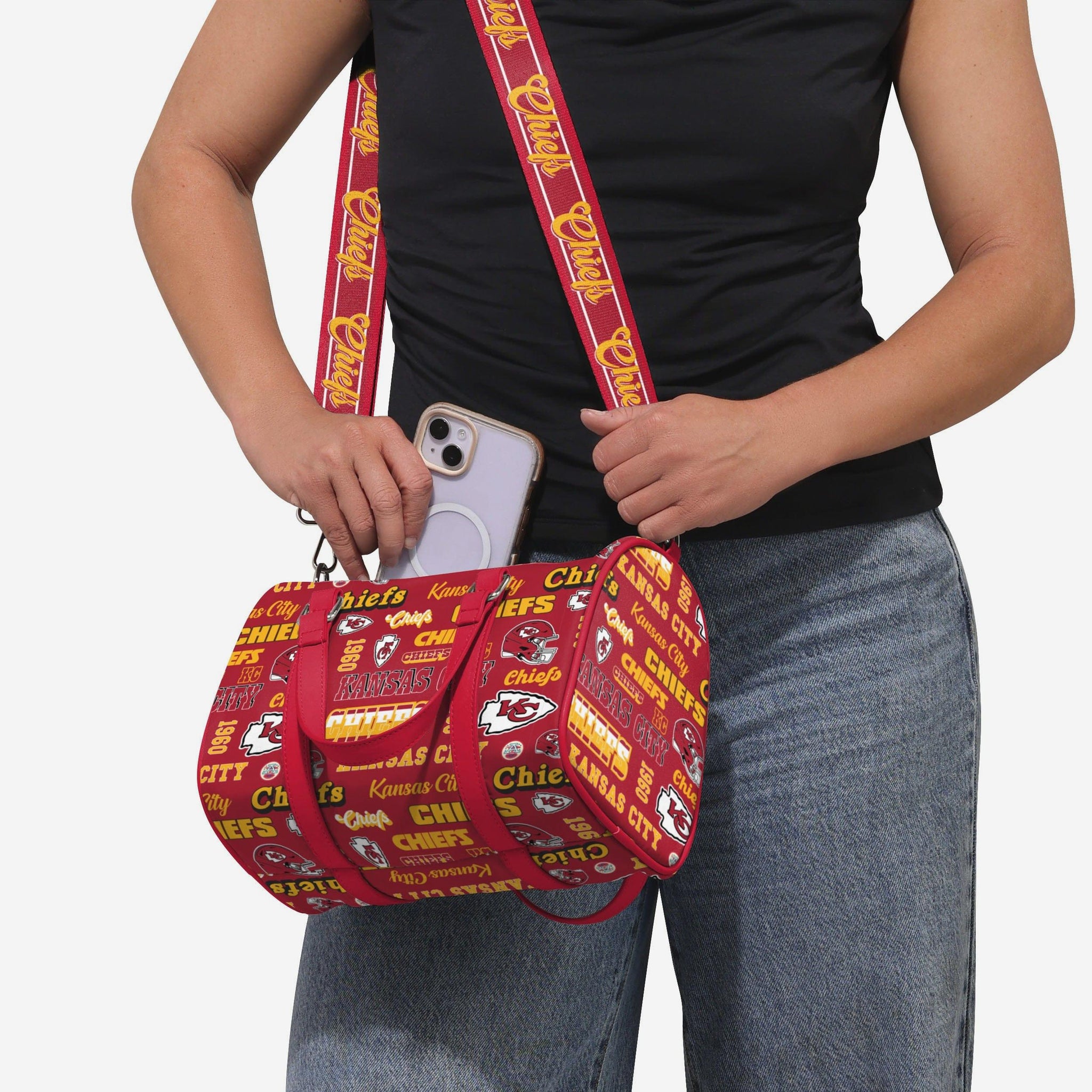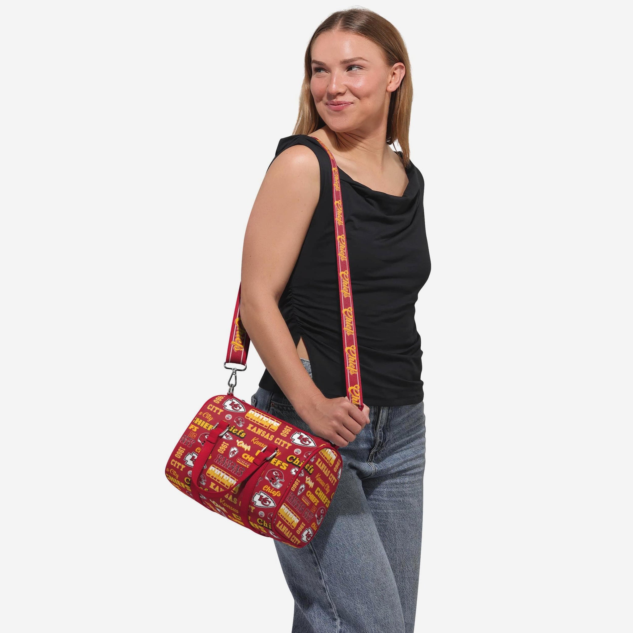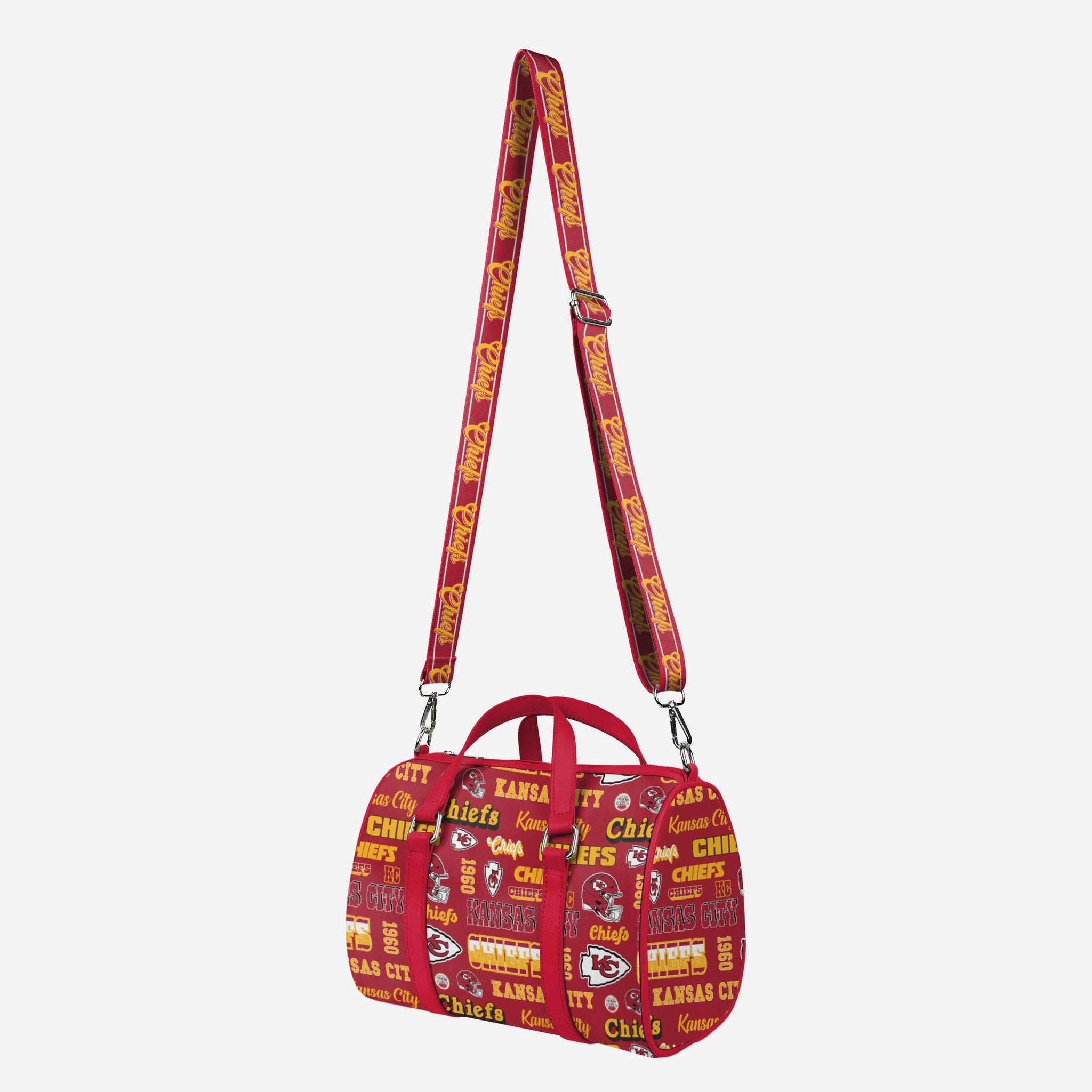 Pack up and play on! Fashion meets fandom in the Kansas City Chiefs Repeat Retro Print Nylon Medium Barrel Bag.