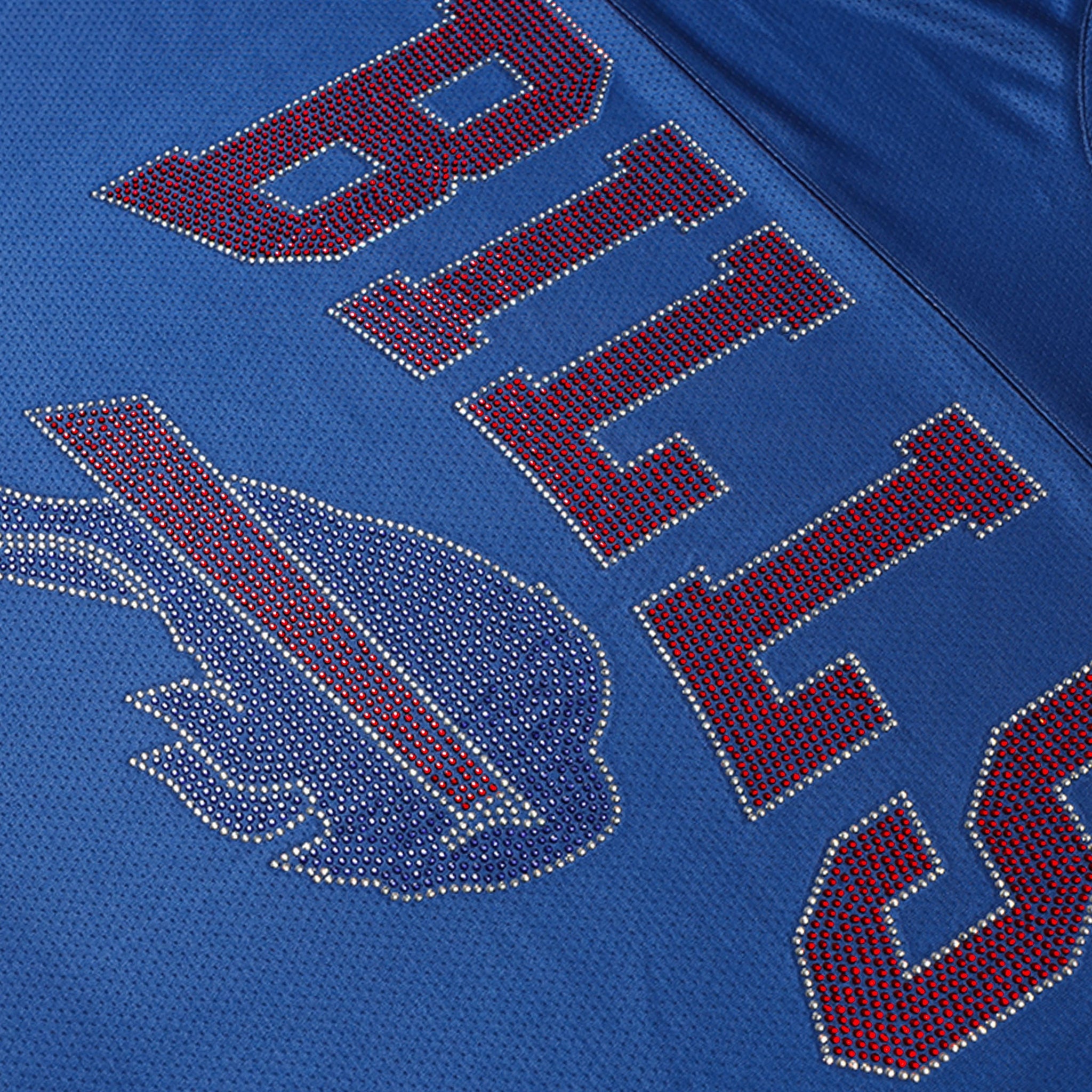 Bring the energy and let your team pride shine. The Buffalo Bills Womens Rhinestone Logo Oversized V-Neck Mesh T-Shirt is built for fans who want to stand out while staying comfortable. With a breathable jersey mesh build, bold rhinestone team graphics, and a relaxed oversized fit, this tee is ready for game day, gym sessions, or just repping your squad on the go.