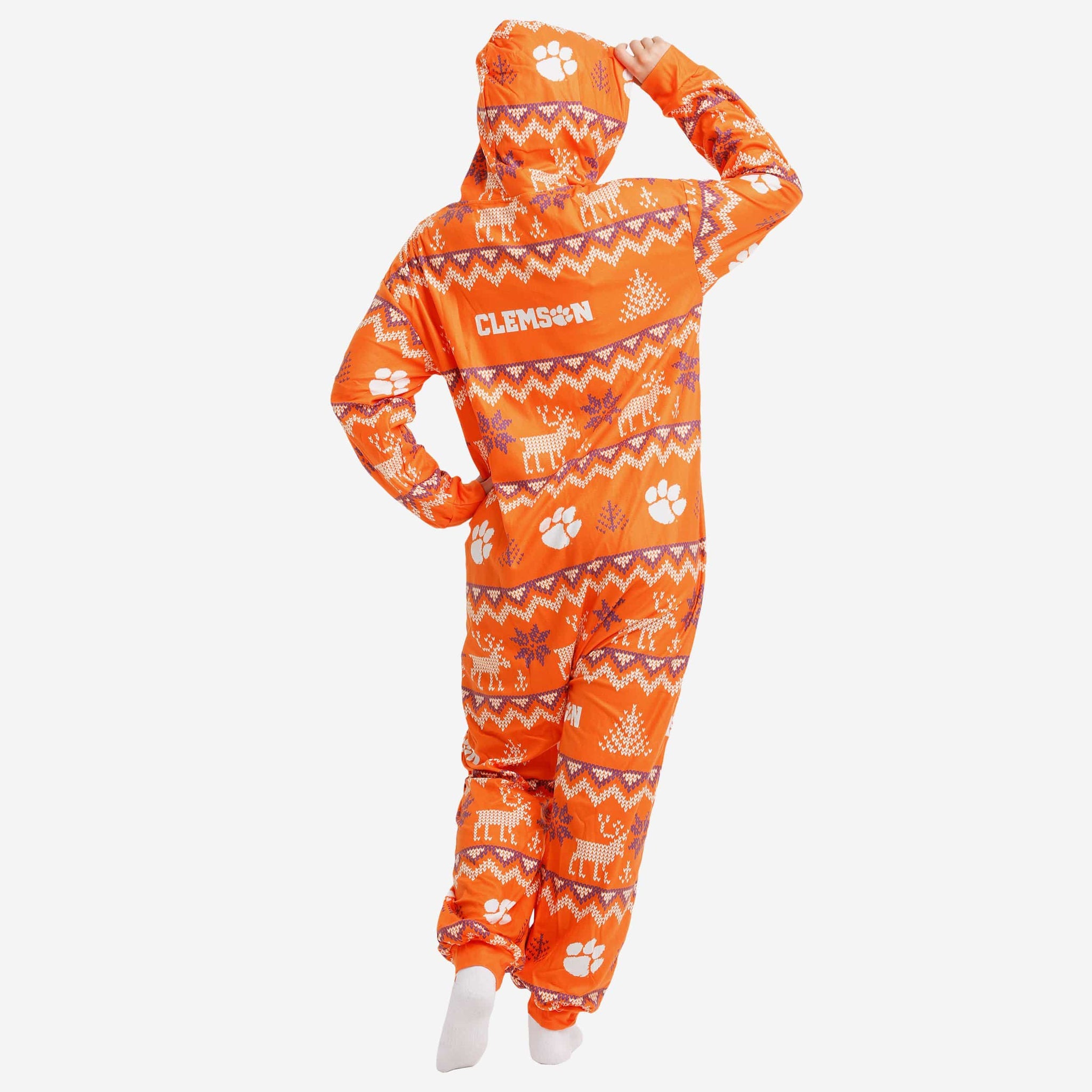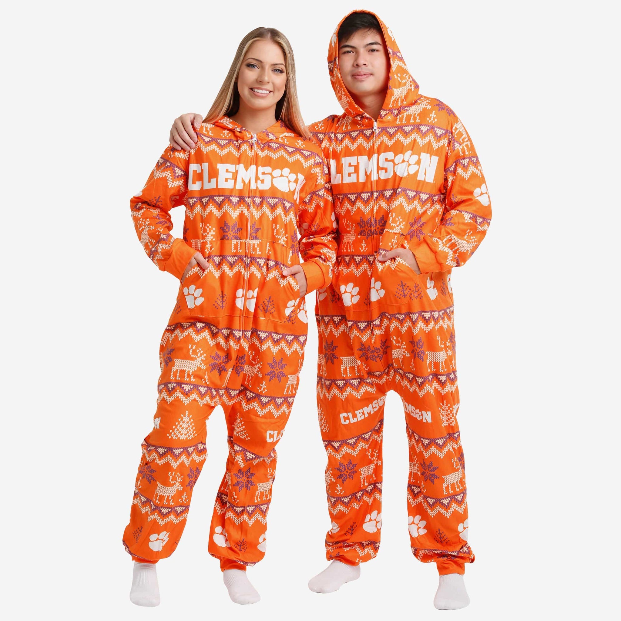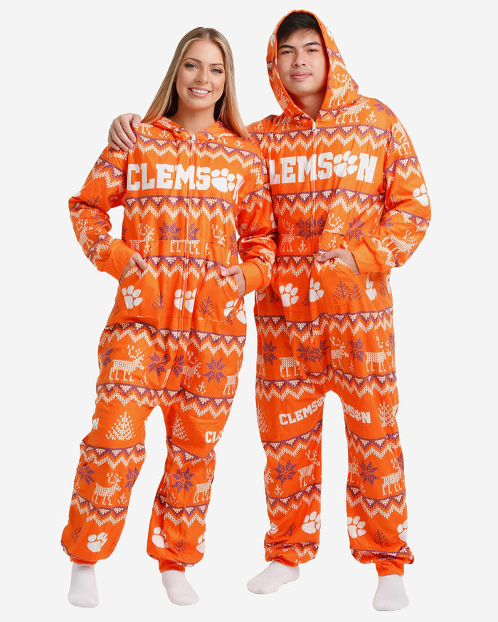 Get some matching family pajamas and dress to impress this holiday season! You won't want to miss these onesie team pajamas! These men's and women's PJ's are comfortable and show off your team spirit in the form of some sweet one piece jammies. Introducing the Clemson Tigers Ugly Pattern One Piece Pajamas! Don't forget to take your holiday photo with the whole family wearing matching Christmas pajamas!