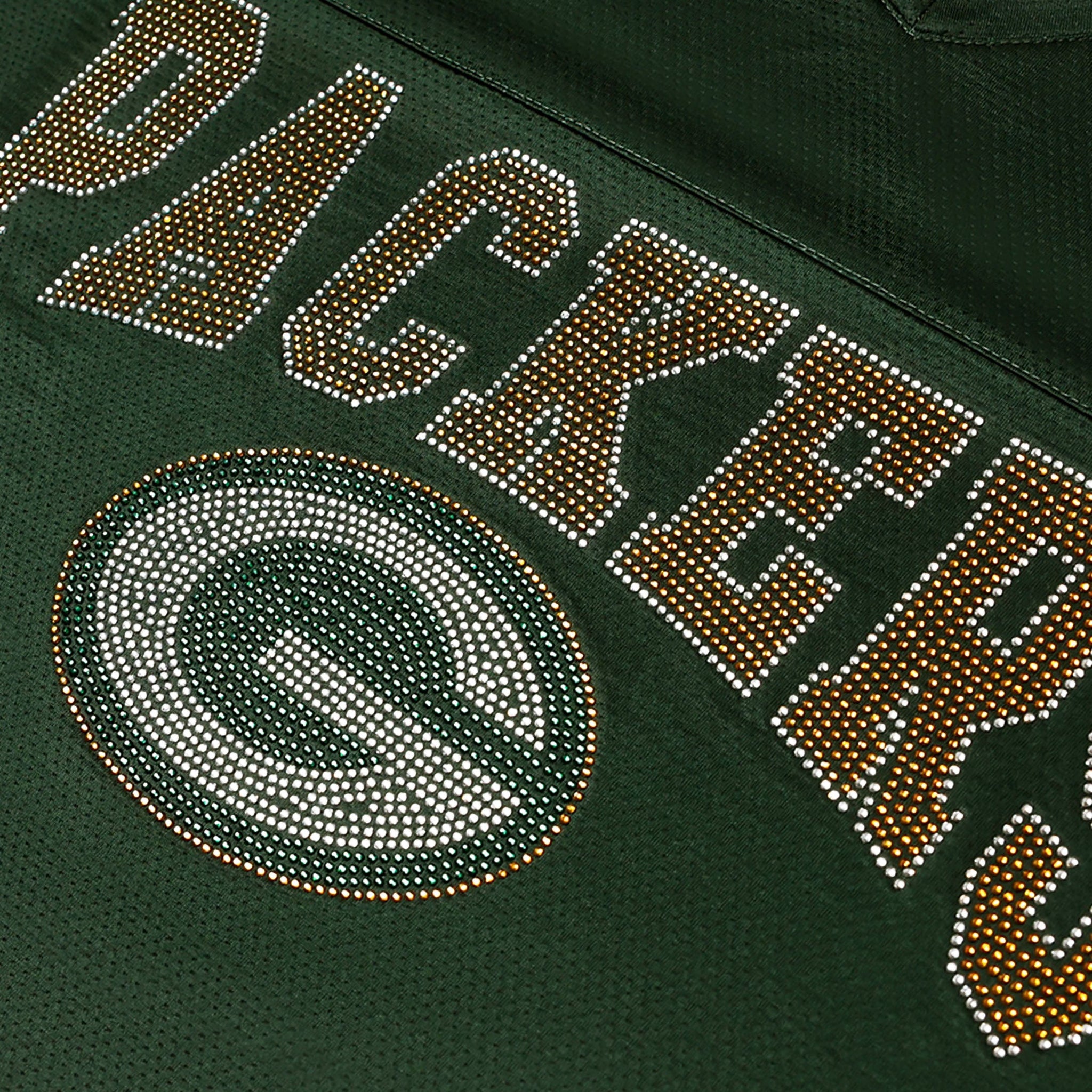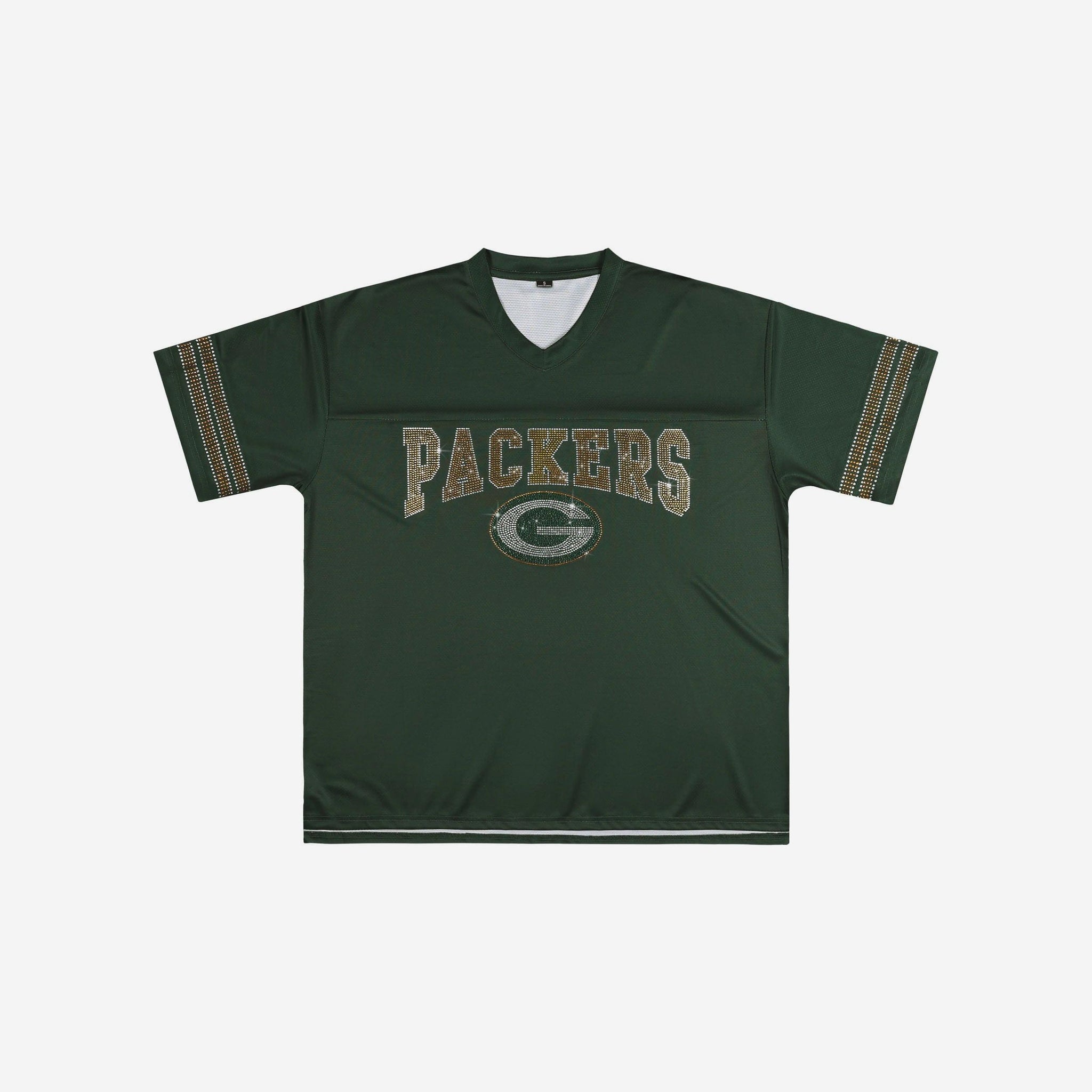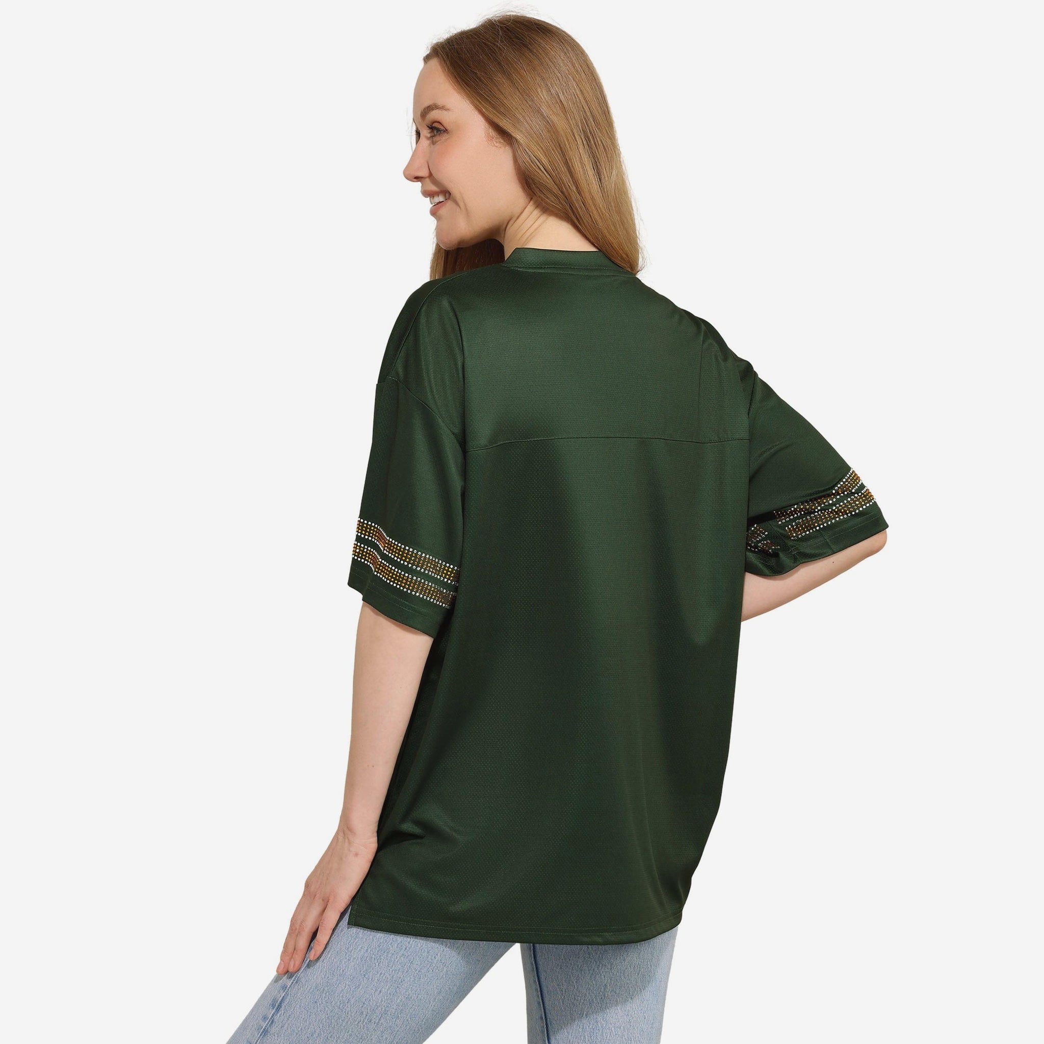 Bring the energy and let your team pride shine. The Green Bay Packers Womens Rhinestone Logo Oversized V-Neck Mesh T-Shirt is built for fans who want to stand out while staying comfortable. With a breathable jersey mesh build, bold rhinestone team graphics, and a relaxed oversized fit, this tee is ready for game day, gym sessions, or just repping your squad on the go.