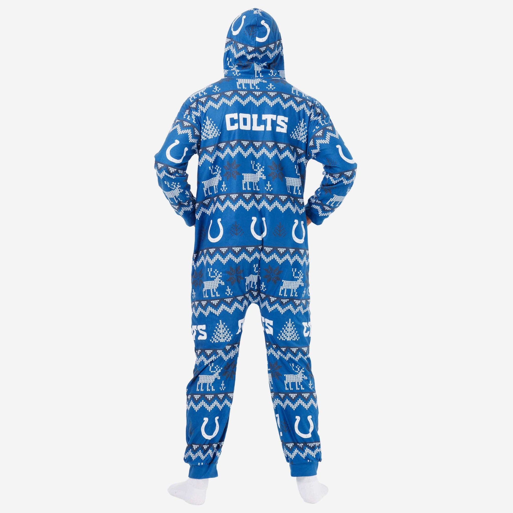 Get some matching family pajamas and dress to impress this holiday season! You won't want to miss these onesie team pajamas! These men's and women's PJ's are comfortable and show off your team spirit in the form of some sweet one piece jammies. Introducing the Indianapolis Colts Ugly Pattern One Piece Pajamas! Don't forget to take your holiday photo with the whole family wearing matching Christmas pajamas!