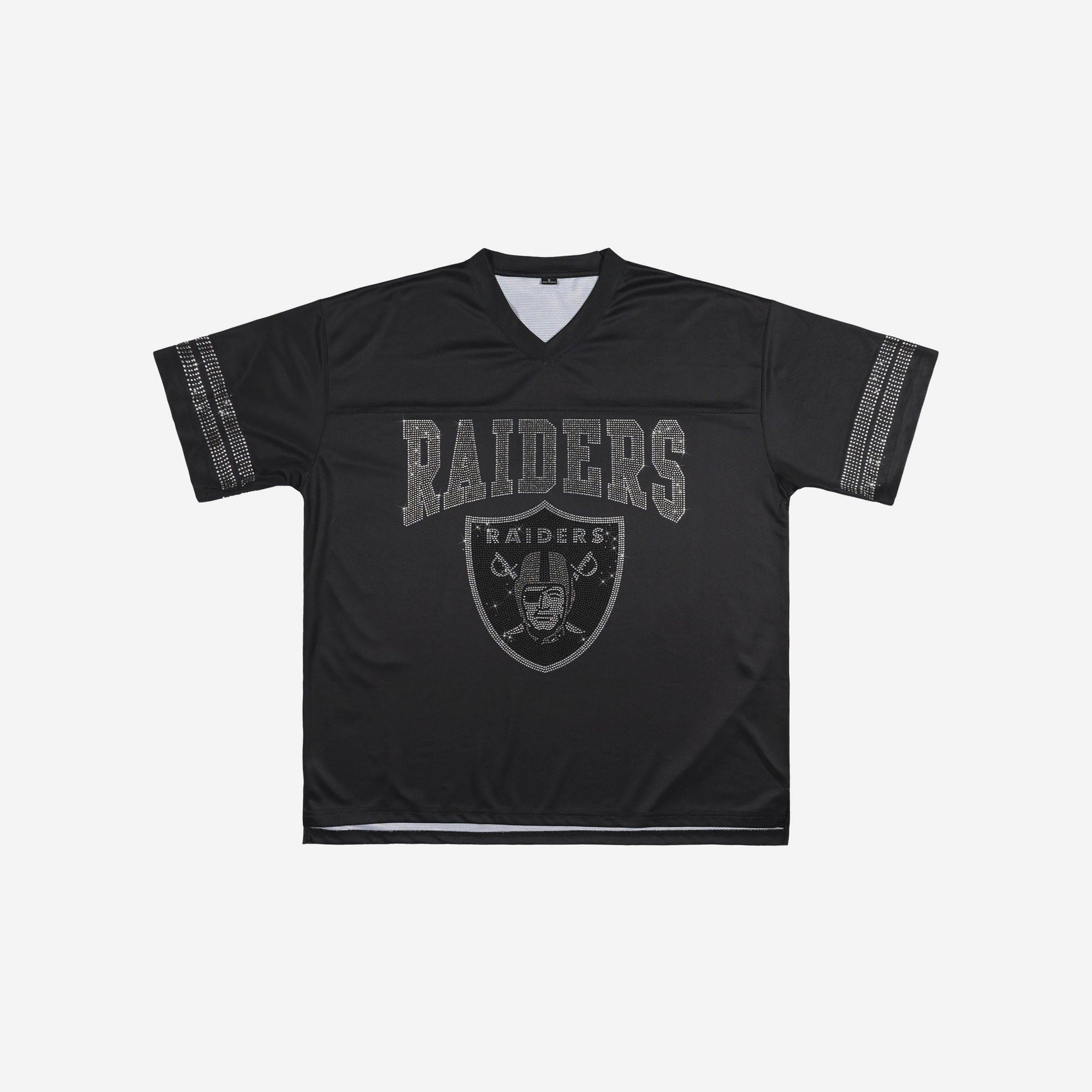 Bring the energy and let your team pride shine. The Las Vegas Raiders Womens Rhinestone Logo Oversized V-Neck Mesh T-Shirt is built for fans who want to stand out while staying comfortable. With a breathable jersey mesh build, bold rhinestone team graphics, and a relaxed oversized fit, this tee is ready for game day, gym sessions, or just repping your squad on the go.
