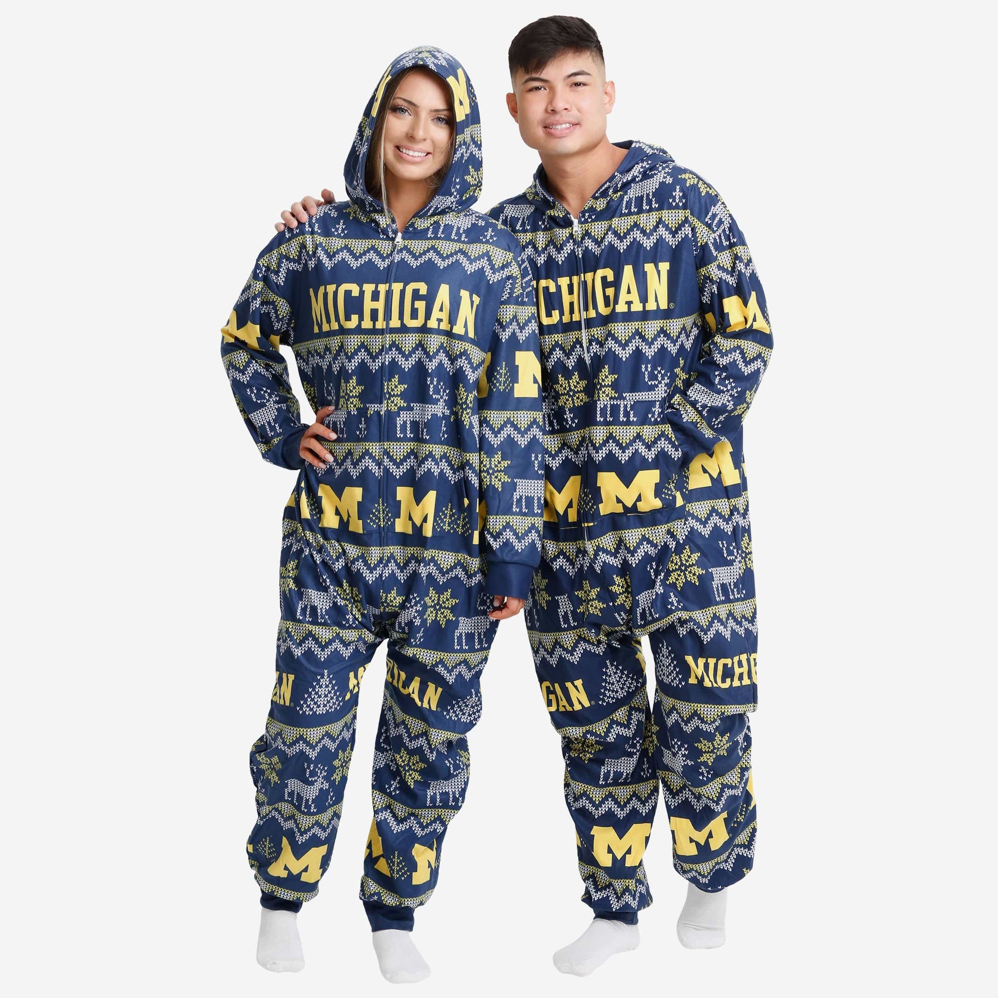 Get some matching family pajamas and dress to impress this holiday season! You won't want to miss these onesie team pajamas! These men's and women's PJ's are comfortable and show off your team spirit in the form of some sweet one piece jammies. Introducing the Michigan Wolverines Ugly Pattern One Piece Pajamas! Don't forget to take your holiday photo with the whole family wearing matching Christmas pajamas!