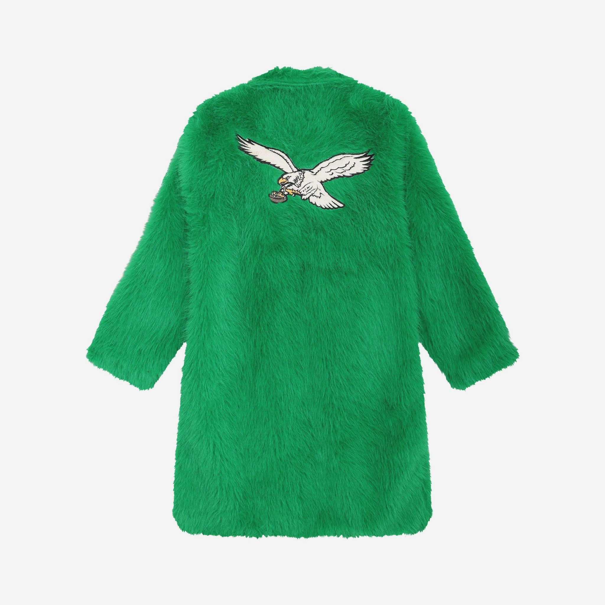 Stay warm, look sharp, and rep your squad with the Philadelphia Eagles Retro Faux Fur Long Jacket. Made from ultra-soft faux fur with an all-over team-colored design and bold embroidered logos, this jacket brings game day glam and cozy comfort together in one statement piece.