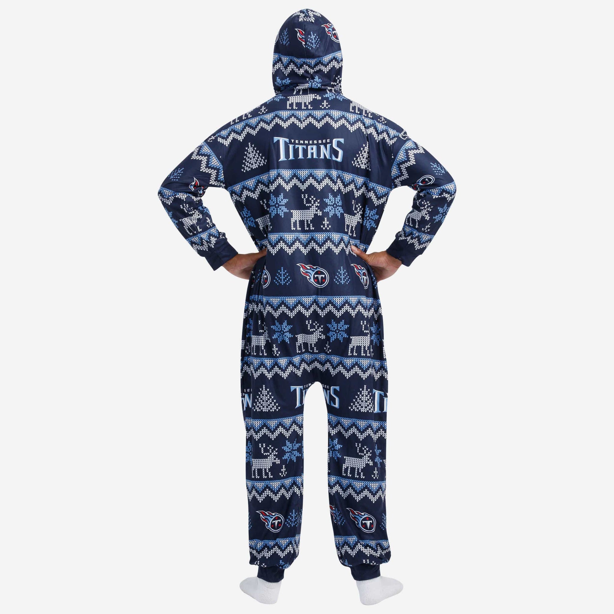 Get some matching family pajamas and dress to impress this holiday season! You won't want to miss these onesie team pajamas! These men's and women's PJ's are comfortable and show off your team spirit in the form of some sweet one piece jammies. Introducing the Tennessee Titans Ugly Pattern One Piece Pajamas! Don't forget to take your holiday photo with the whole family wearing matching Christmas pajamas!