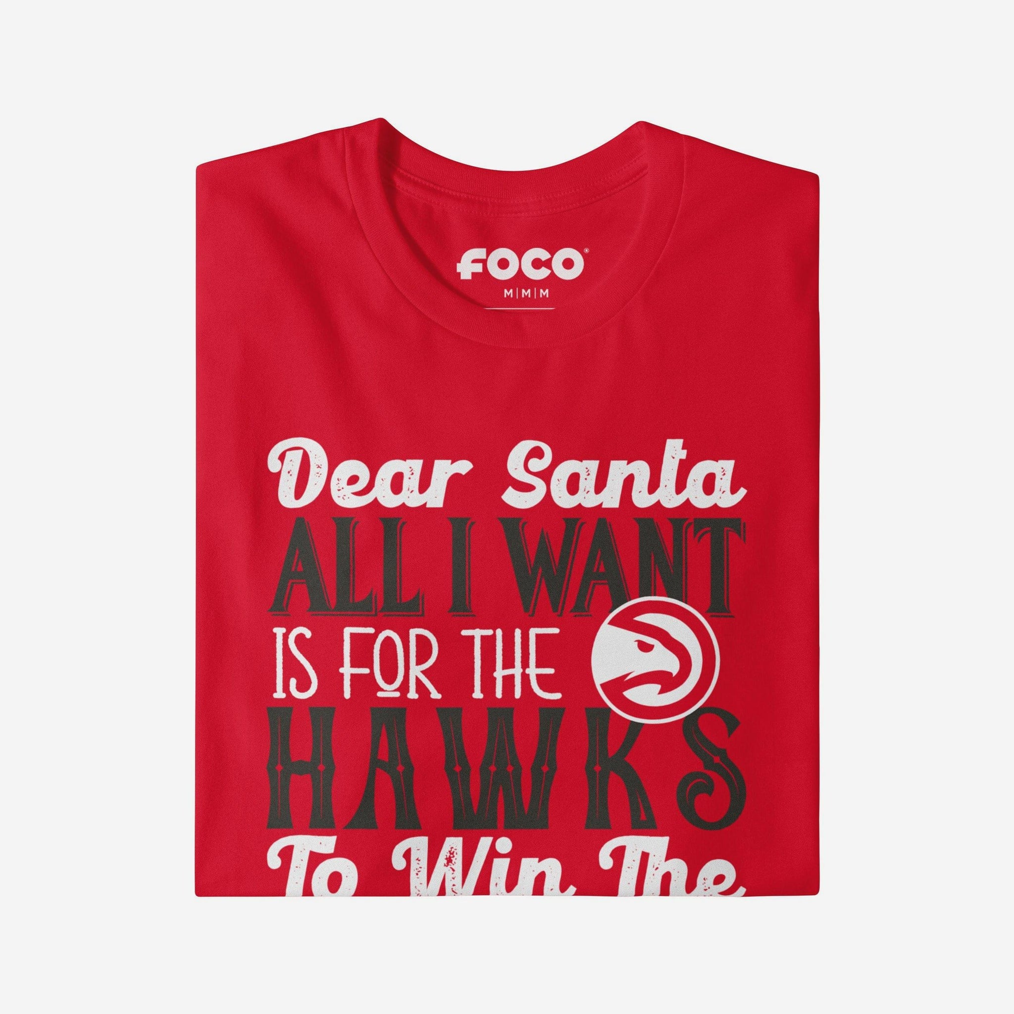• Festive, team-colored design: This traditional t-shirt shows off the official Atlanta Hawks colors in an all-over design with a festive message to Santa, so you can combine your team spirit with holiday spirit.