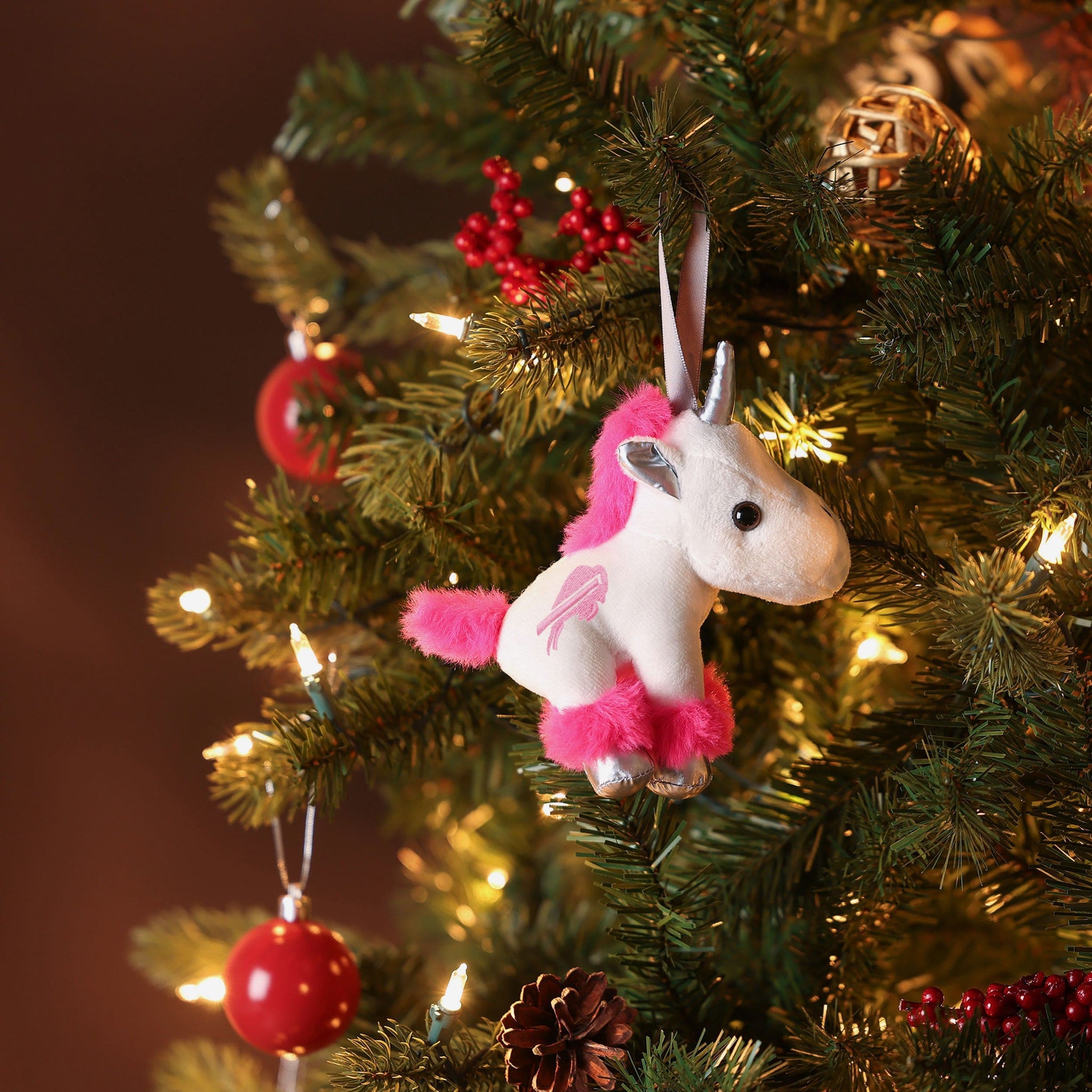 - Plush unicorn ornament with all-over white design and pink and metallic silver accents that will look great on your tree