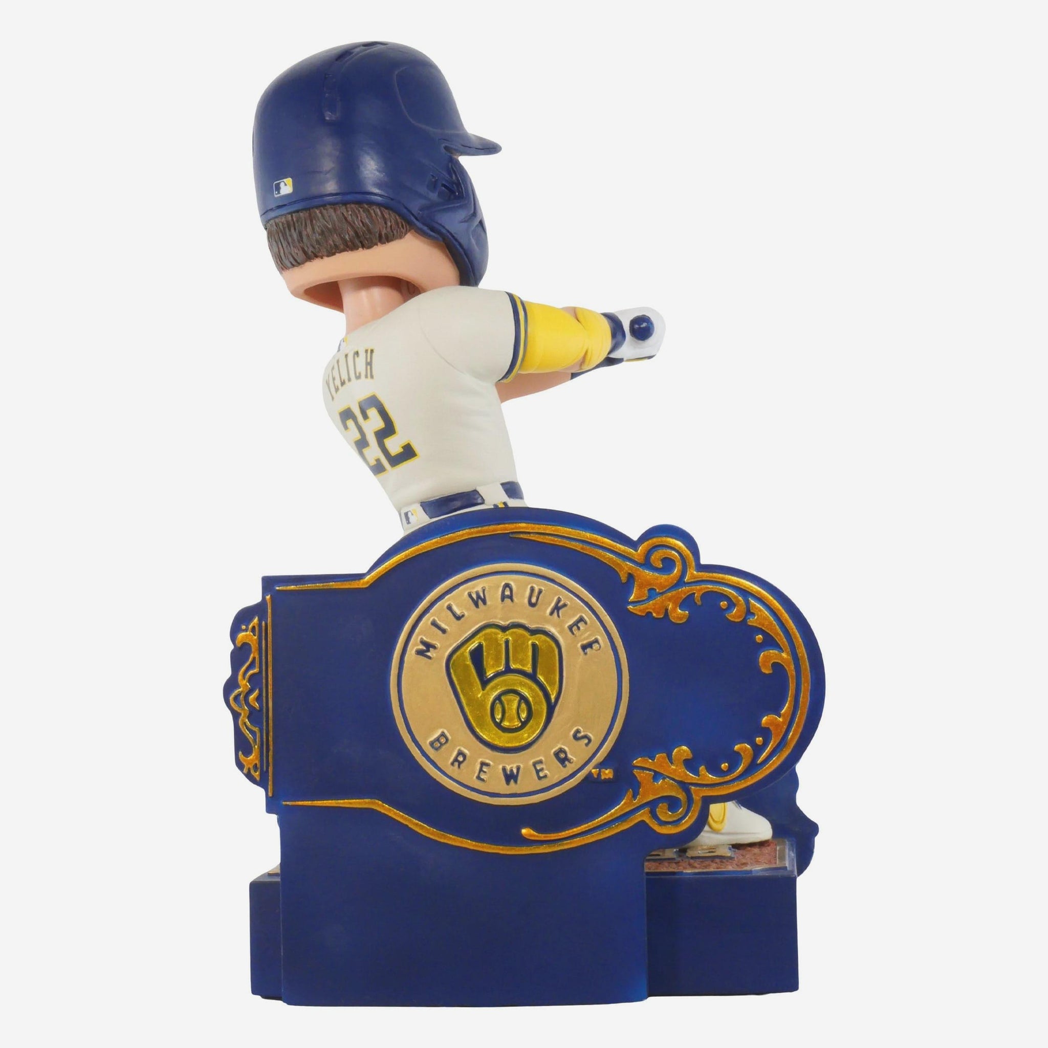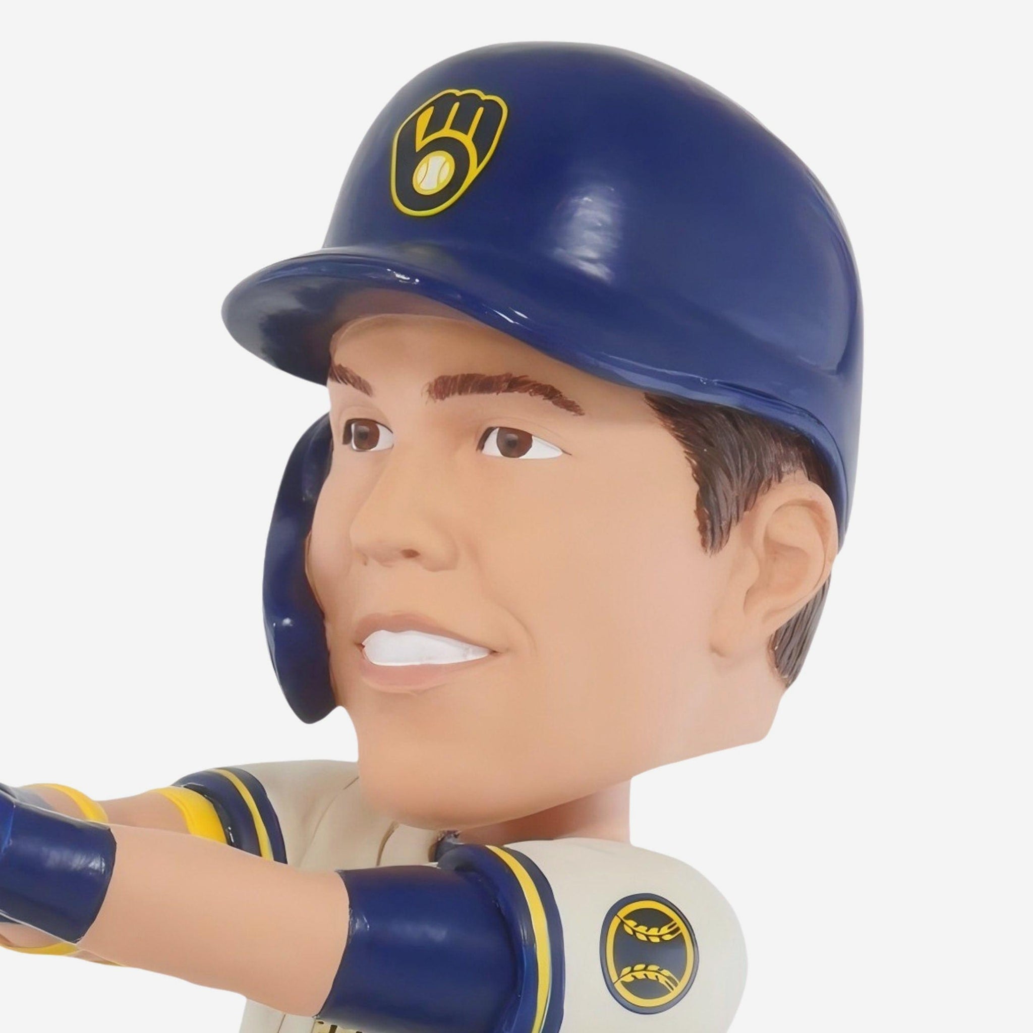 - Portrays Yelich wearing his white gameday uniform in a batting action pose, ready to launch one into the crowd