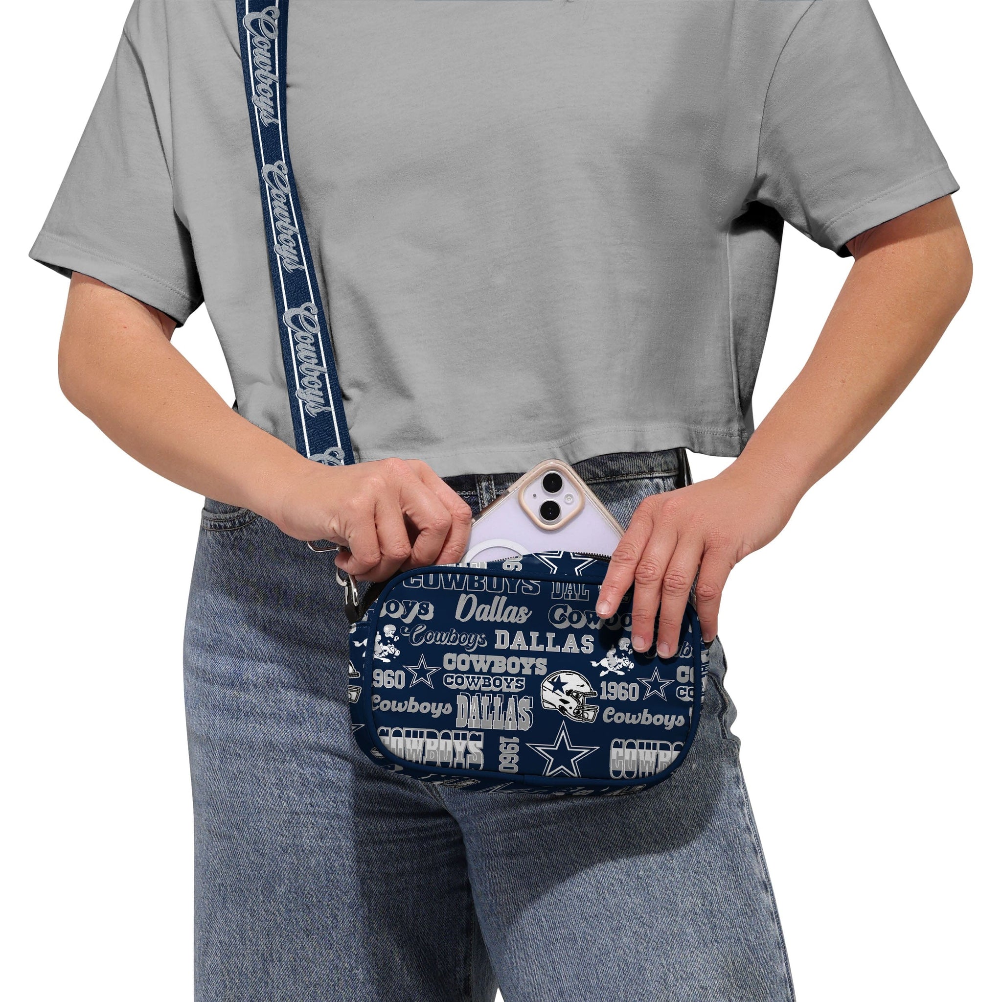 Over your shoulder and off to the game! Vintage vibes meet modern utility with the Dallas Cowboys Repeat Retro Print Nylon Crossbody Bag.