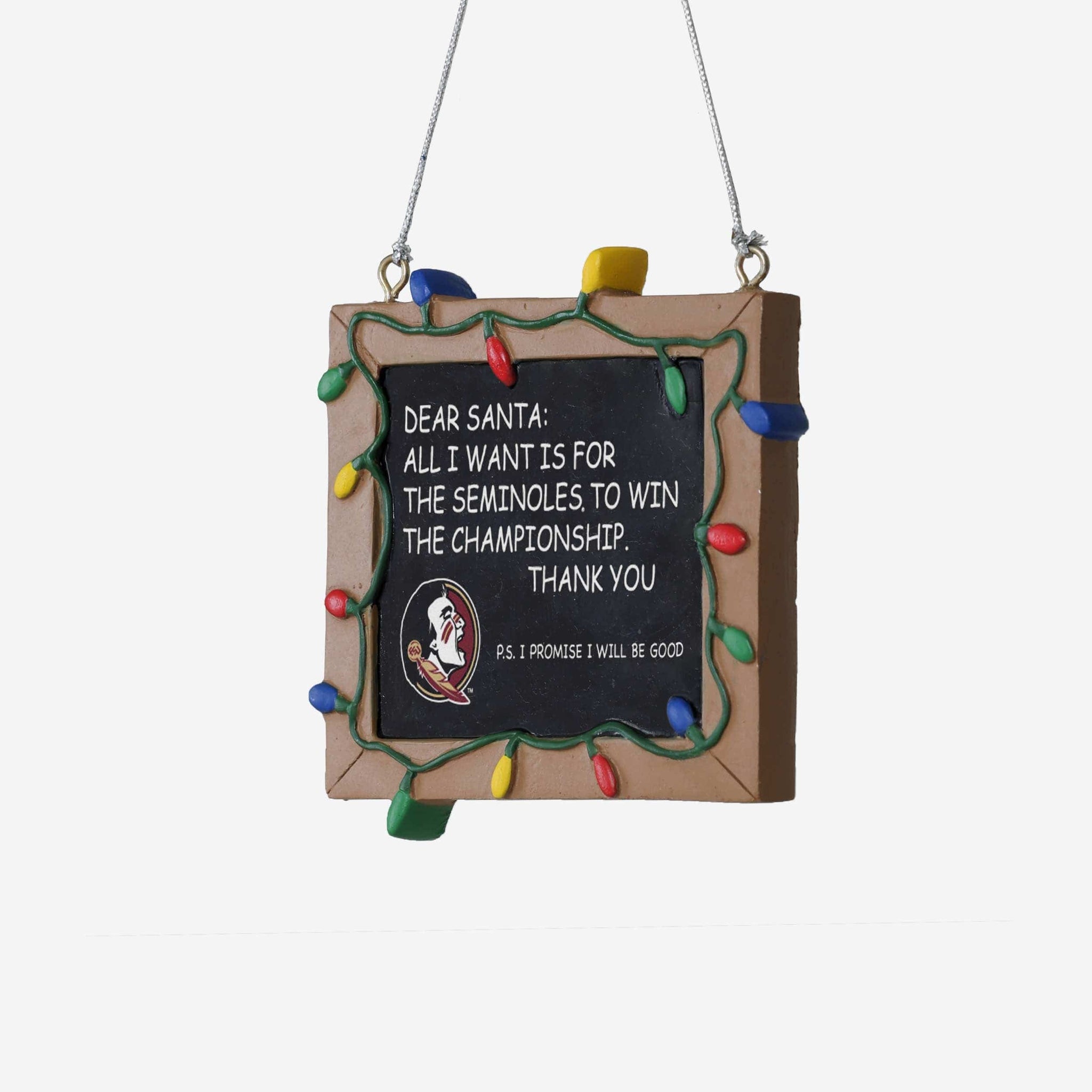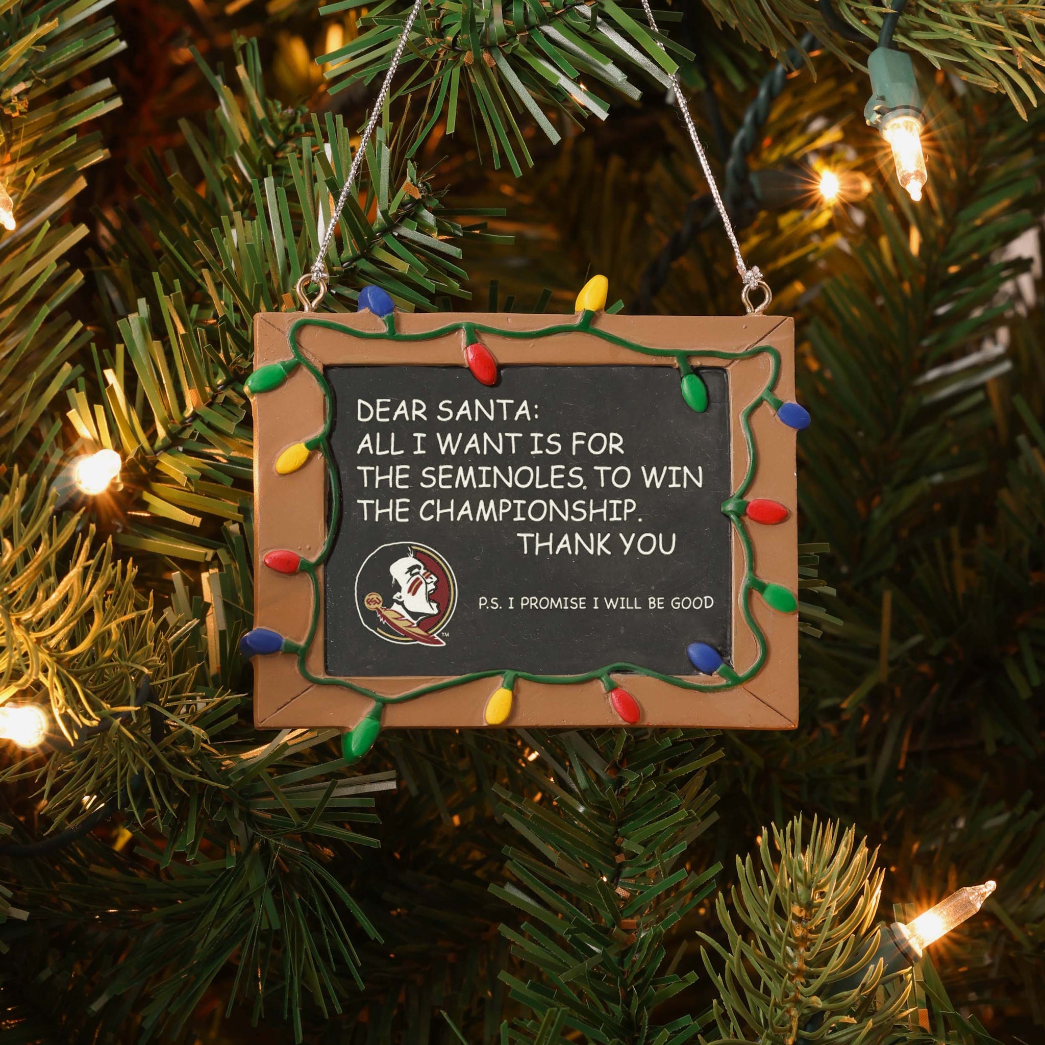 So, you made your list and sent it to jolly ol' Fanta Claus, asking him for a championship. But sometimes letters can get lost in the mail. Just in case, put this Florida State Seminoles Resin Chalkboard Sign Ornament on your tree to let him know how good you've been this year, and that all you want for the holidays is a trophy.