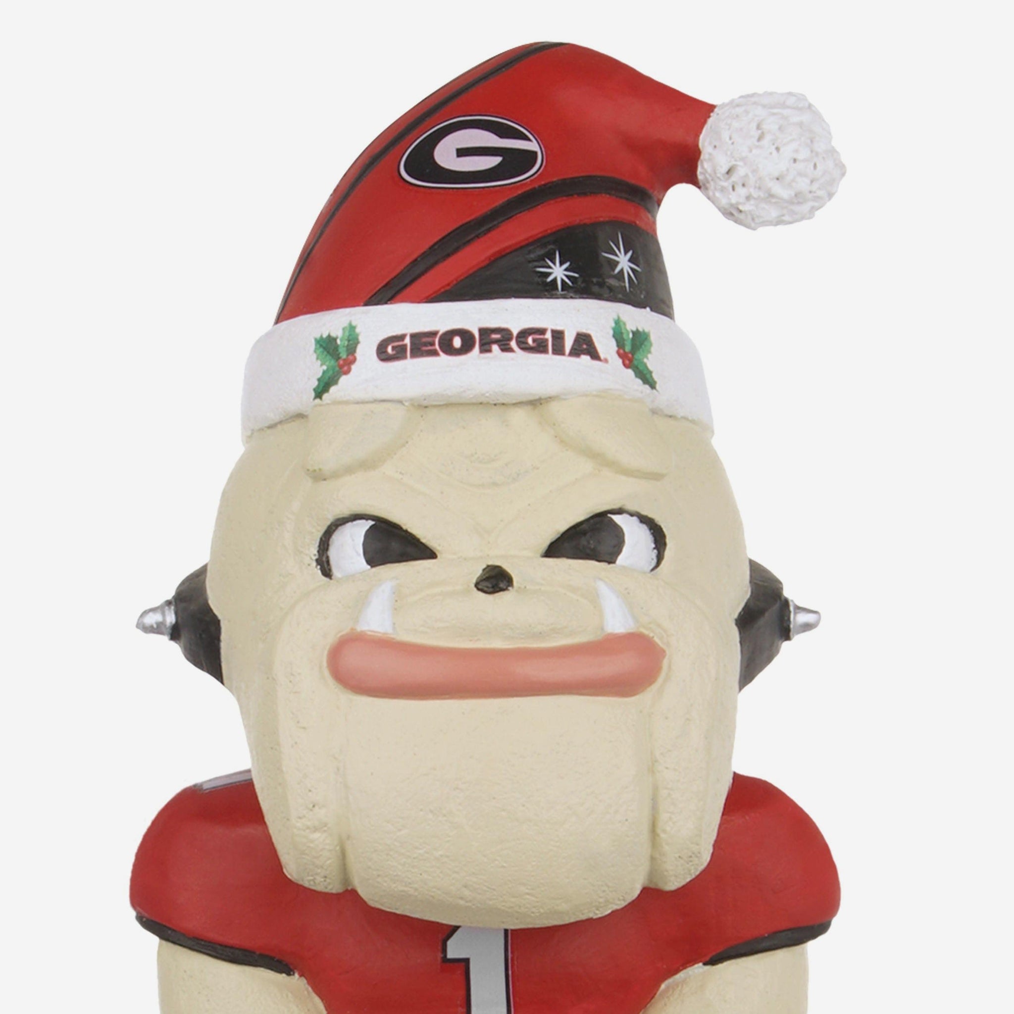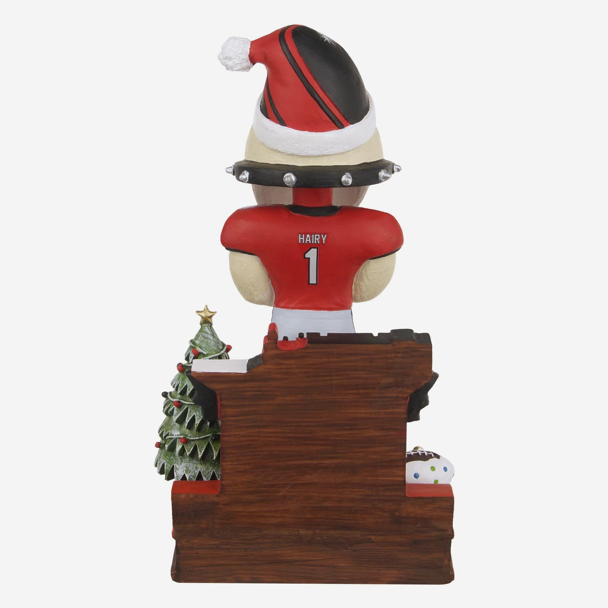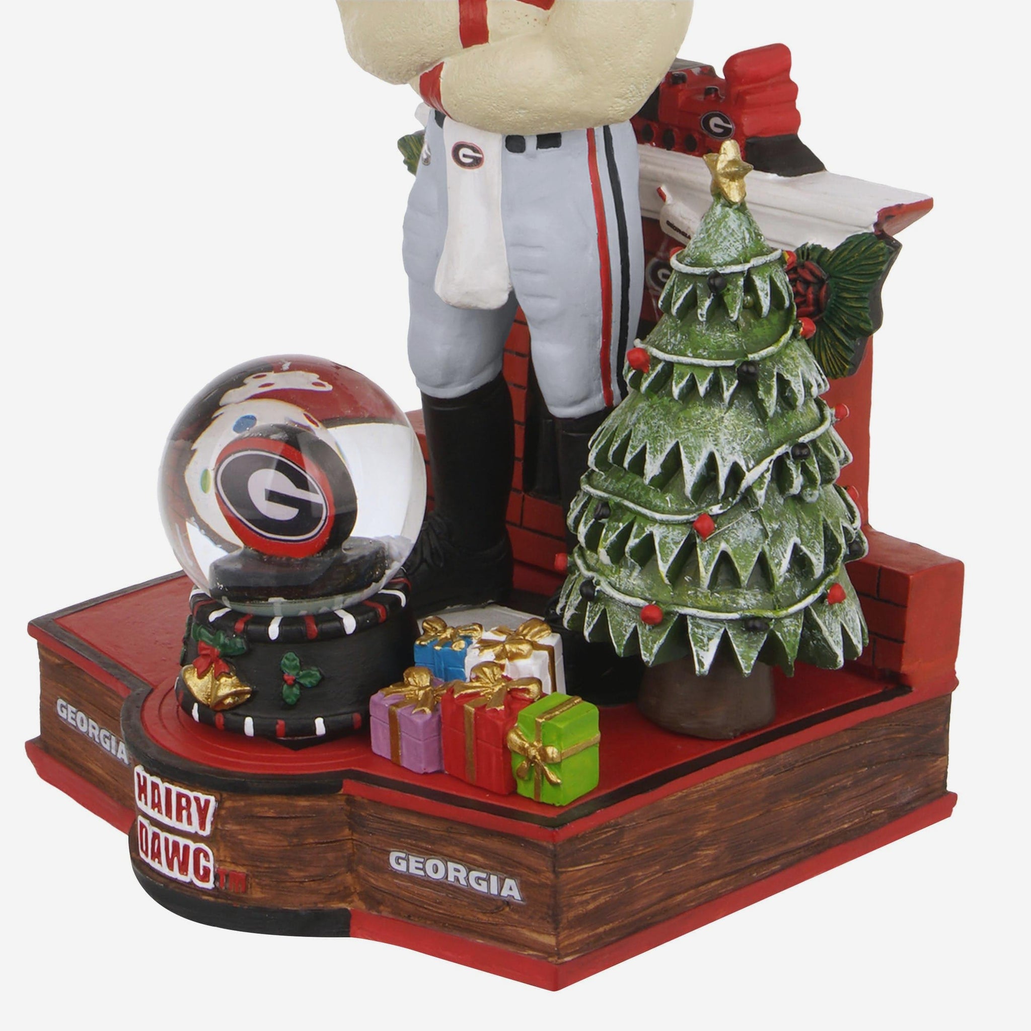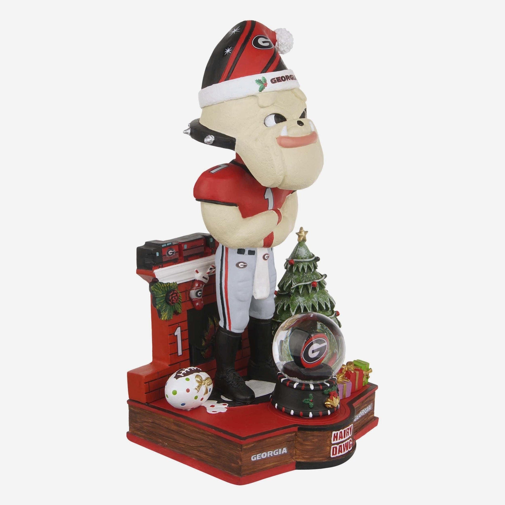 - Portrays Hairy Dawg wearing his gameday uniform and wearing a santa hat standing in front of a detailed snow globe centerpiece for a festive, heartwarming scene