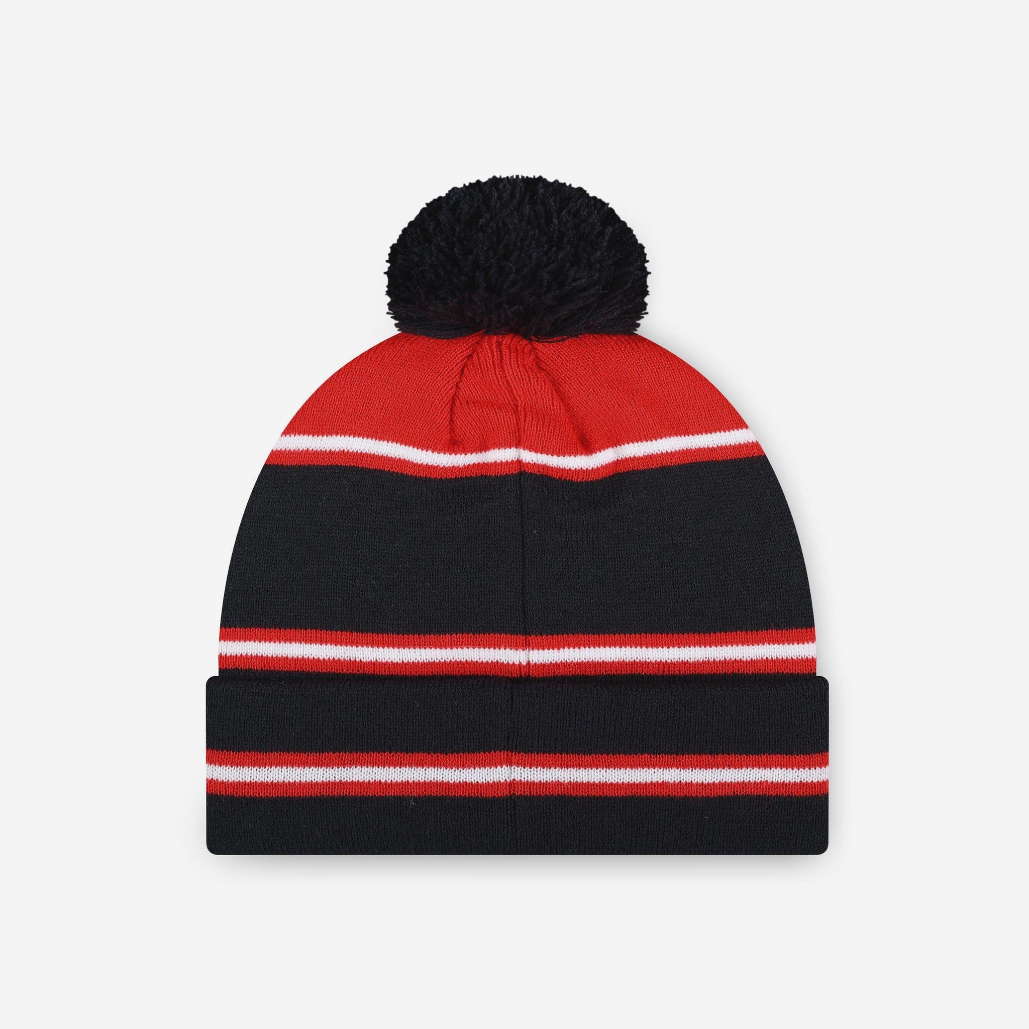 This beanie features bold team-colored stripes, a prominent team wordmark, and a front-facing team logo, built to showcase your fandom from every angle. The one-time removable pom adds a playful twist to your winter wardrobe, while the 100% knit acrylic construction ensures cozy comfort all season long. Whether you're tailgating, cheering from the stands, or just running errands, this beanie is your go-to for warmth, style, and team pride.