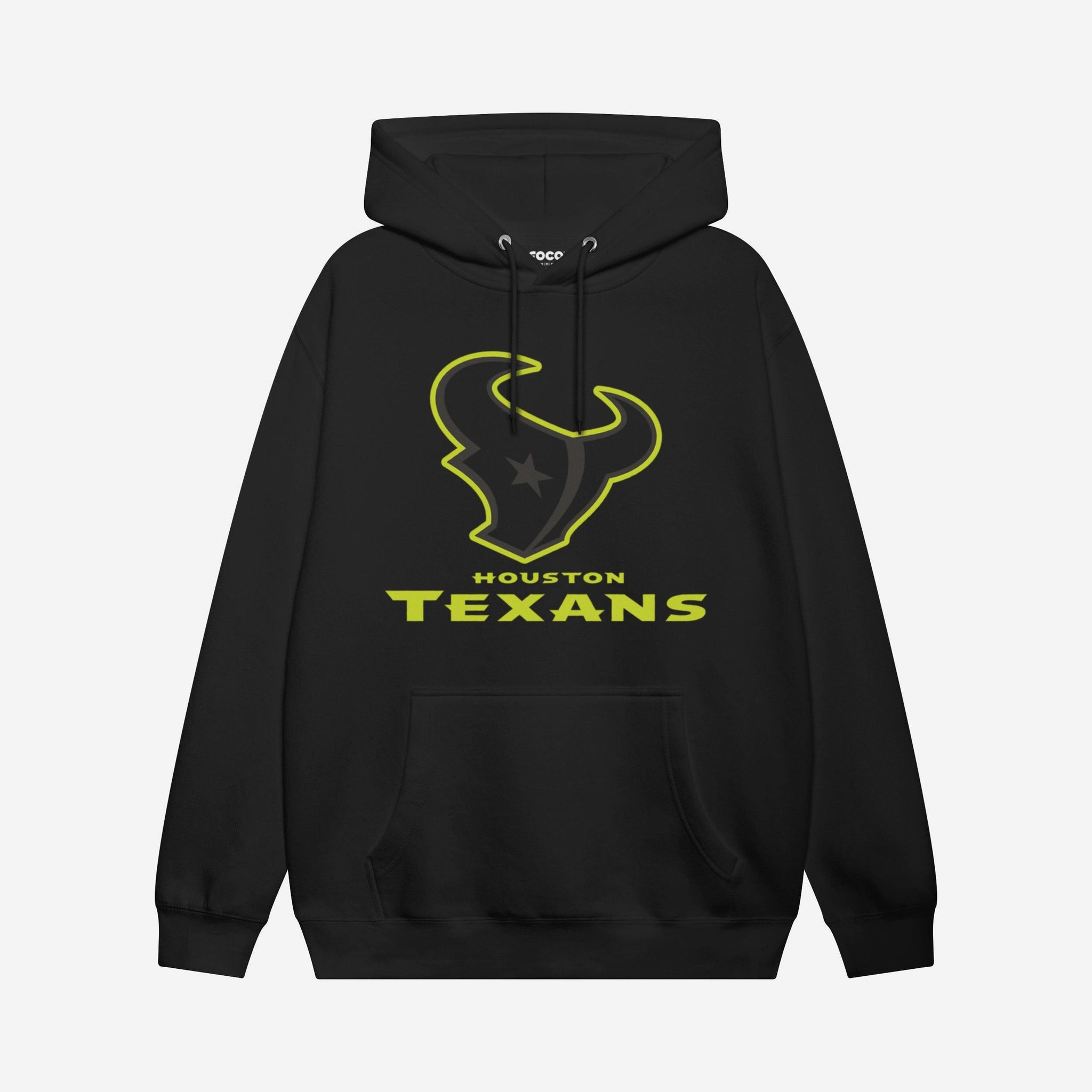 - Team logo display with highlight outline: The front of this apparel features a black Houston Texans team logo display outlined in neon, and a neon team name display