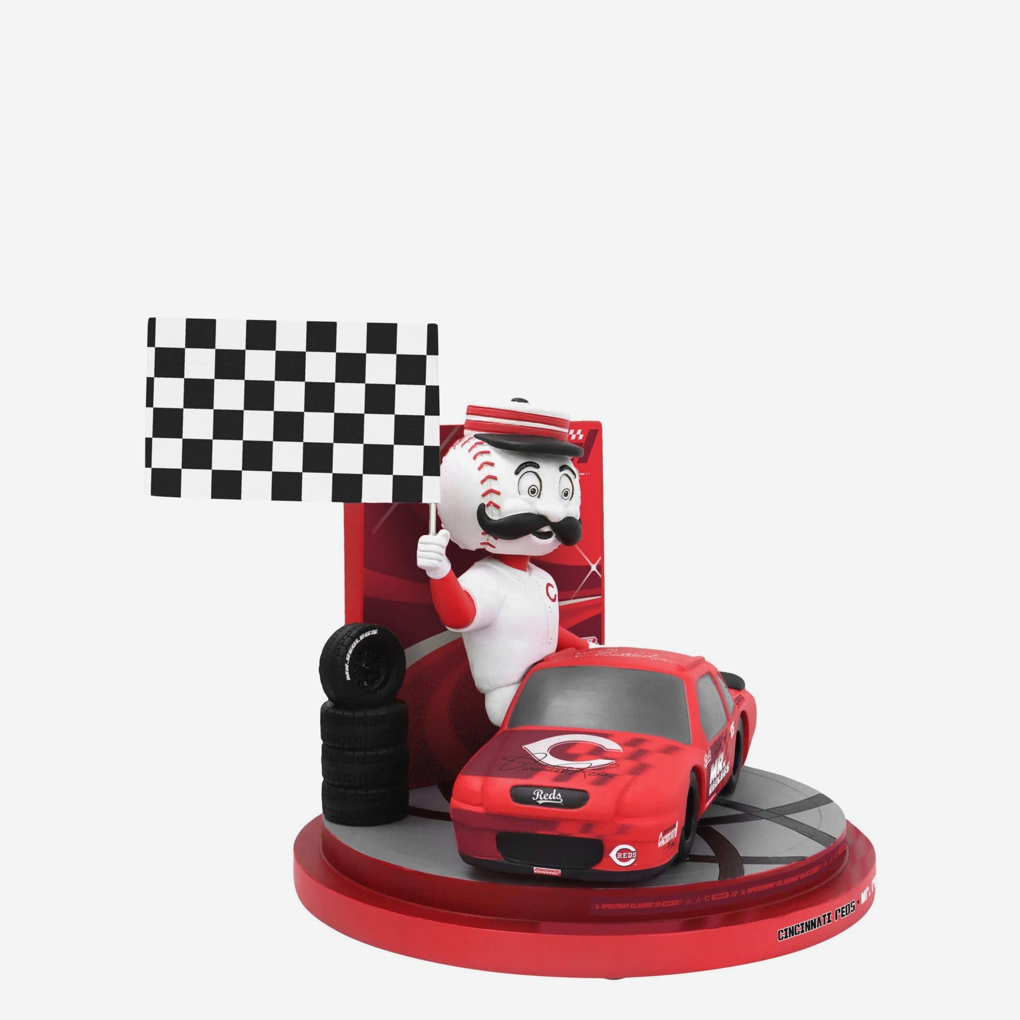 • Portrays Mr. Red wearing his gameday uniform, riding in a classic team-colored car, and holding a checkered flag, ready to speed around the bases and into your fancave