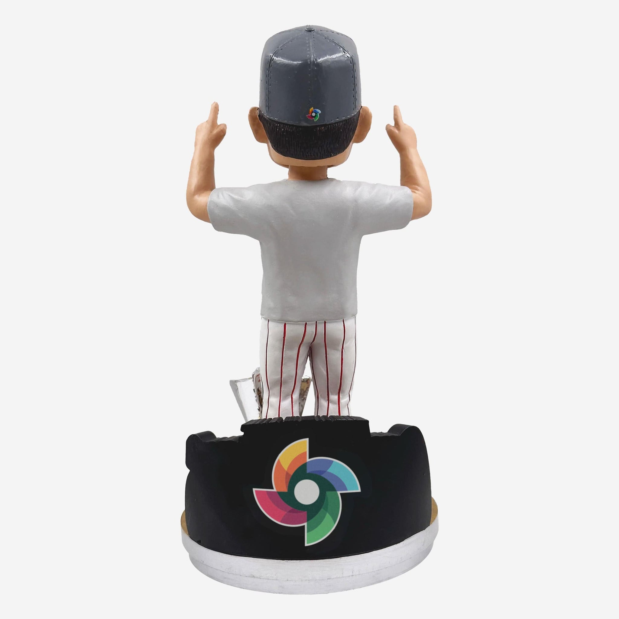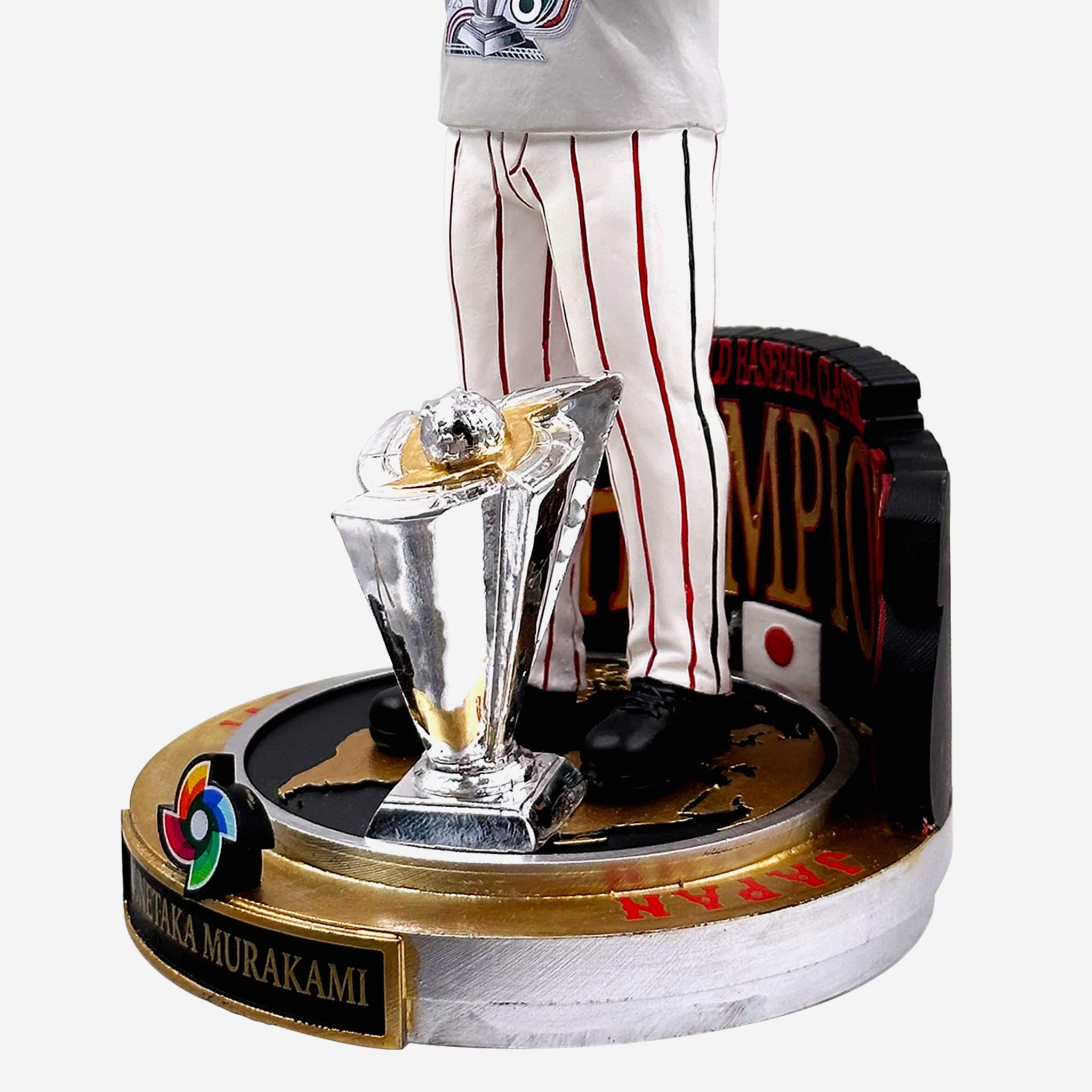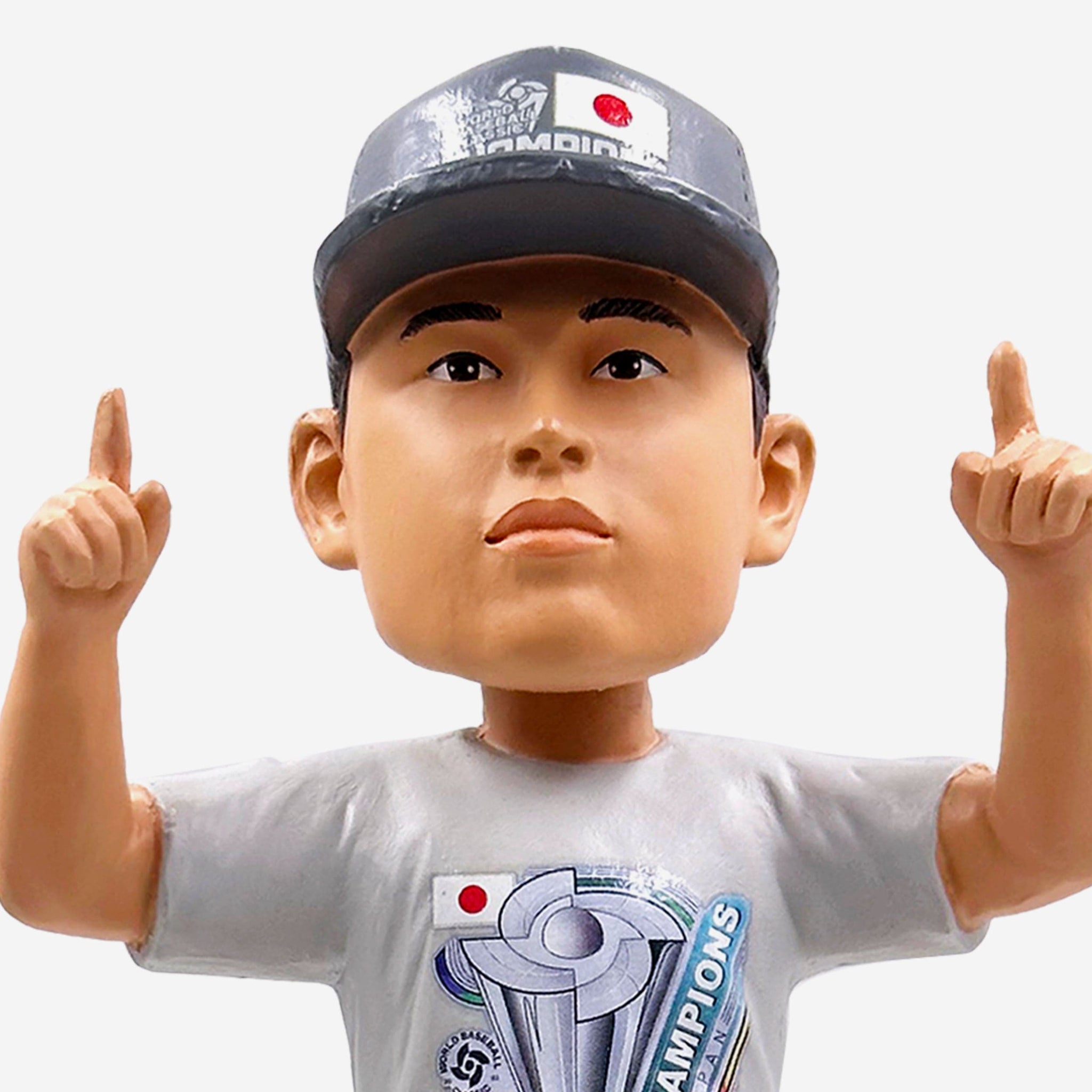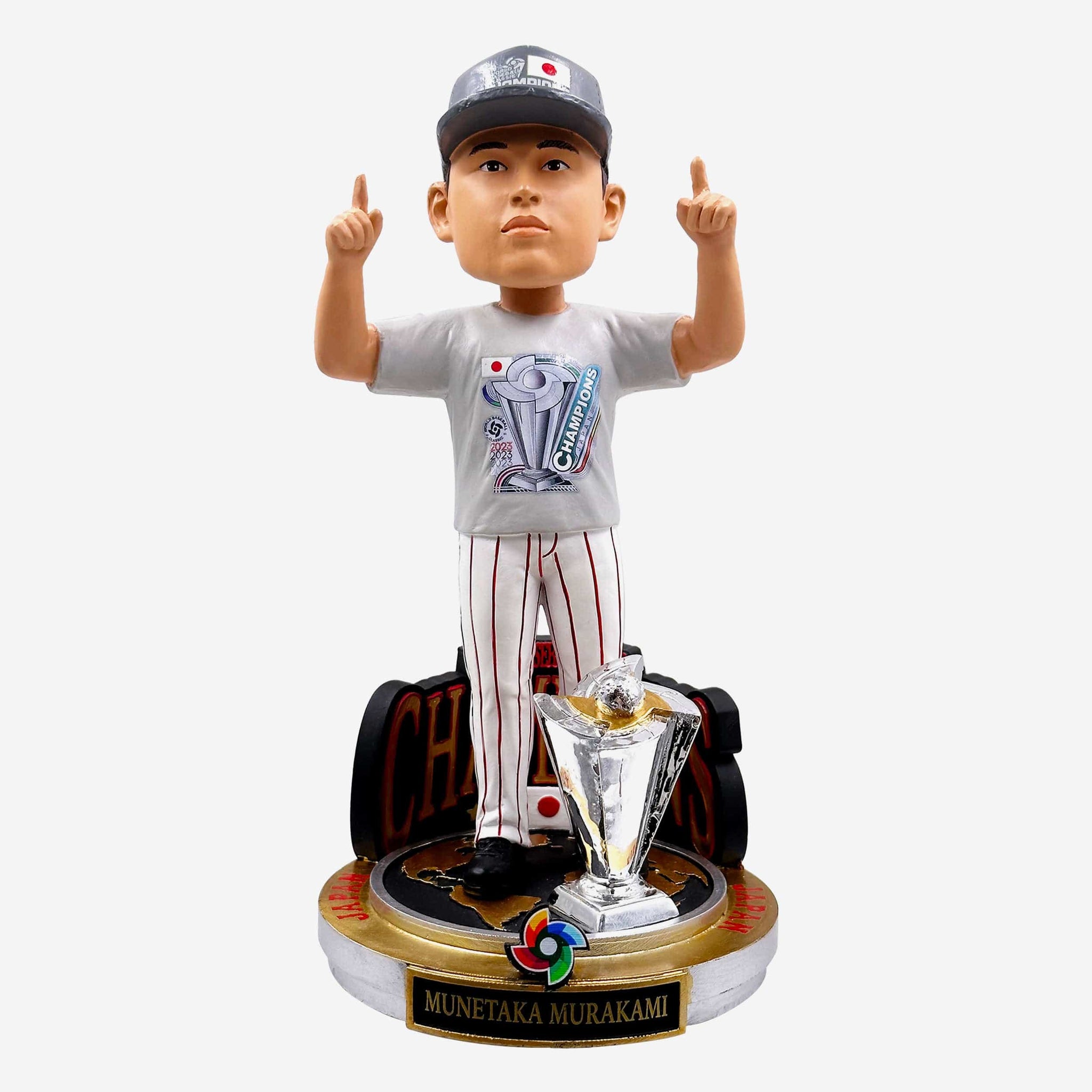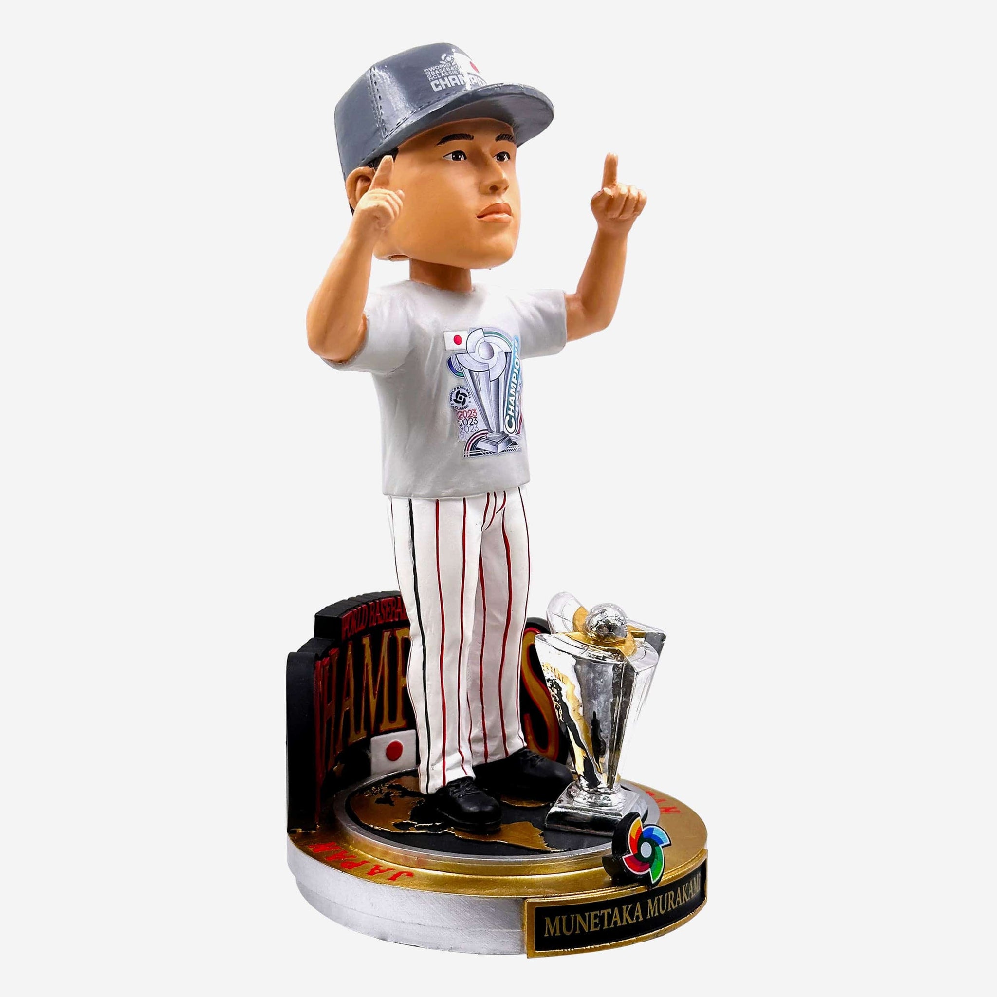 Ready to get this celebration started? This superstar has donned his championship gear and is ready to bring the party to you with this Munetaka Murakami Japan 2023 World Baseball Classic Champions Cap & Tee Bobblehead.