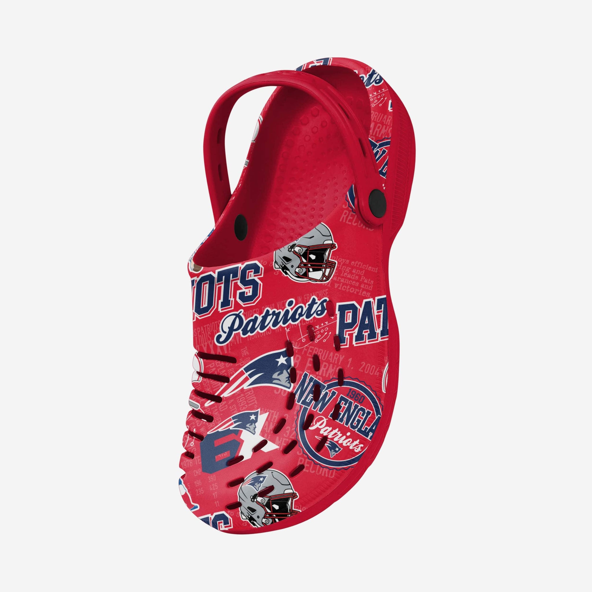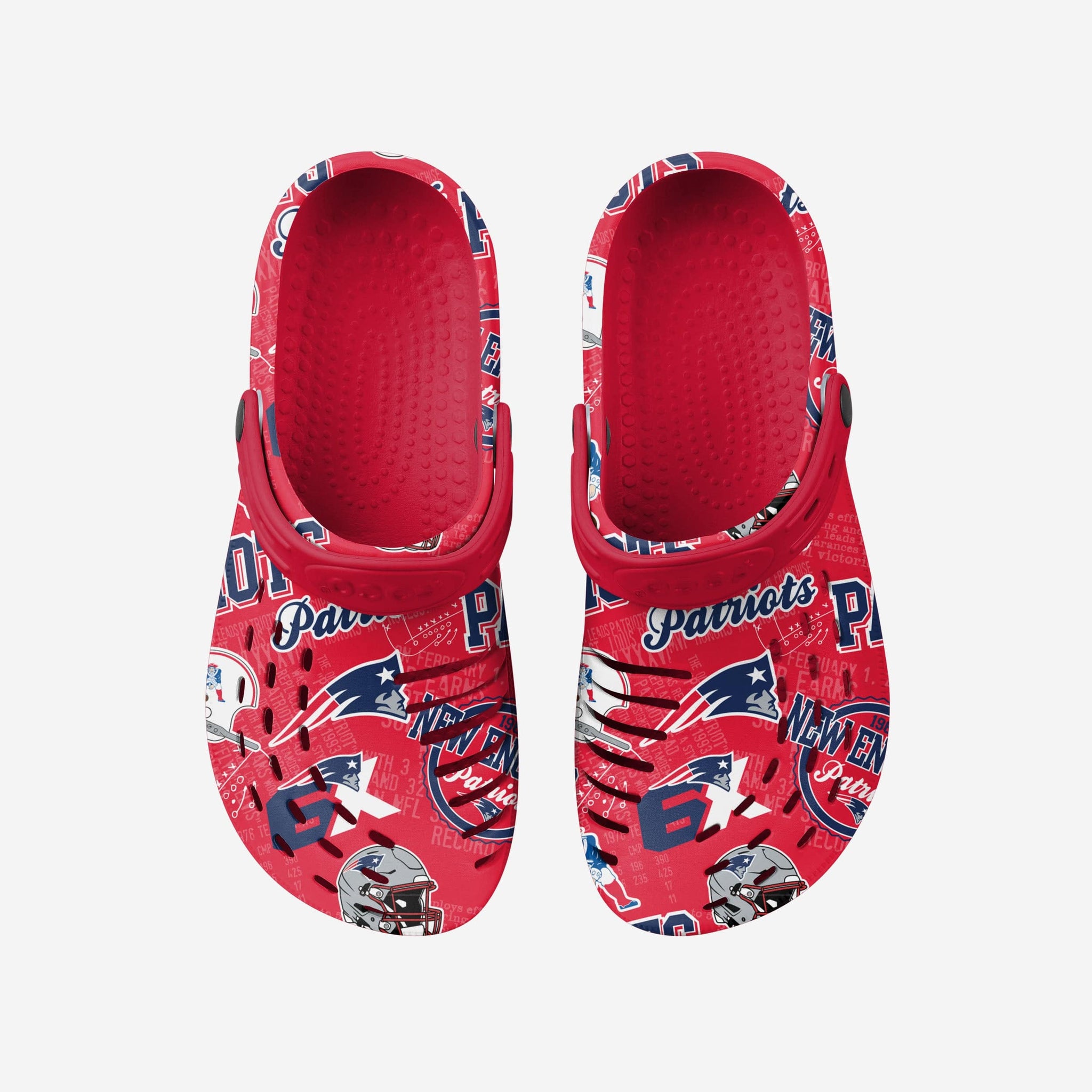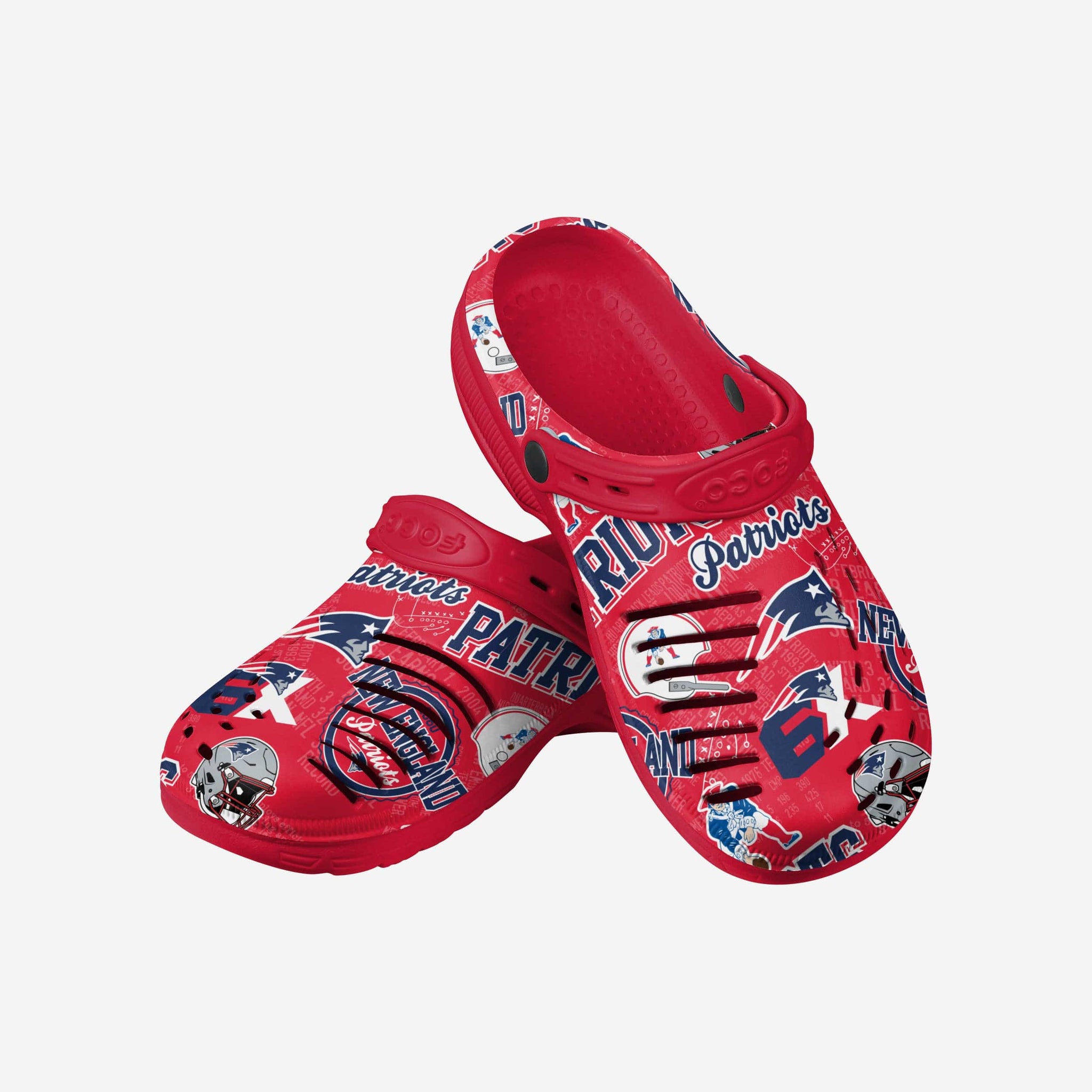 The New England Patriots Historic Print Clogs with Straps are here to help you take a step into the time machine and celebrate your franchise's glorious history.