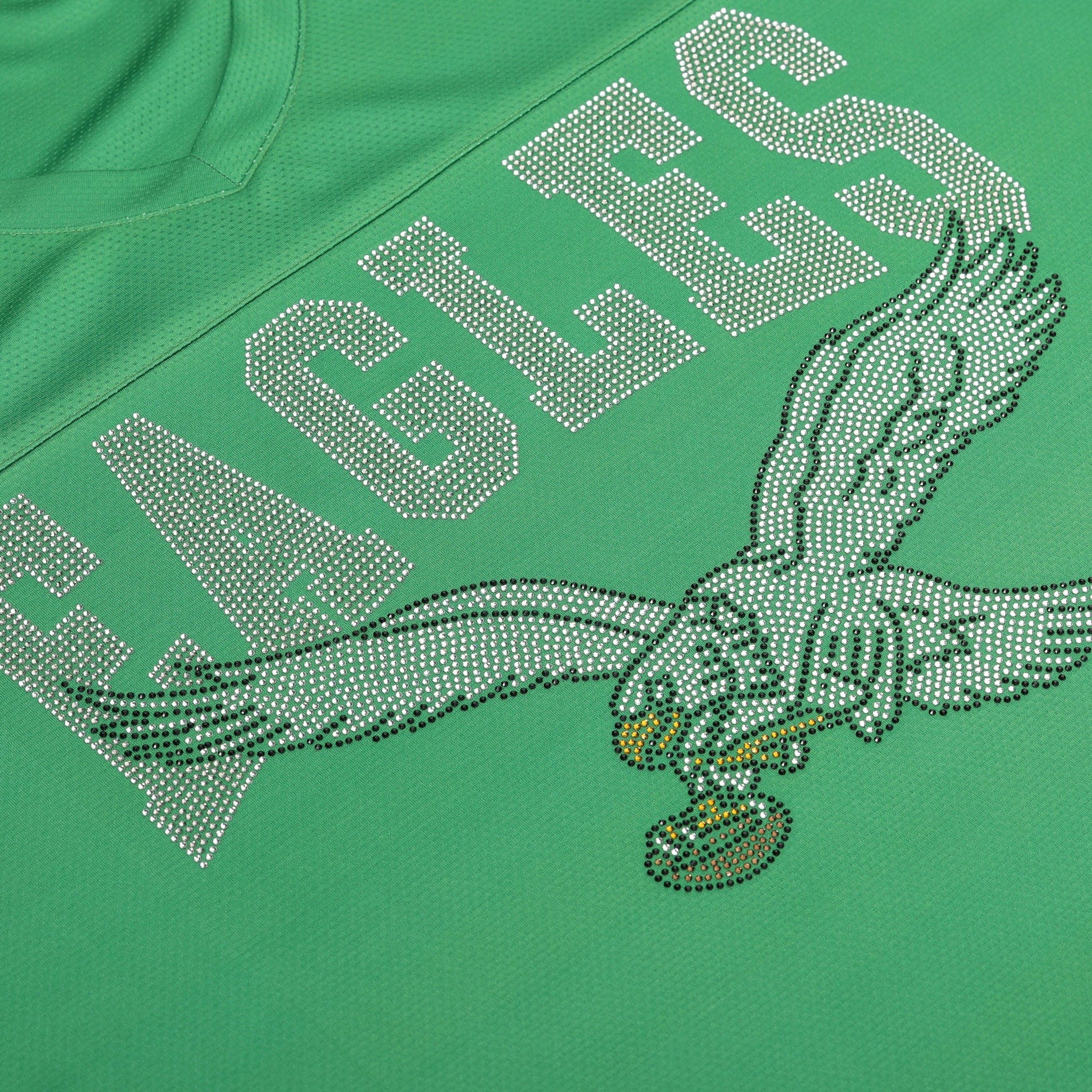 Philadelphia Eagles Womens Kelly Green Rhinestone Logo Oversized V-Neck Mesh T-Shirt