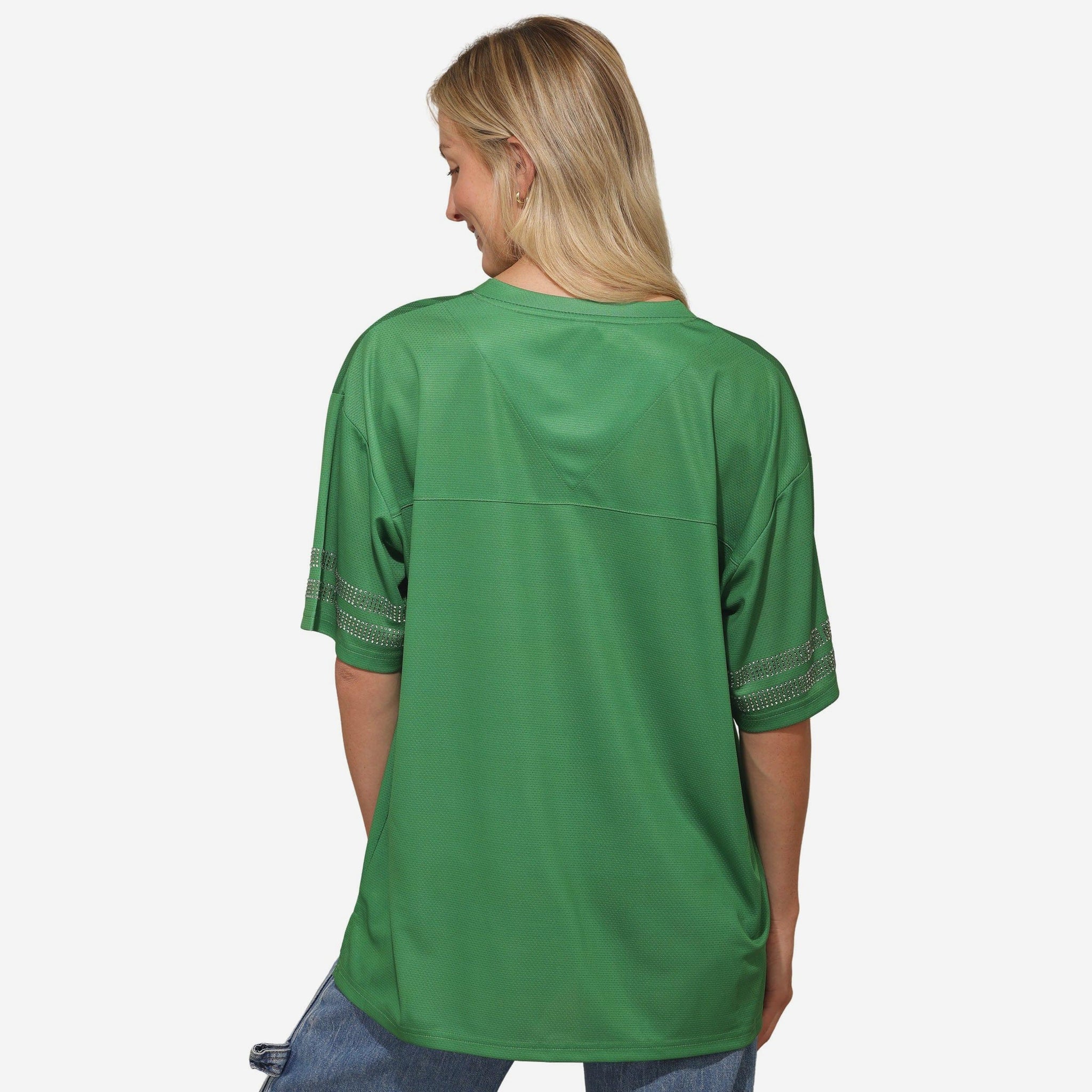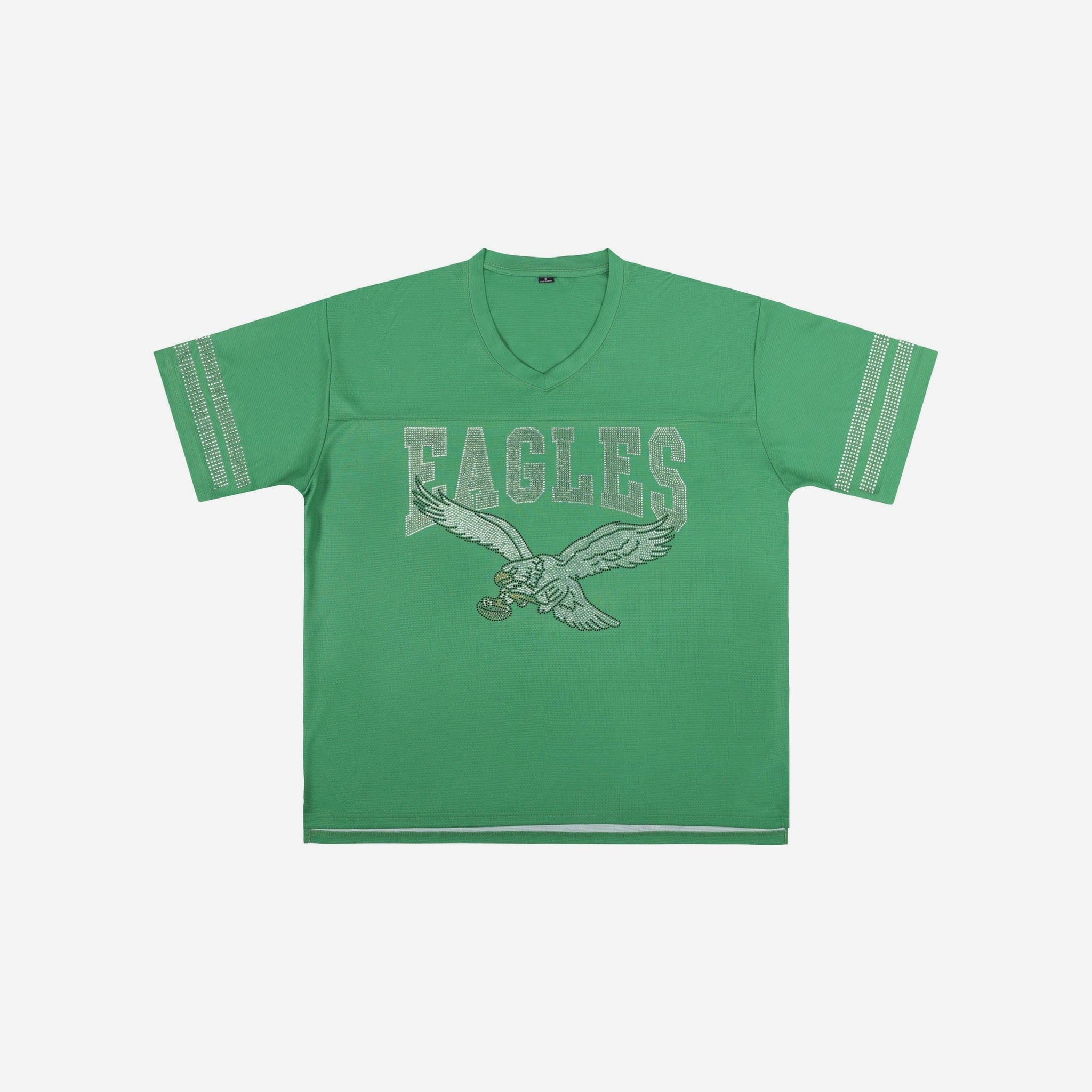 Bring the energy and let your team pride shine. The Philadelphia Eagles Womens Kelly Green Rhinestone Logo Oversized V-Neck Mesh T-Shirt is built for fans who want to stand out while staying comfortable. With a breathable jersey mesh build, bold rhinestone team graphics, and a relaxed oversized fit, this tee is ready for game day, gym sessions, or just repping your squad on the go.