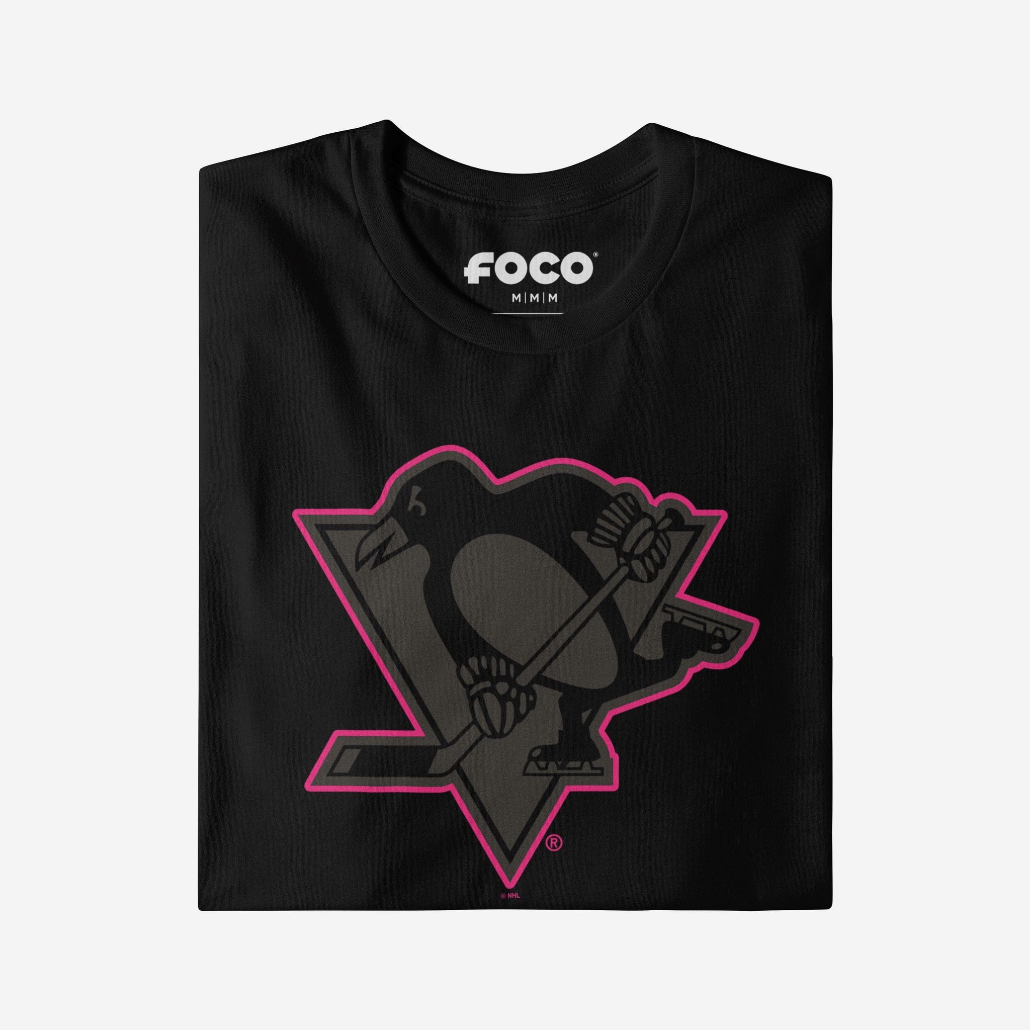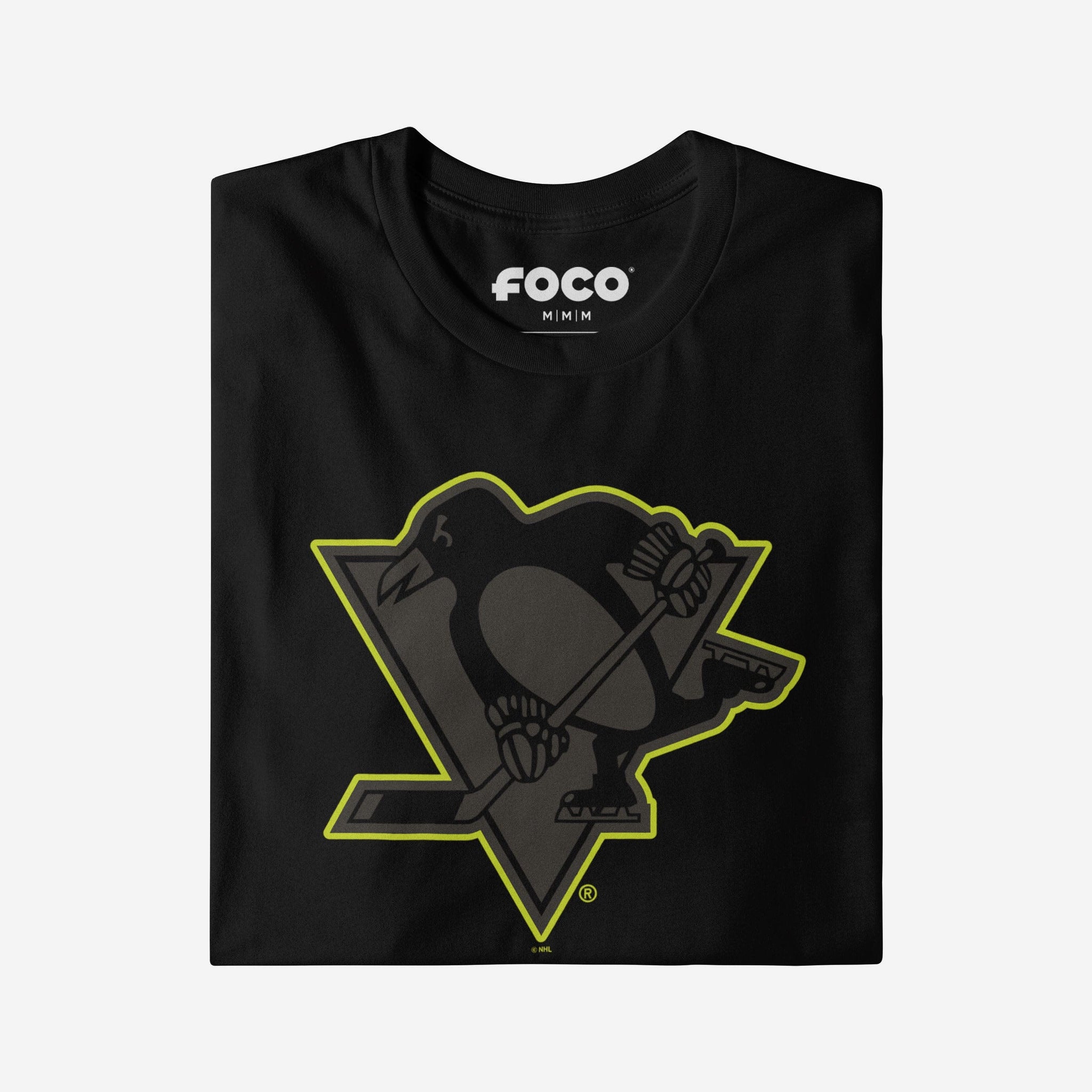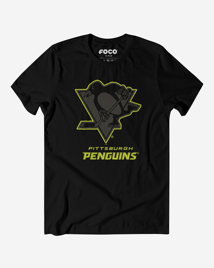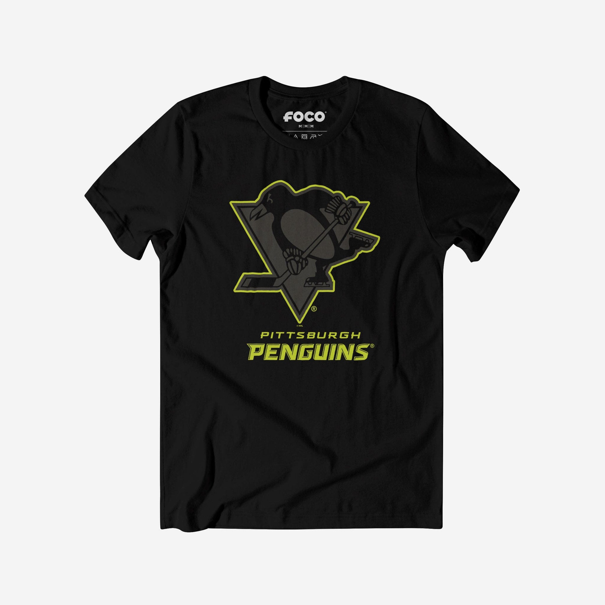 - Team logo display with highlight outline: The front of this apparel features a black Pittsburgh Penguins team logo display outlined in neon, and a neon wordmark team name display